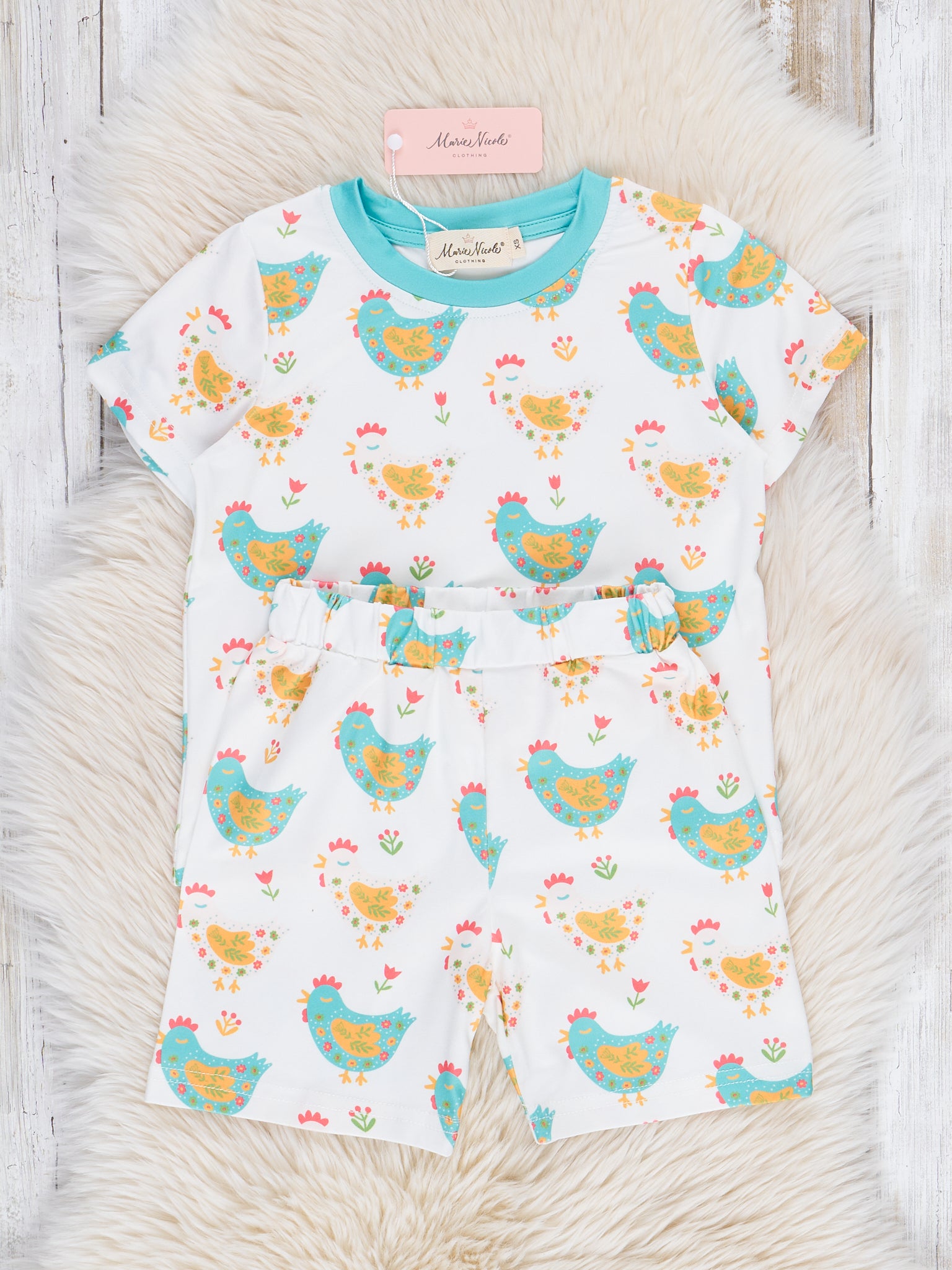 Get ready to snuggle up in these cute and fun Chicken Pajamas! Featuring turquoise trim with a charming chicken pattern, you'll look and feel like a cozy little chick. Perfect for sleeping or lounging, these pajamas by Marie Nicole Clothing are a must-have for any animal lover.
