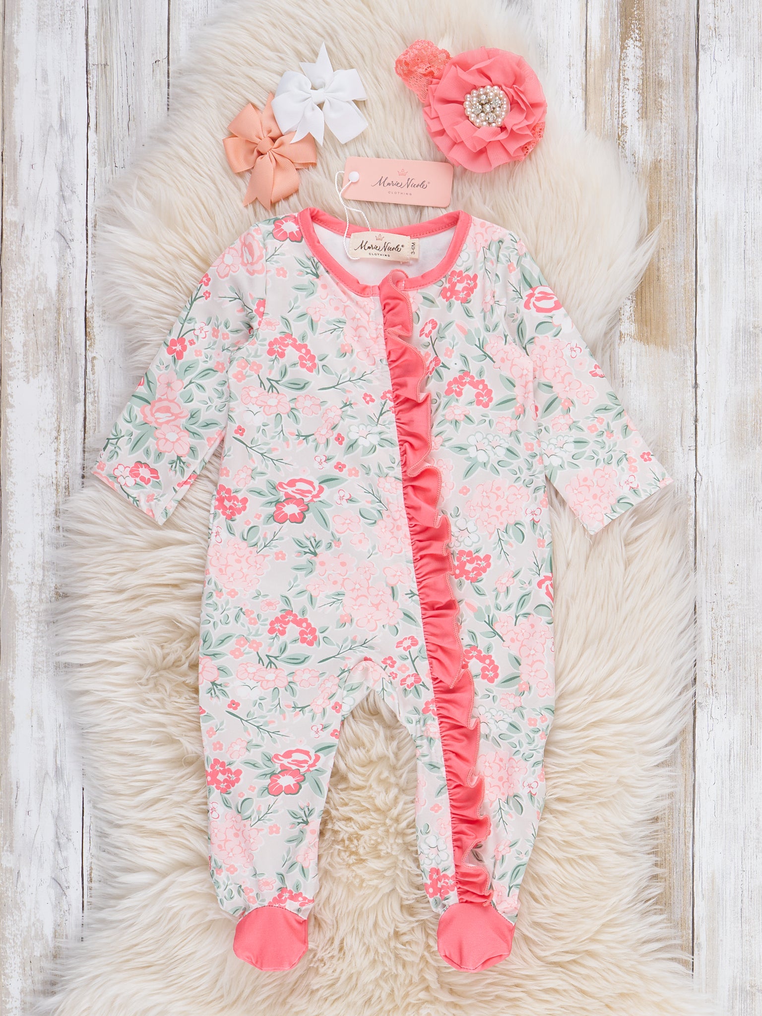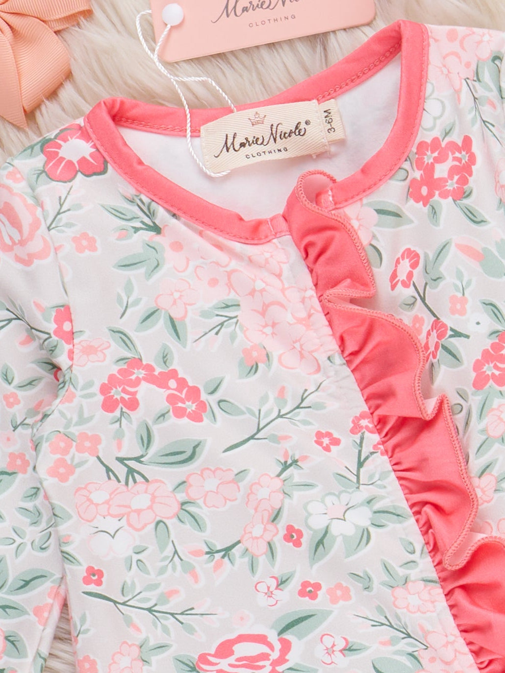 The Rosebud Ruffle Footed Sleeper Pajama by Marie Nicole Clothing features a delicate floral print and a playful ruffle trim down the front. With cozy footed bottoms and soft, stretchy fabric, this zipper pajama is designed for gentle comfort and sweet style for little ones.