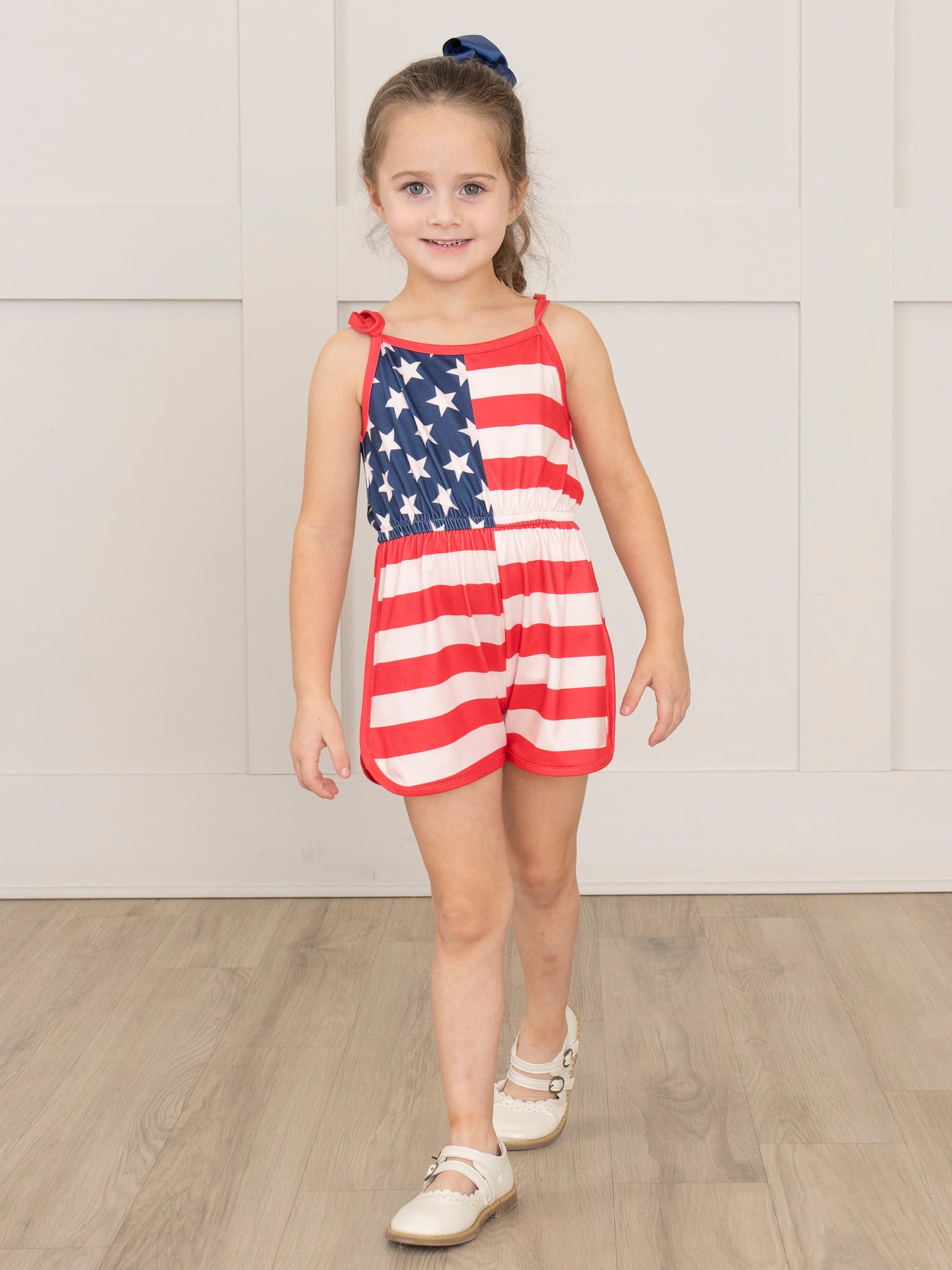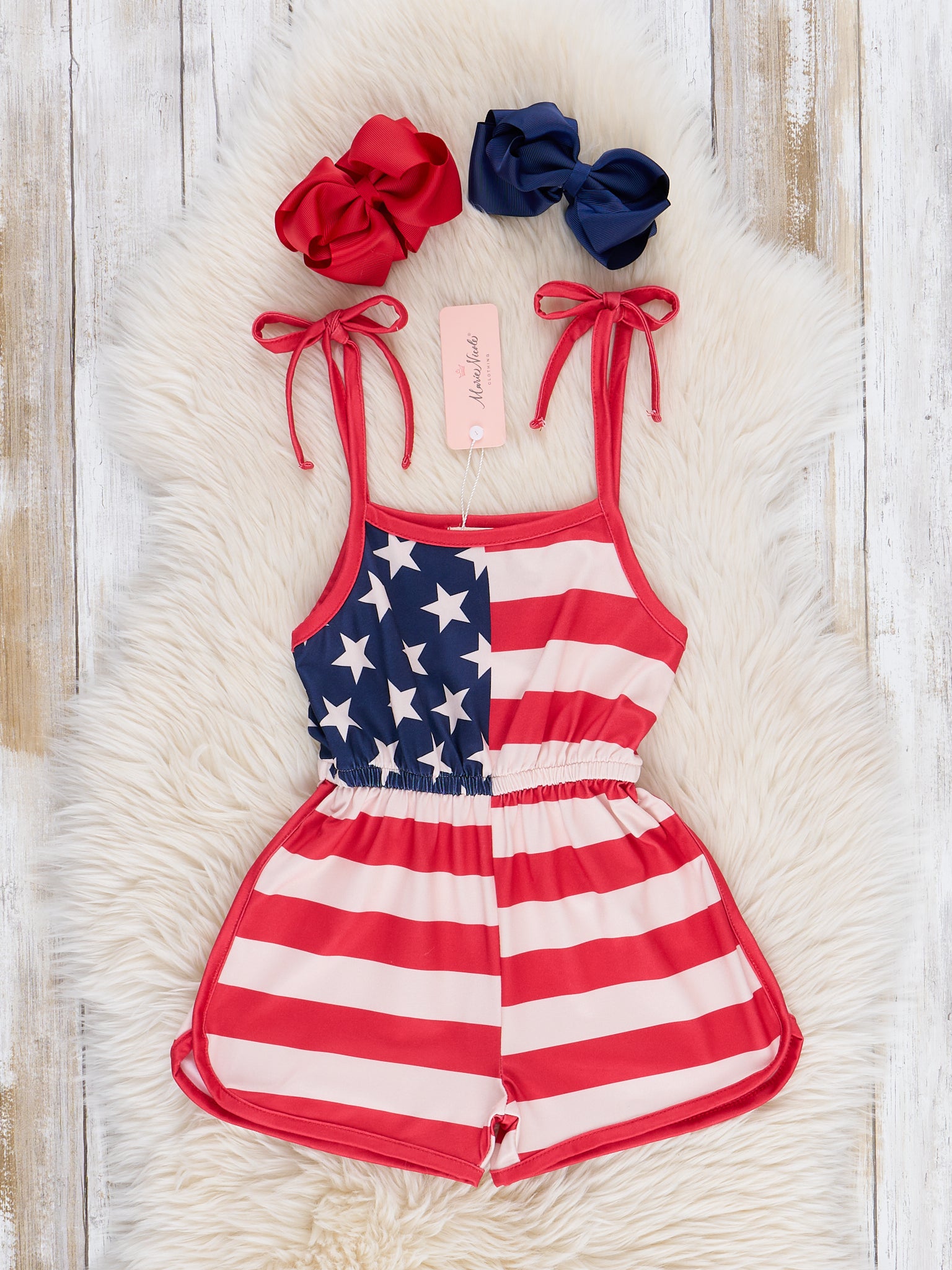 This romper by Marie Nicole Clothing has it all: tie straps for sweet bow touch, a bold American flag design, and it's just for girls! Show off your patriotic spirit with this playful and fun romper. Perfect for summer BBQs, parades, or any patriotic occasion. USA! USA! Shop the sister set!