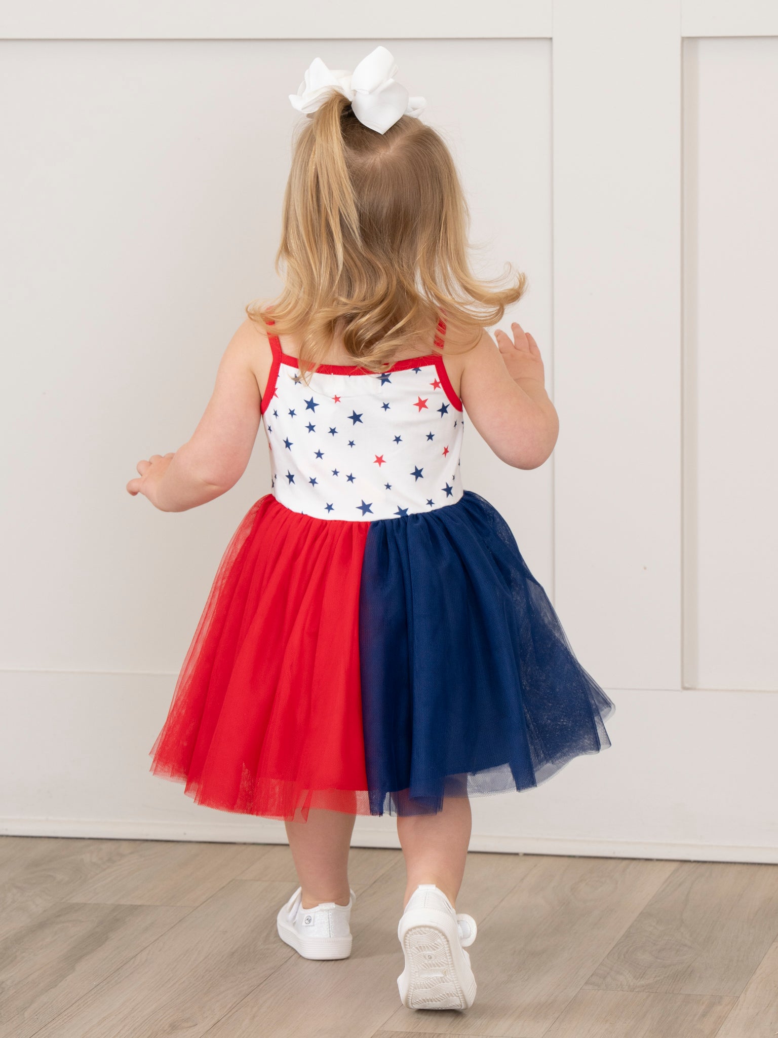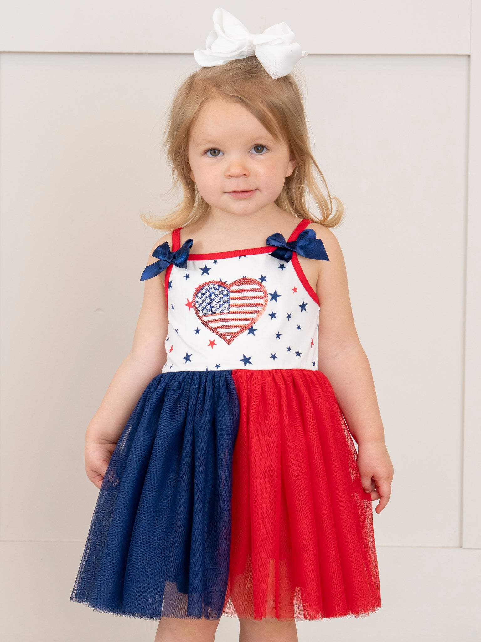Show off your little one's patriotic spirit with our Brave Heart Tulle Dress! This adorable girls dress features an embroidered sequin heart flag and a delicate tulle skirt. Complete with bow accents at the straps and a matching sister set from Marie Nicole Clothing. Be the ultimate trendsetter at any event!