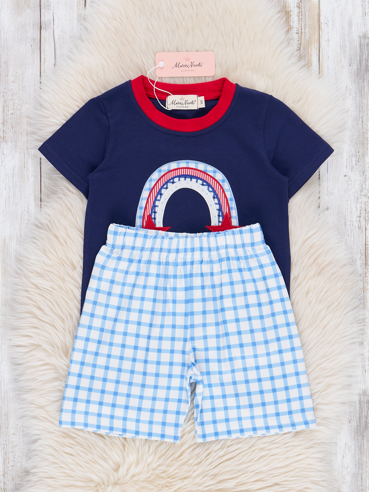 Show off your little one's unique style with the Independence Rainbow Embroidered Outfit by Marie Nicole Clothing. This boys' outfit features a navy top with an embroidered red, white, and blue rainbow, paired with patriotic plaid shorts. Perfect for siblings, this outfit screams fun and freedom!