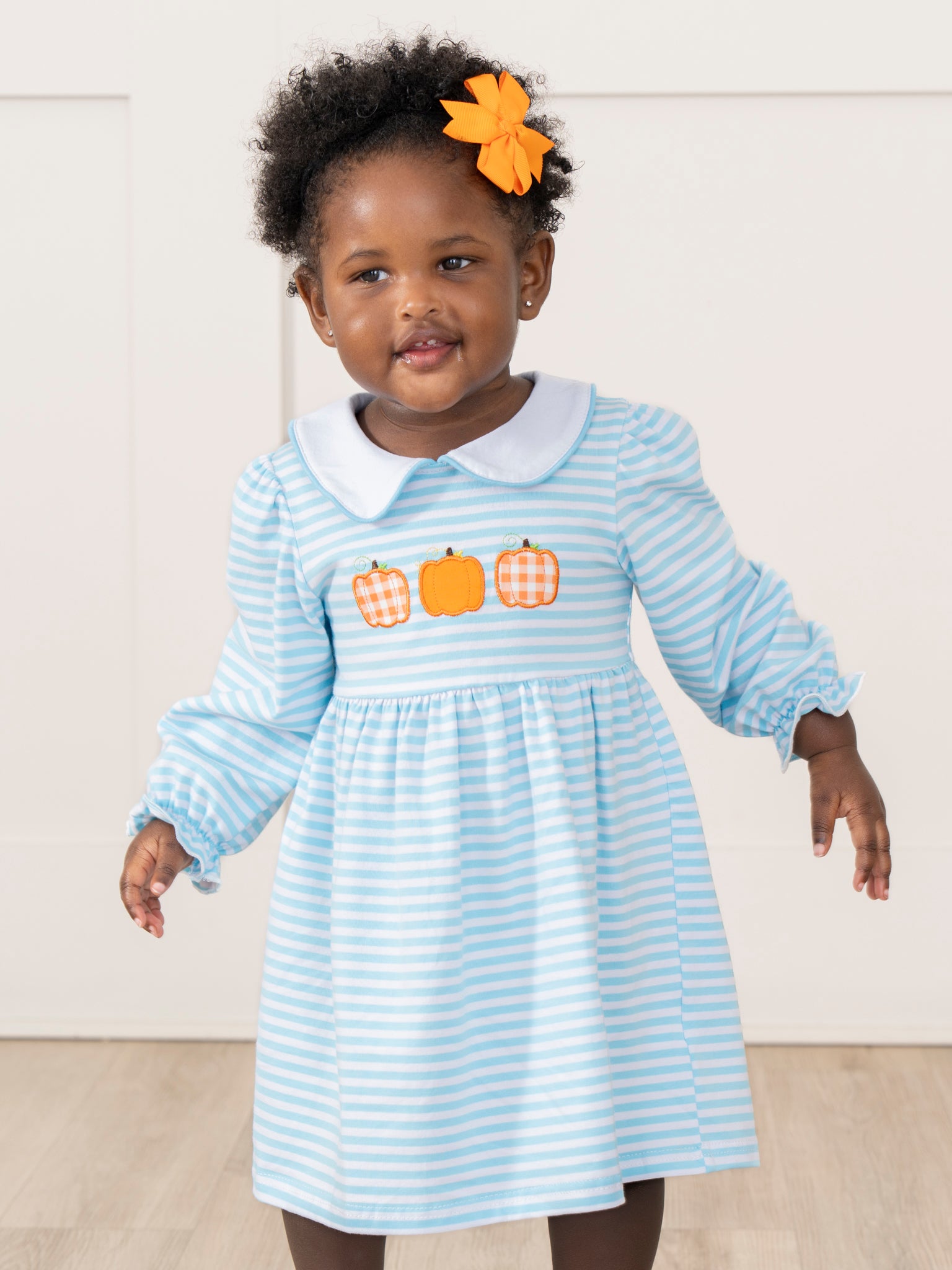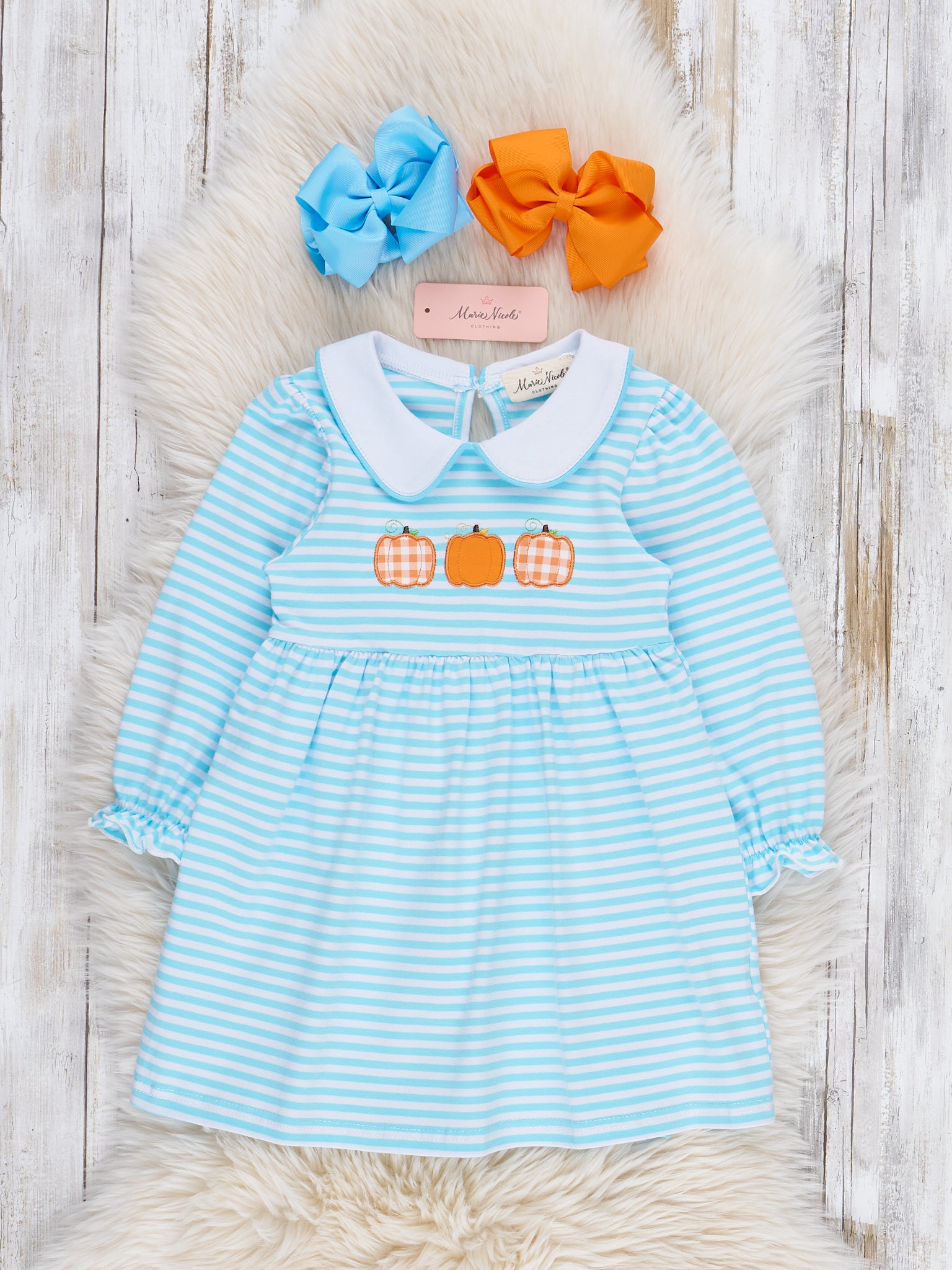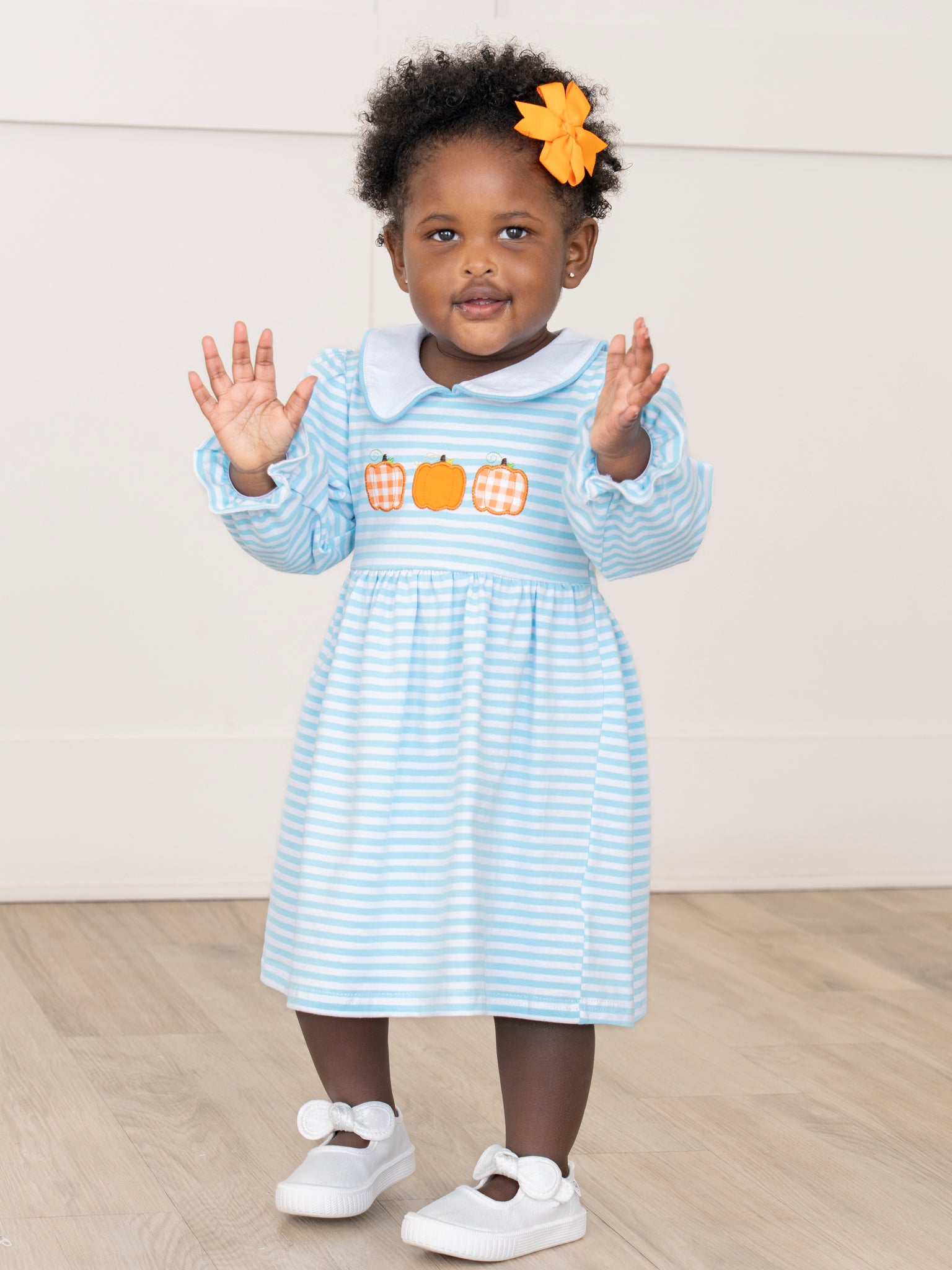 A darling sister set for your pumpkin lovers! This blue striped dress features a peter pan collar, embroidered gingham pumpkins, & cinches at the wrists.