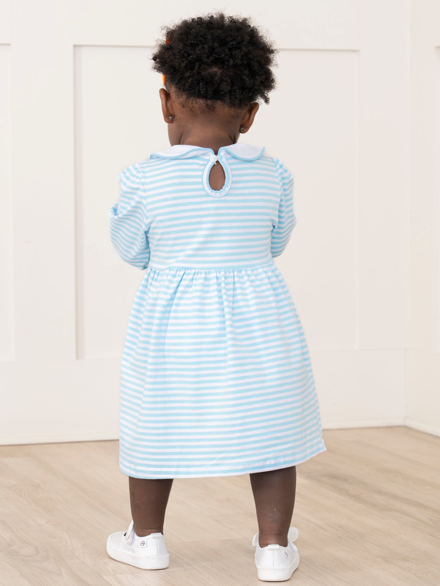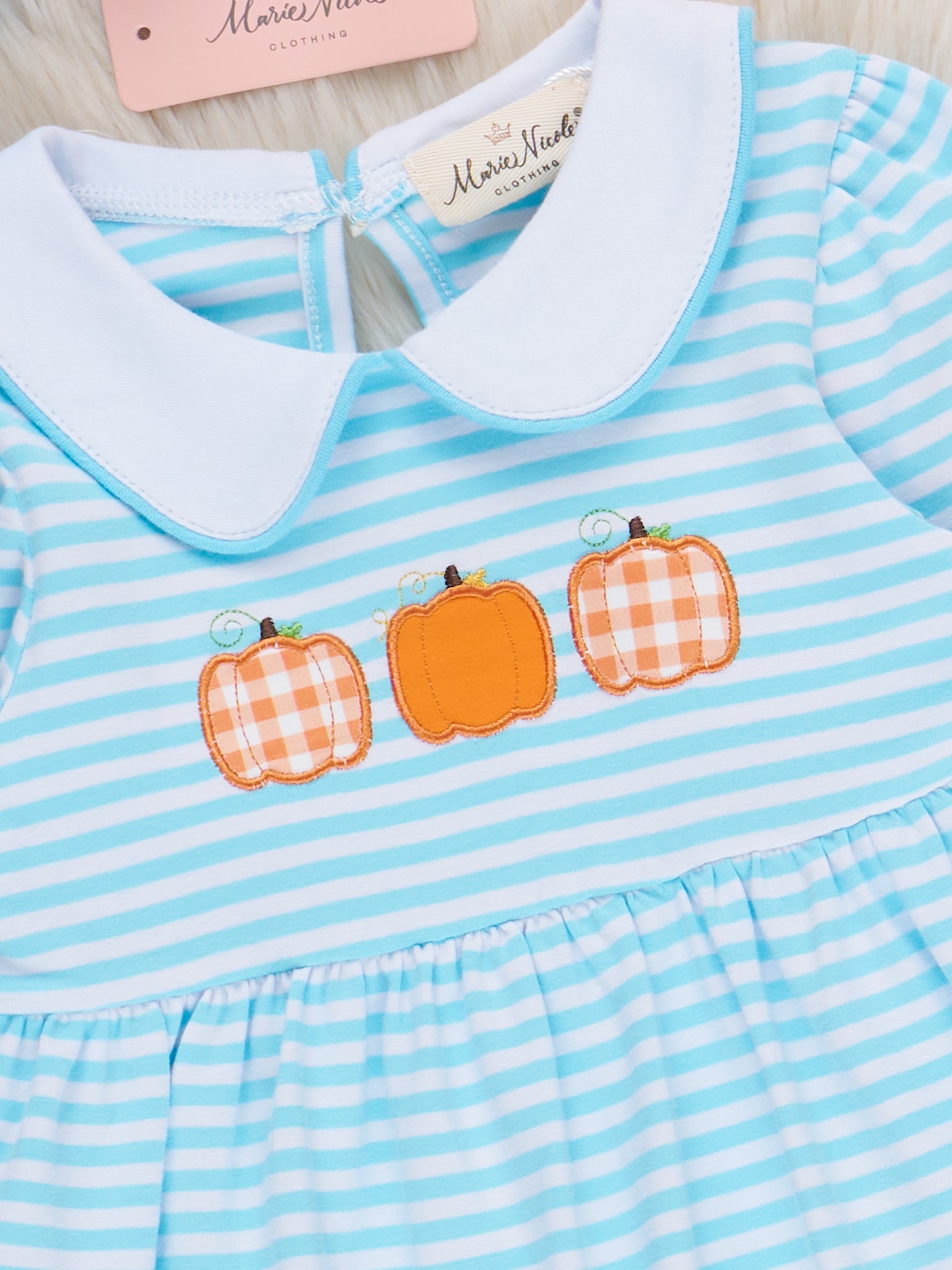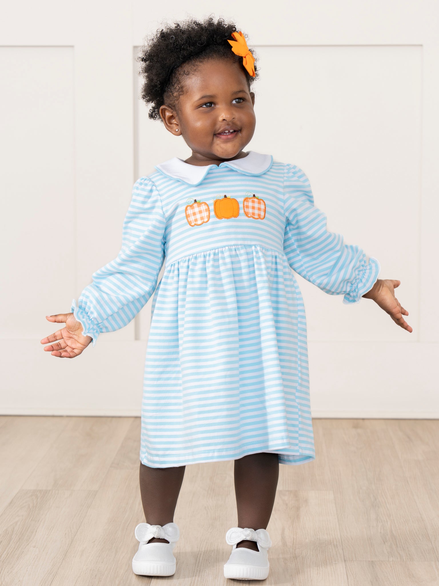 A darling sister set for your pumpkin lovers! This blue striped dress features a peter pan collar, embroidered gingham pumpkins, & cinches at the wrists.