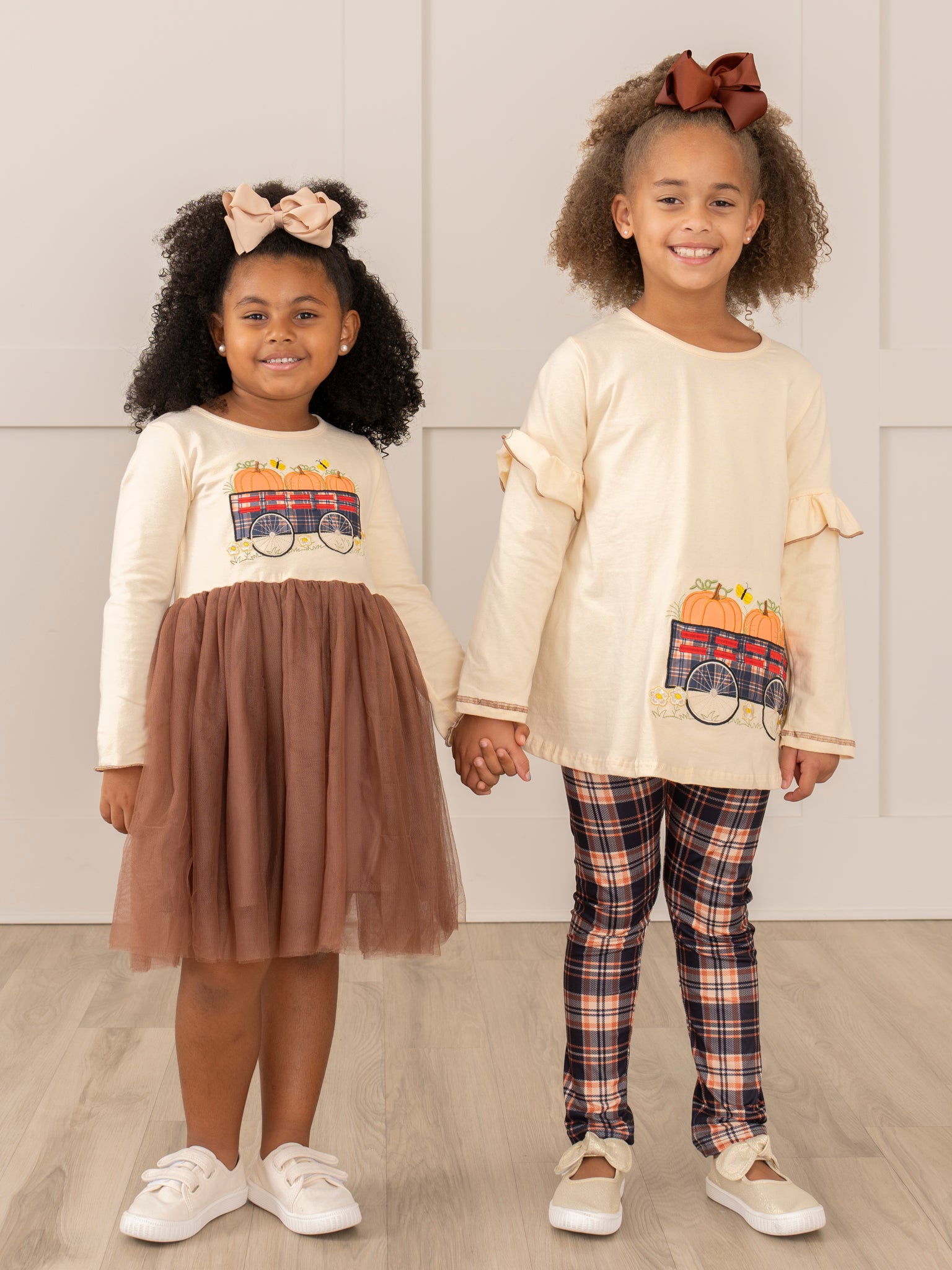 Get your little pumpkin ready for fall with this adorable sister set! Featuring plaid leggings and a brown embroidered wagon with pumpkins, this outfit is perfect for any autumn adventure. Plus, it's the perfect opportunity for some sisterly matching!