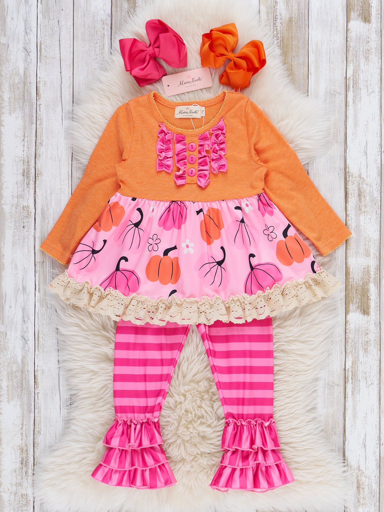 The Dancing Pumpkins Lace Ruffle Outfit by Marie Nicole Clothing features a playful orange bodice, a pumpkin-print skirted layer, and delicate lace trim, finished with ruffle accents at the chest. This adorable one-piece is perfect for fall festivities, pumpkin patch visits, and creating sweet seasonal memories.
