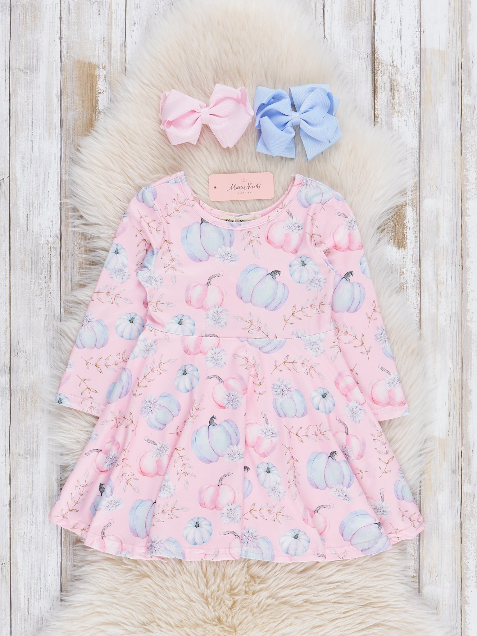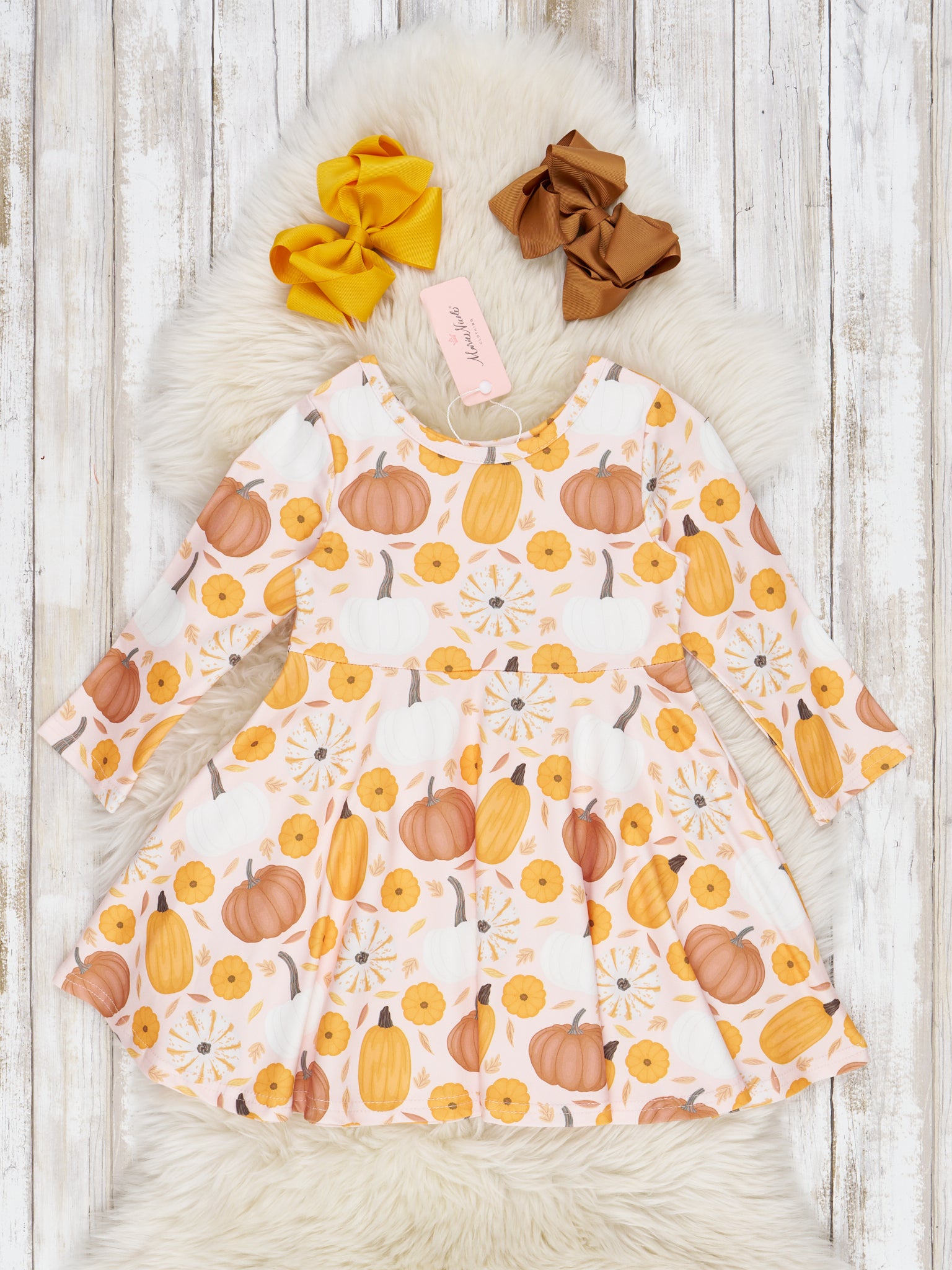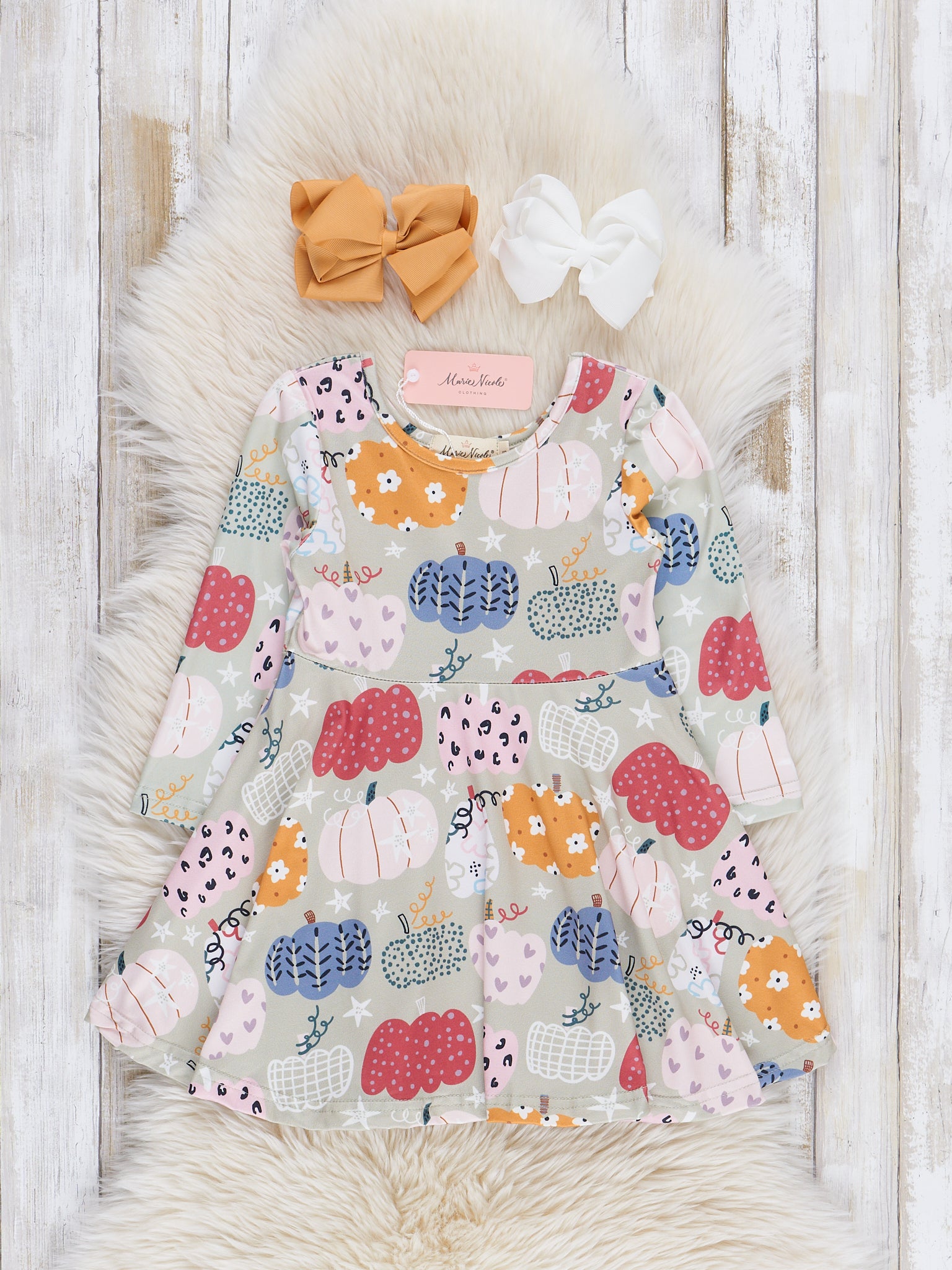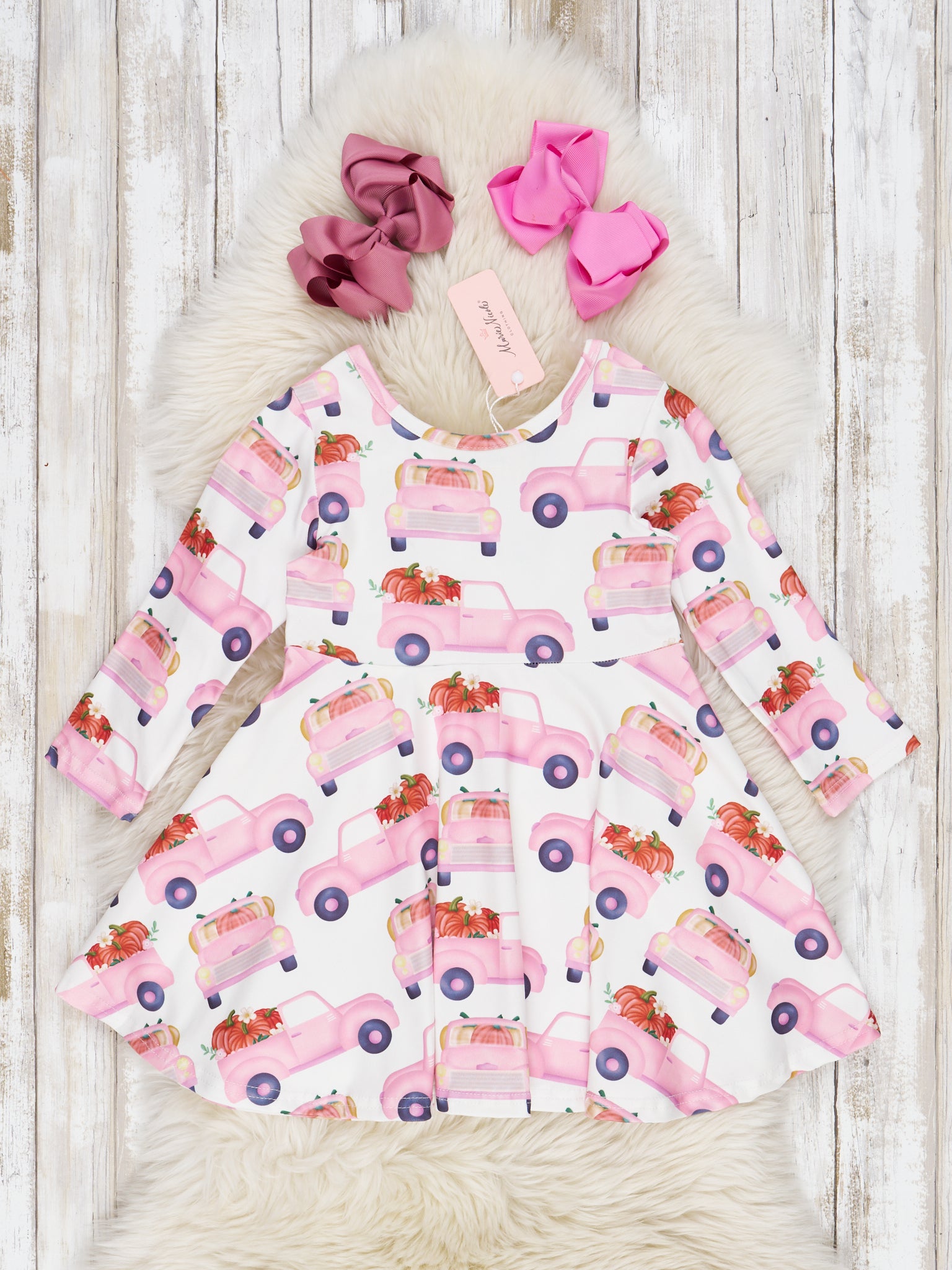 The perfect everyday dress for the autumn season features long sleeves, subtle pleats in the skirt, and adorable pumpkin patterns. Available in four different patterns: Pink Trucks, Sage Doodles, Rosy Pumpkins, and Orange Gourds.
