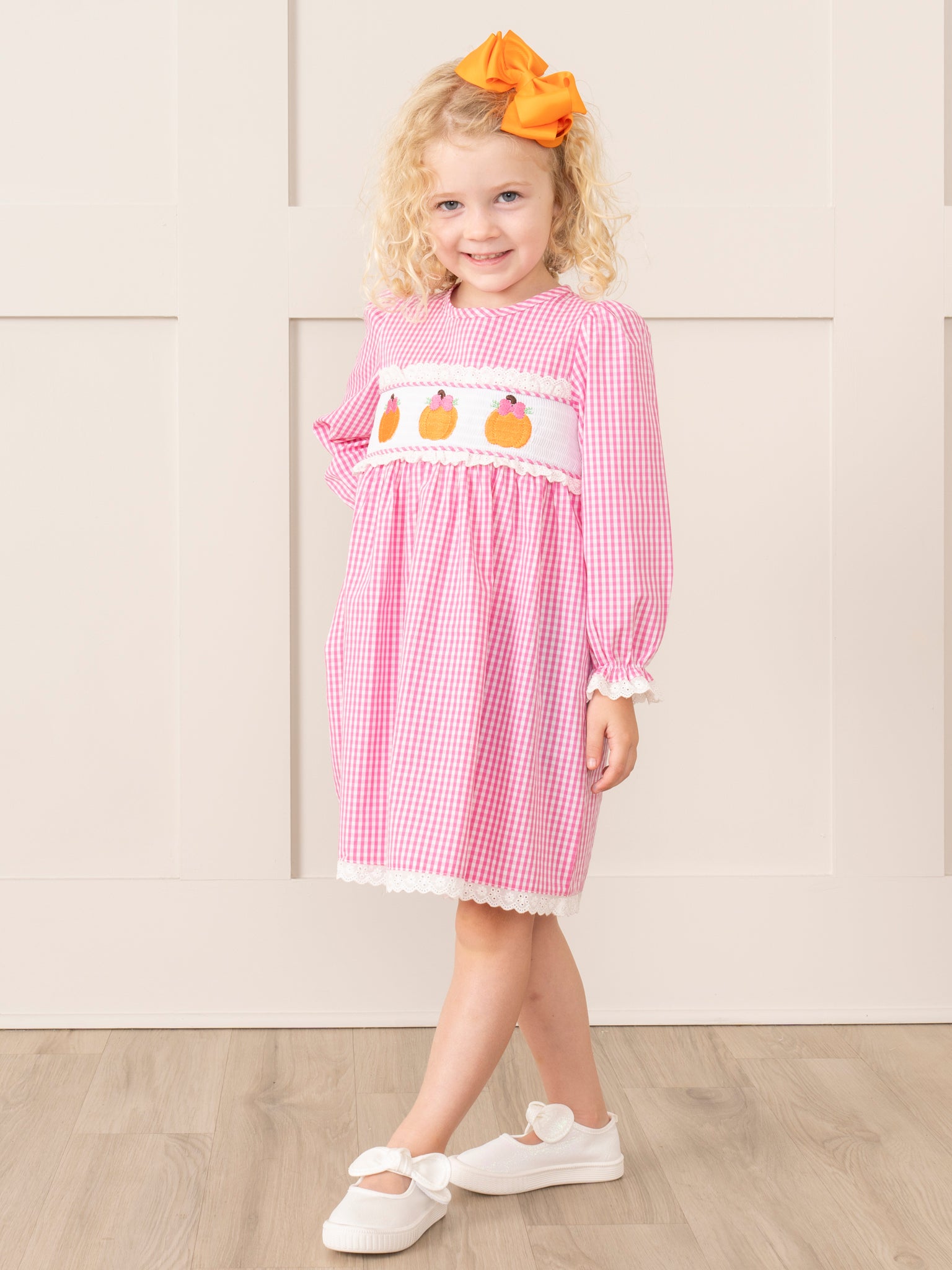 Get ready for fall fun with our Pink Gingham Smocked Pumpkin Ruffle Dress. This playful dress features embroidered pumpkins over smocking and a white ruffle trim for a touch of whimsy. Plus, it comes in a sister set for even more cuteness! Perfect for your little fashionista. 🎃👗