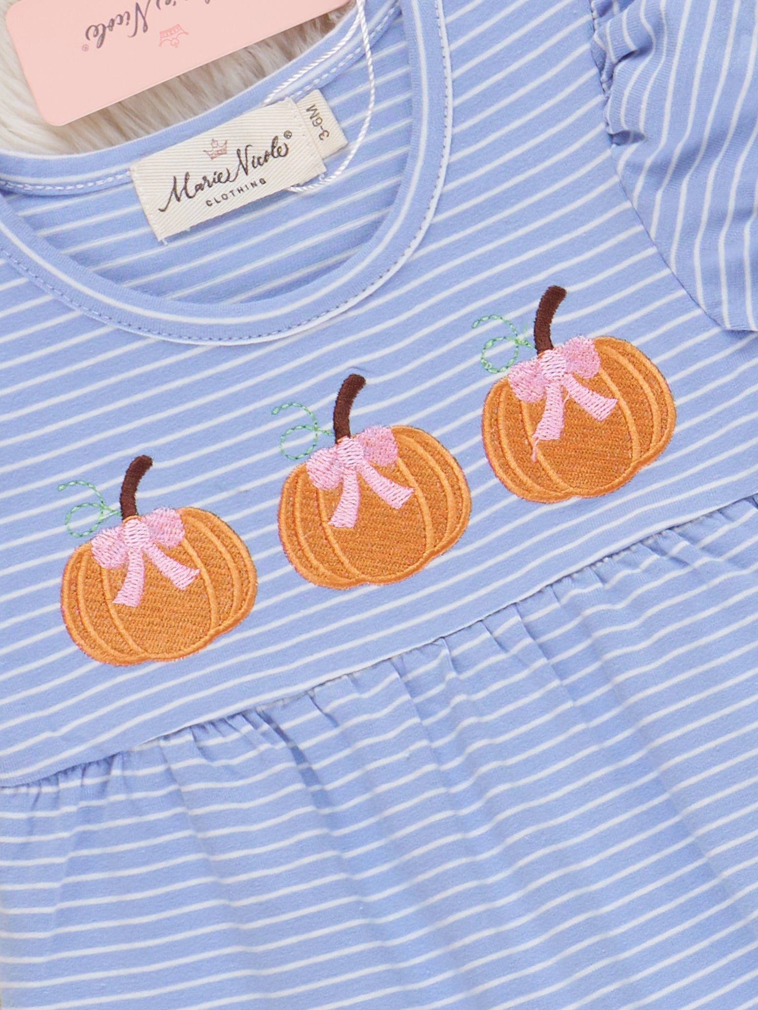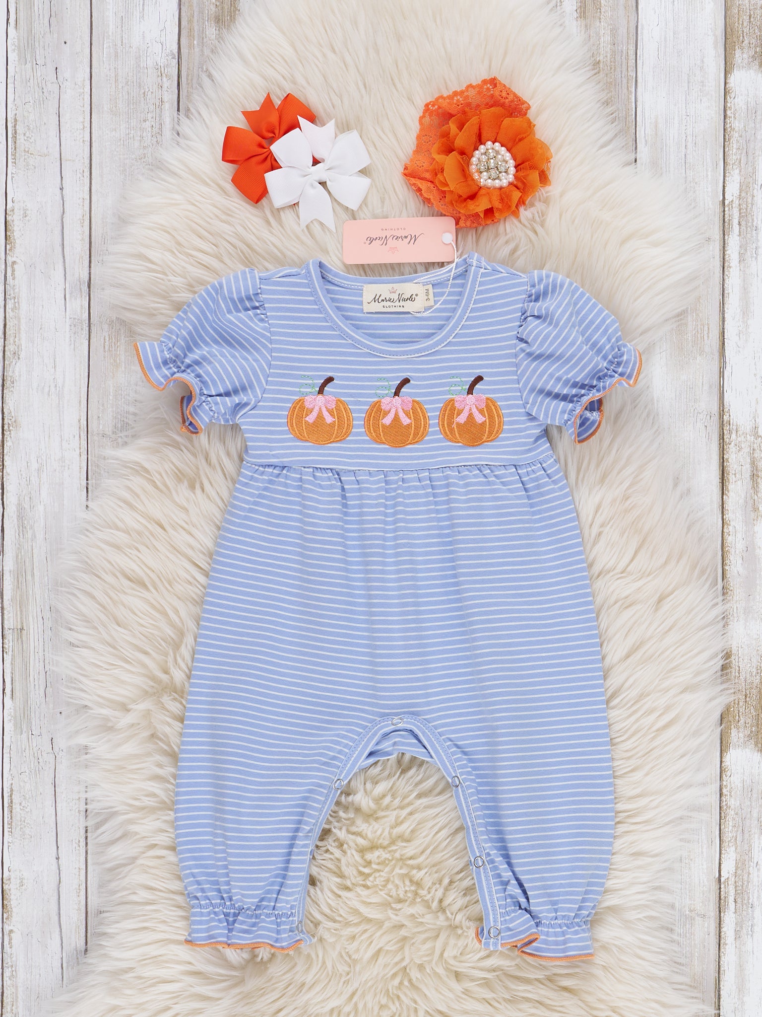 The Pumpkins & Blue Stripes Embroidered Romper has charming stripes and embroidered pumpkins, finished with an orange trim. This piece by Marie Nicole Clothing is crafted with soft, comfy fabric, making it perfect for your little girl to wear at any fall occasions, from Halloween to Thanksgiving!