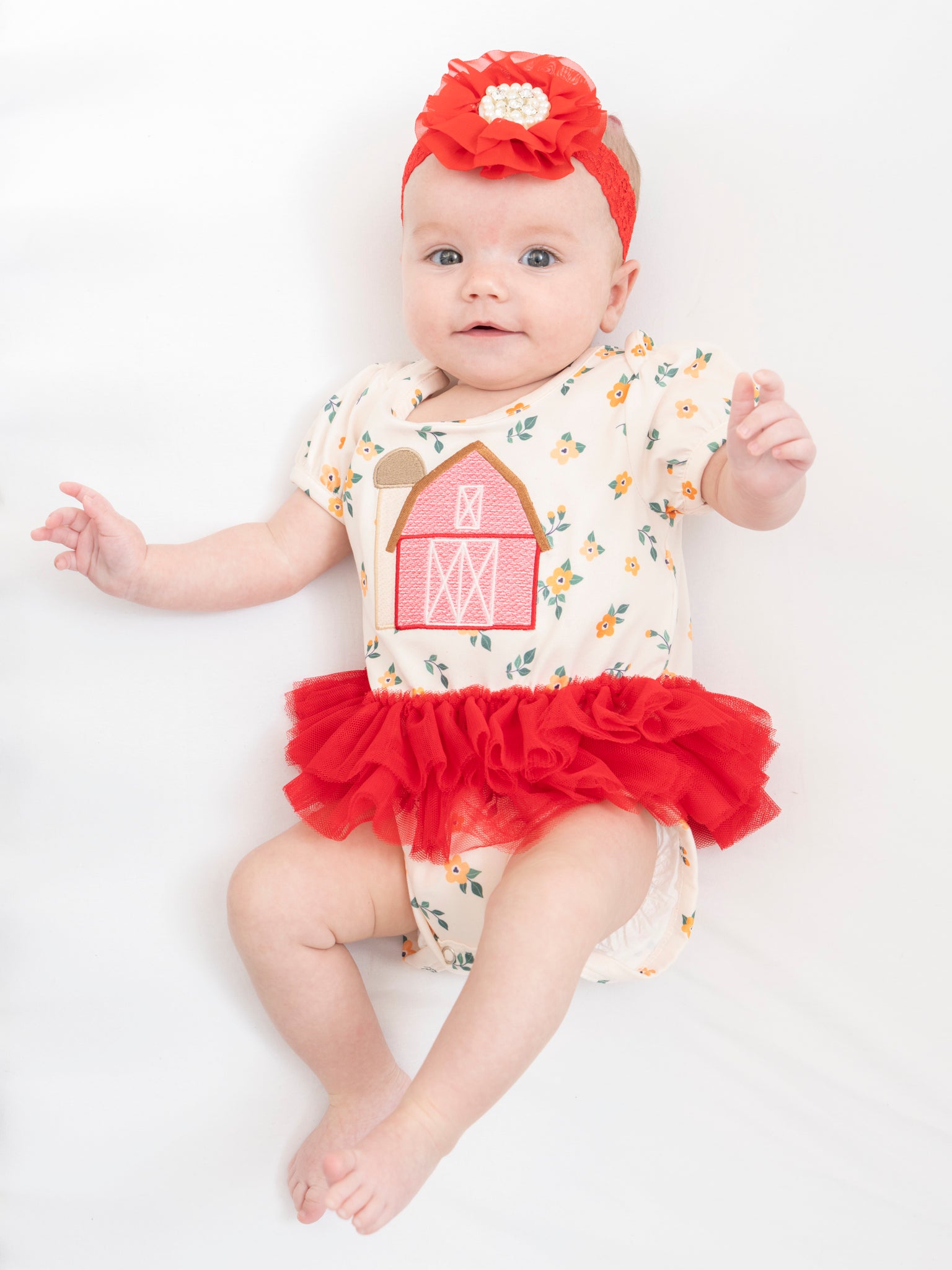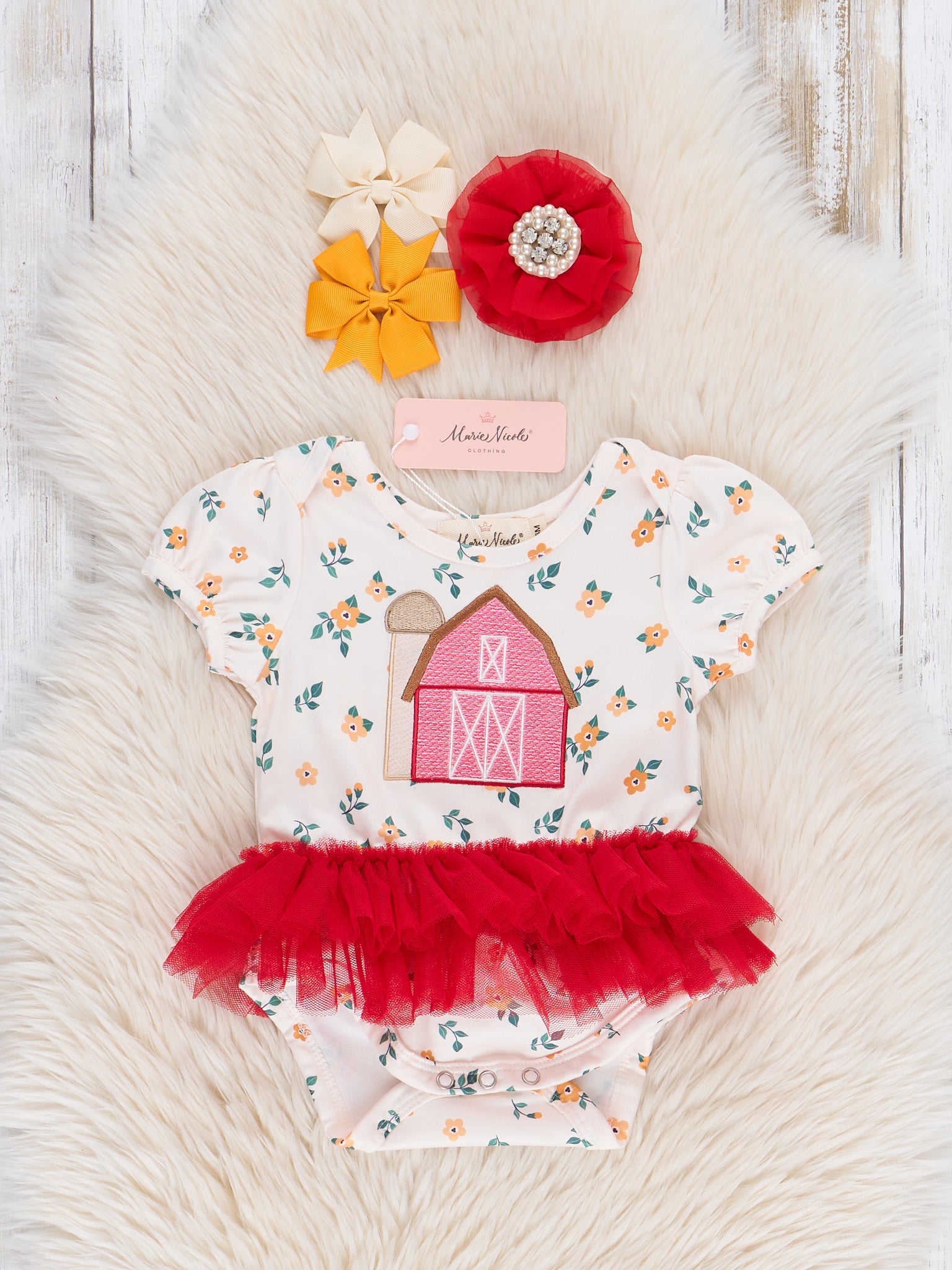 The Embroidered Barn Tulle Bubble from Marie is a darling one-piece featuring a charming barn embroidery and soft layers of tulle for a playful, farm-inspired touch. With its gentle fabric and snap closures, it's as comfy as it is cute—perfect for special occasions or everyday fun.