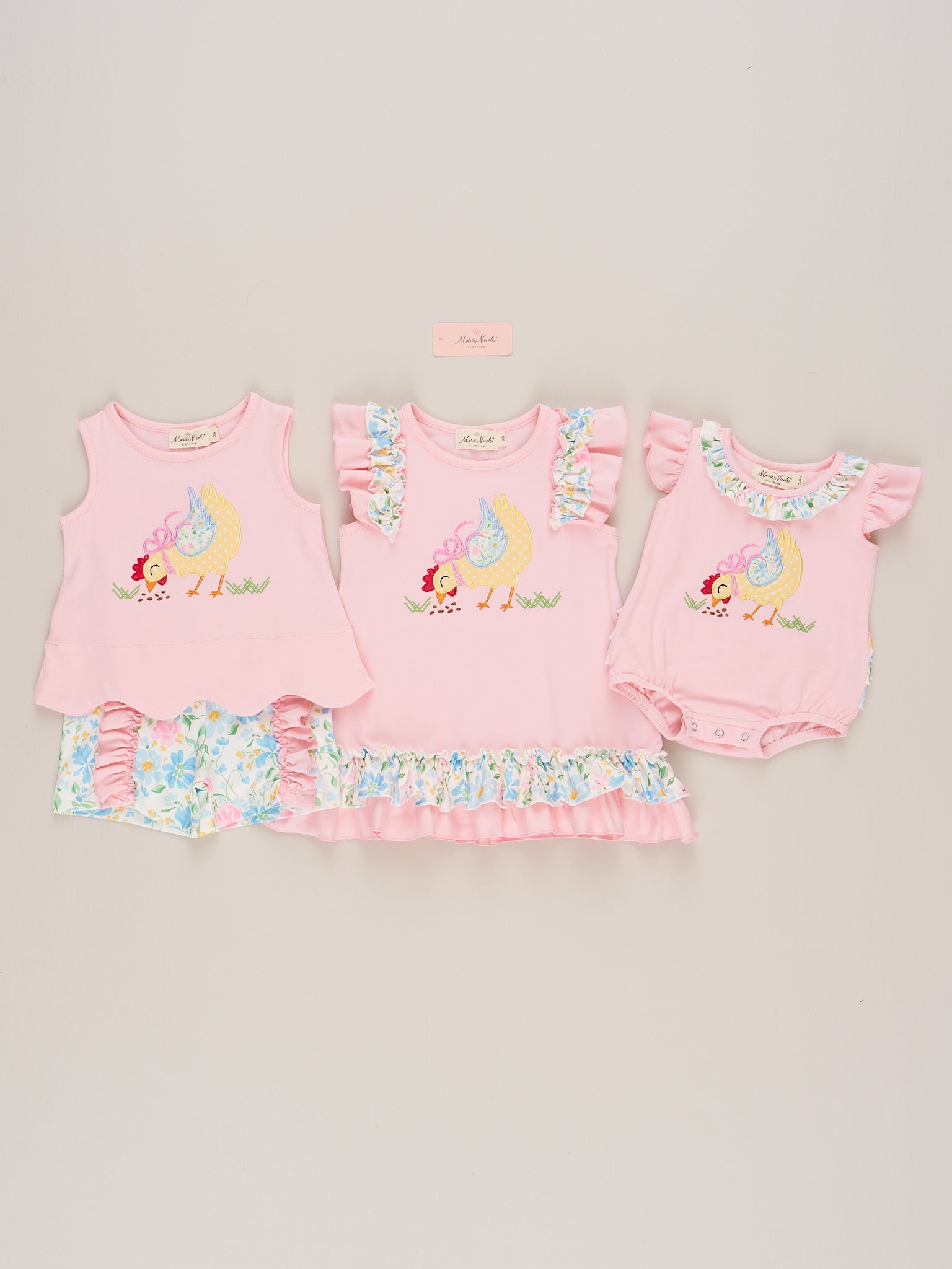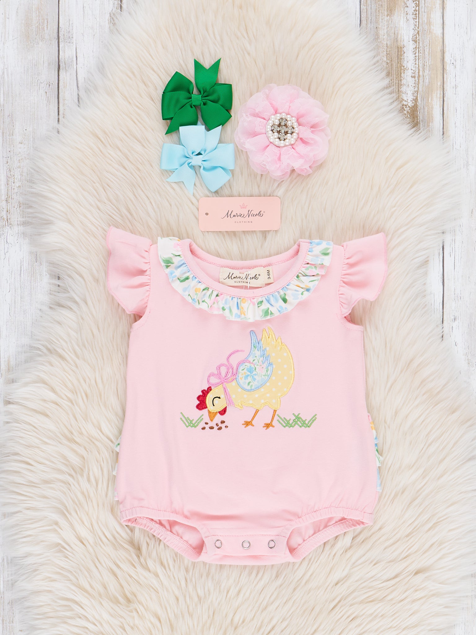 Bring a touch of farmyard charm to her day with the Grazing Hen Embroidered Ruffle Bubble from Marie Nicole Clothing. Featuring delicate hen embroidery and sweet ruffle accents, this bubble blends whimsy with comfort for everyday play or special outings. It's a chirping cute look she’ll love to wear!