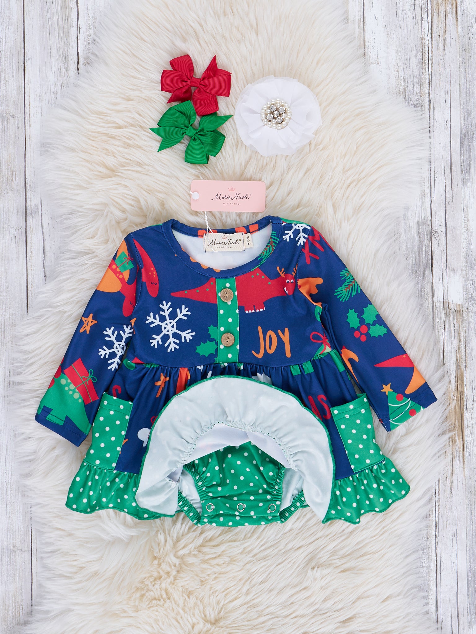 Green Holiday Dots & Dinosaurs Ruffle Romper