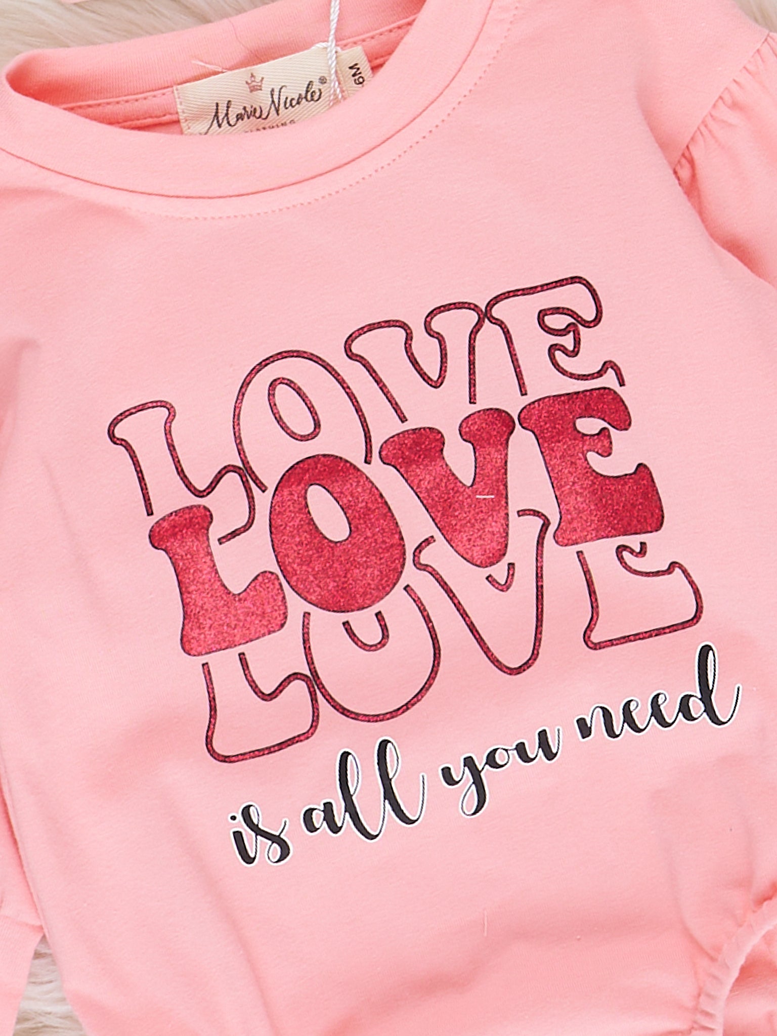 Show off your pink-hot love with this "Love is All You Need" romper by Marie Nicole Clothing! This cozy, printed Valentine'sDay bubble are the perfect combo for you and your bestie! Get your heart on!