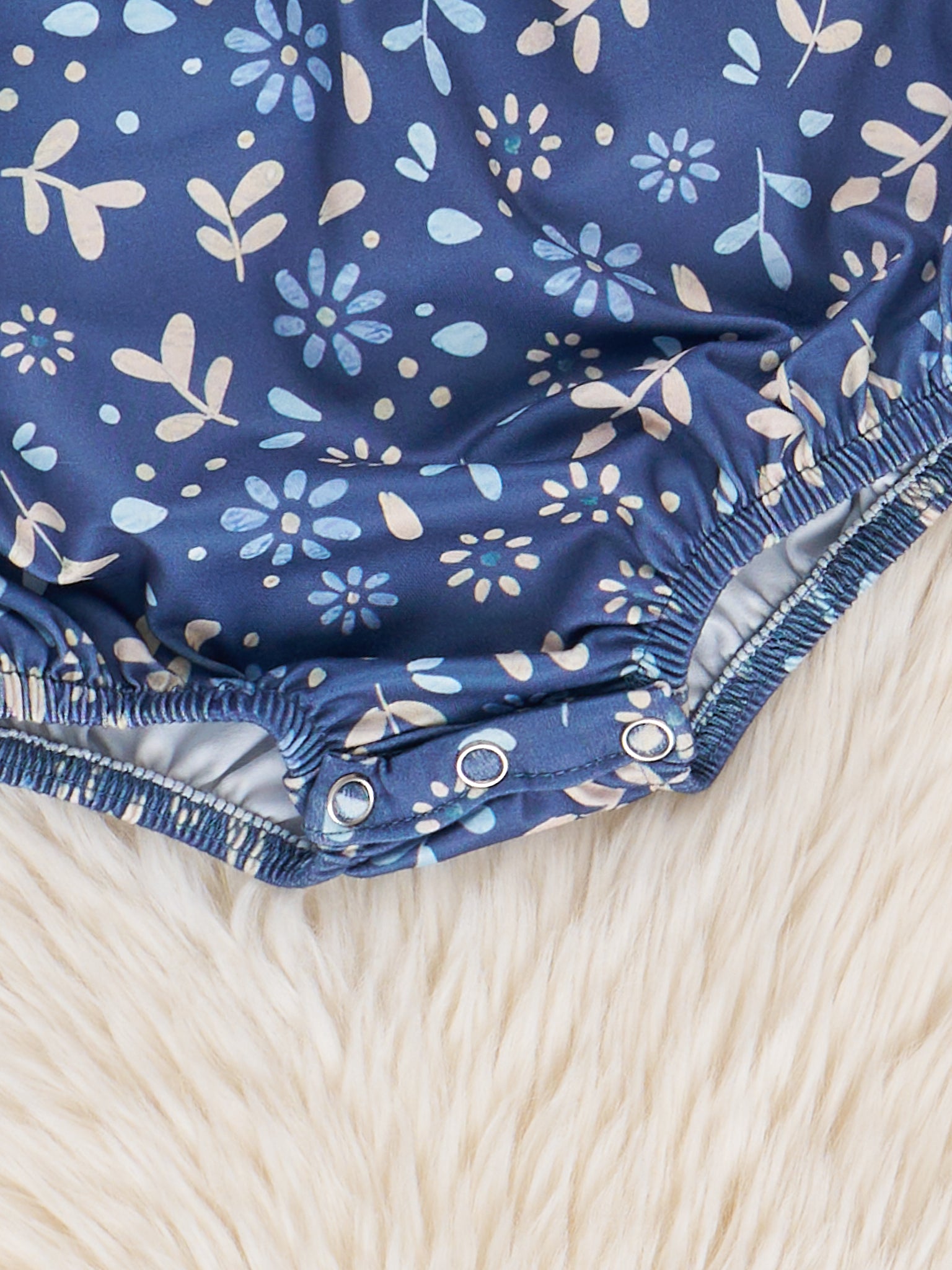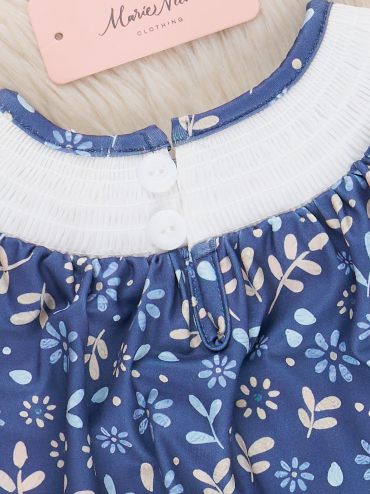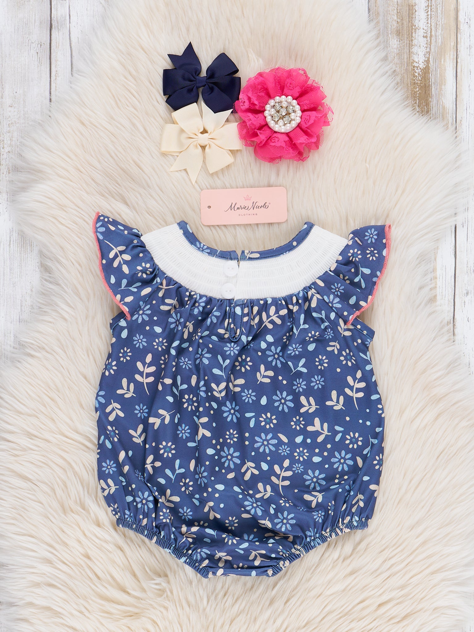Whether it's for a casual outing or a special occasion, Smocked Garden Walk Flutter Bubble is a whimsical and airy piece, perfect for warm-weather days. eaturing delicate, embroidered flowers and smocking, this blue floral print bubble from Marie Nicole Clothing adds a touch of elegance and country charm.