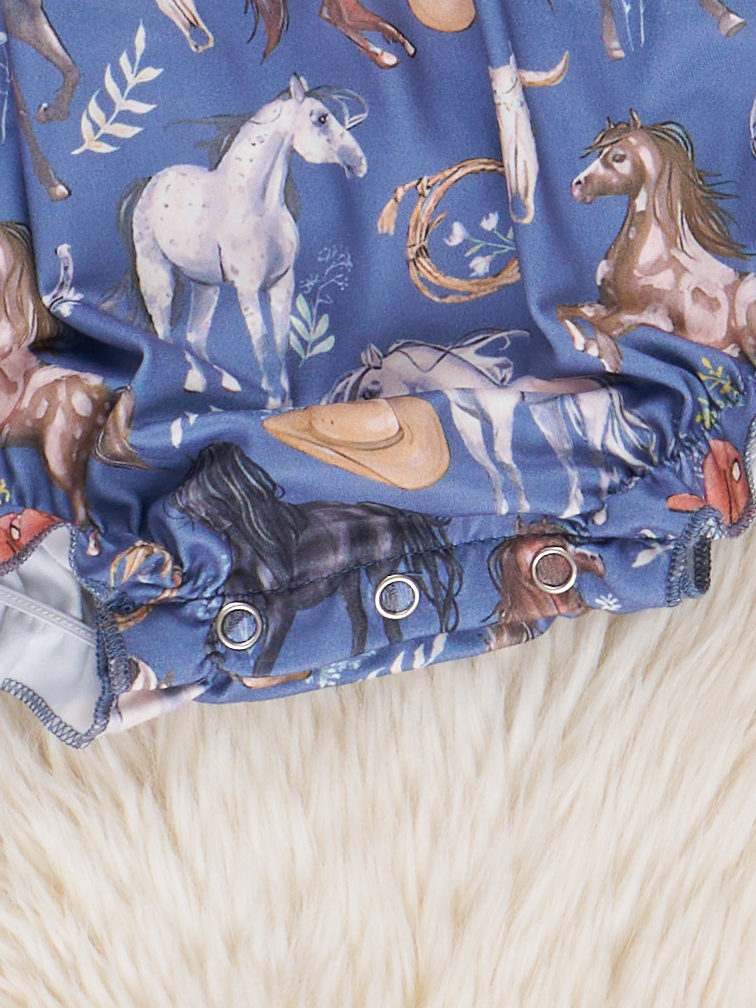 This darling sister set will give your girls all the horsepower they need to get through the day! This steel blue bubble features embroidered horses, tie straps, ruffles, & a darling horse print.