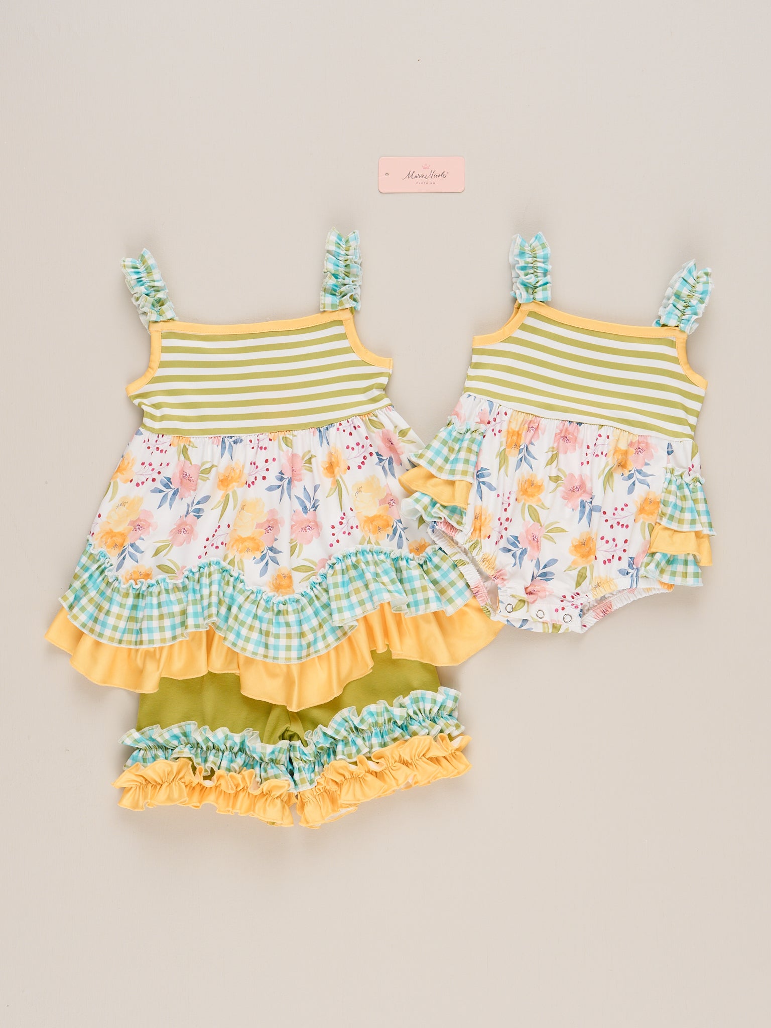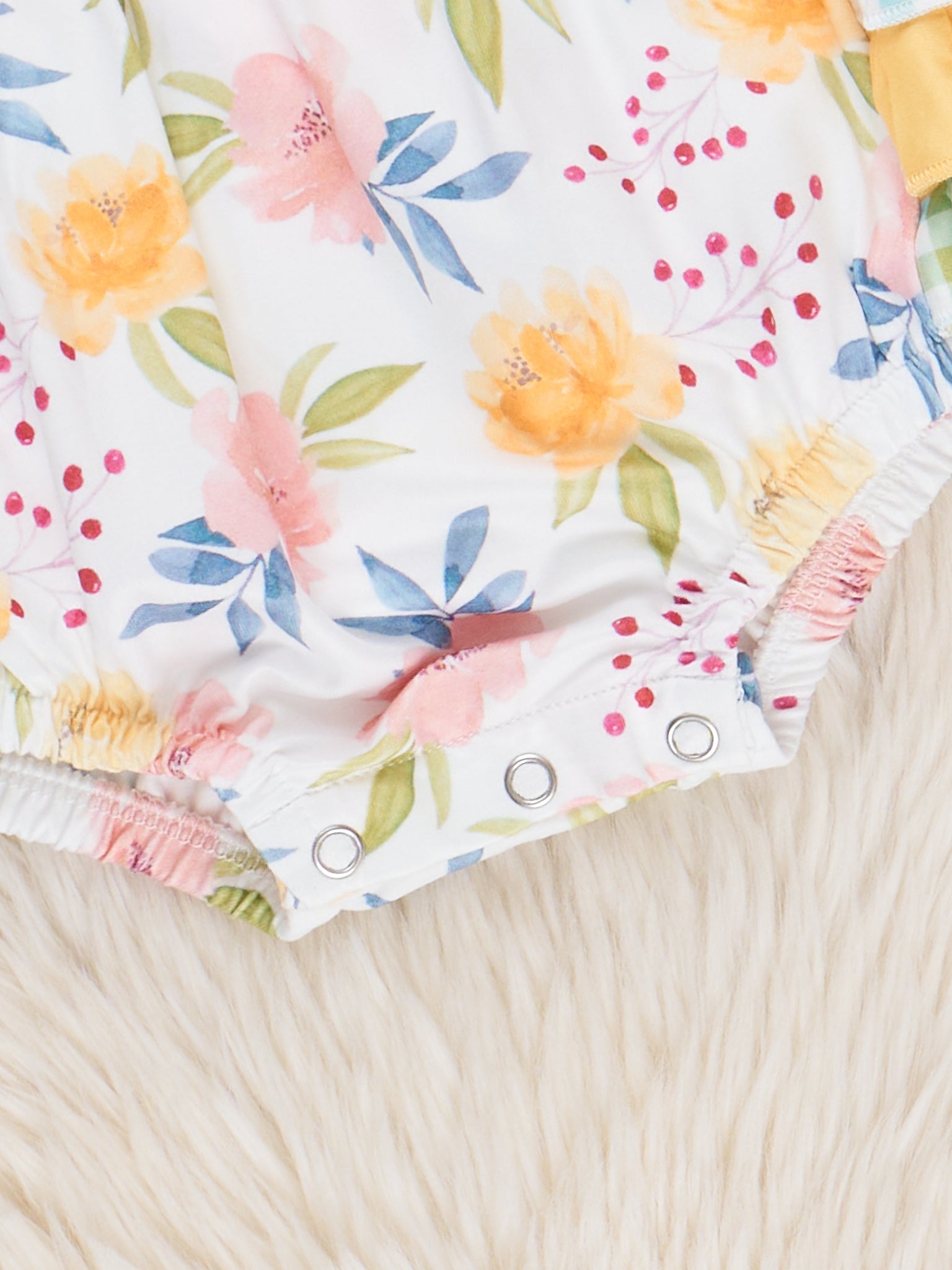 The Striped Hibiscus Garden Ruffle Bubble is a fresh and feminine look that’s perfect for spring and summer days. Featuring soft stripes paired with a beautiful hibiscus floral print, this bubble from Marie Nicole Clothing is finished with delicate ruffle details for an extra touch of sweetness. Lightweight and comfortable, it's ideal for playdates, picnics, or any day your little one wants to bloom in style.