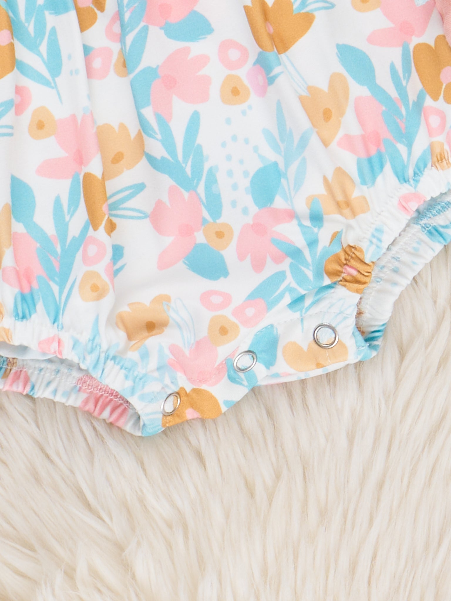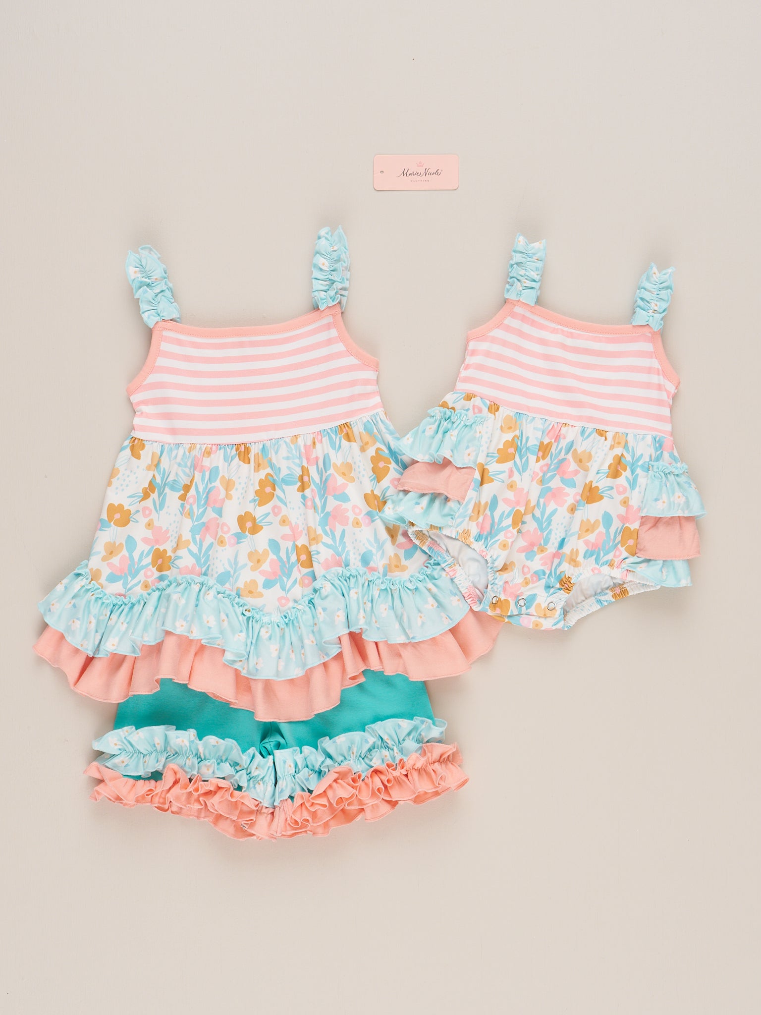 The Striped Peony Garden Ruffle Bubble is a fresh and feminine look that’s perfect for spring and summer days. Featuring soft stripes paired with a beautiful peony floral print, this bubble from Marie Nicole Clothing is finished with delicate ruffle details for an extra touch of sweetness. Lightweight and comfortable, it's ideal for playdates, picnics, or any day your little one wants to bloom in style.