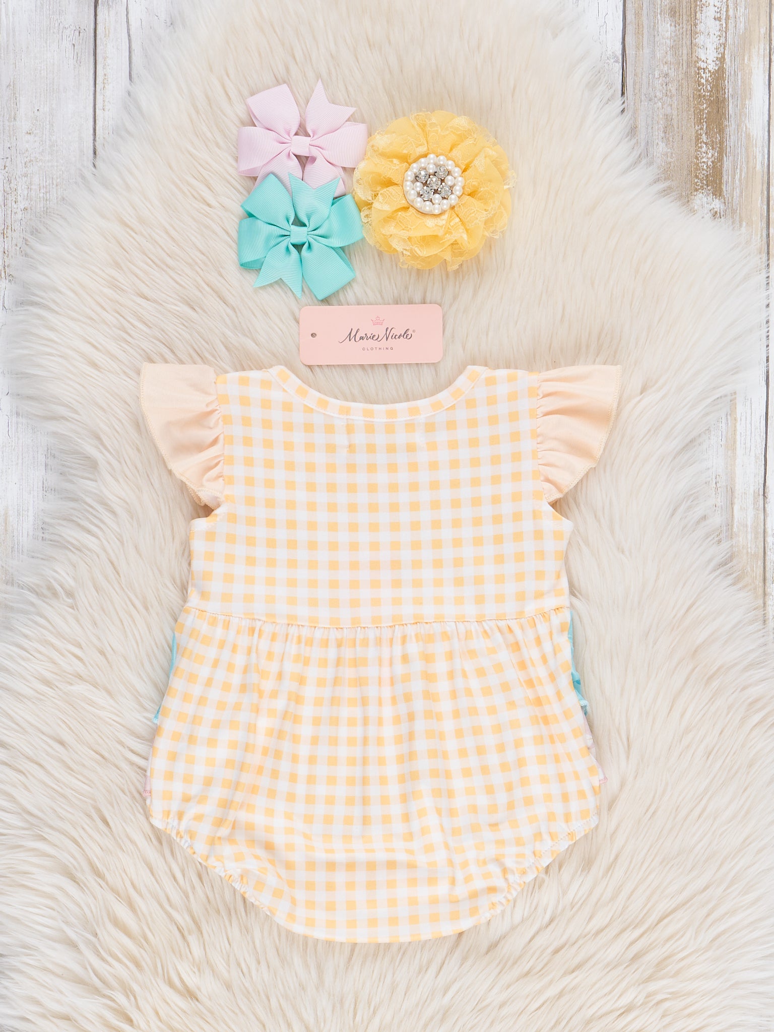 Get ready for some sweet summer fun with our Sweet Gingham Floral Ruffle Bubble! This girls' bubble features a playful yellow gingham bodice boasting a tiered pink and blue floral peplum detail. Perfect for sisters, this set is from Marie Nicole Clothing.