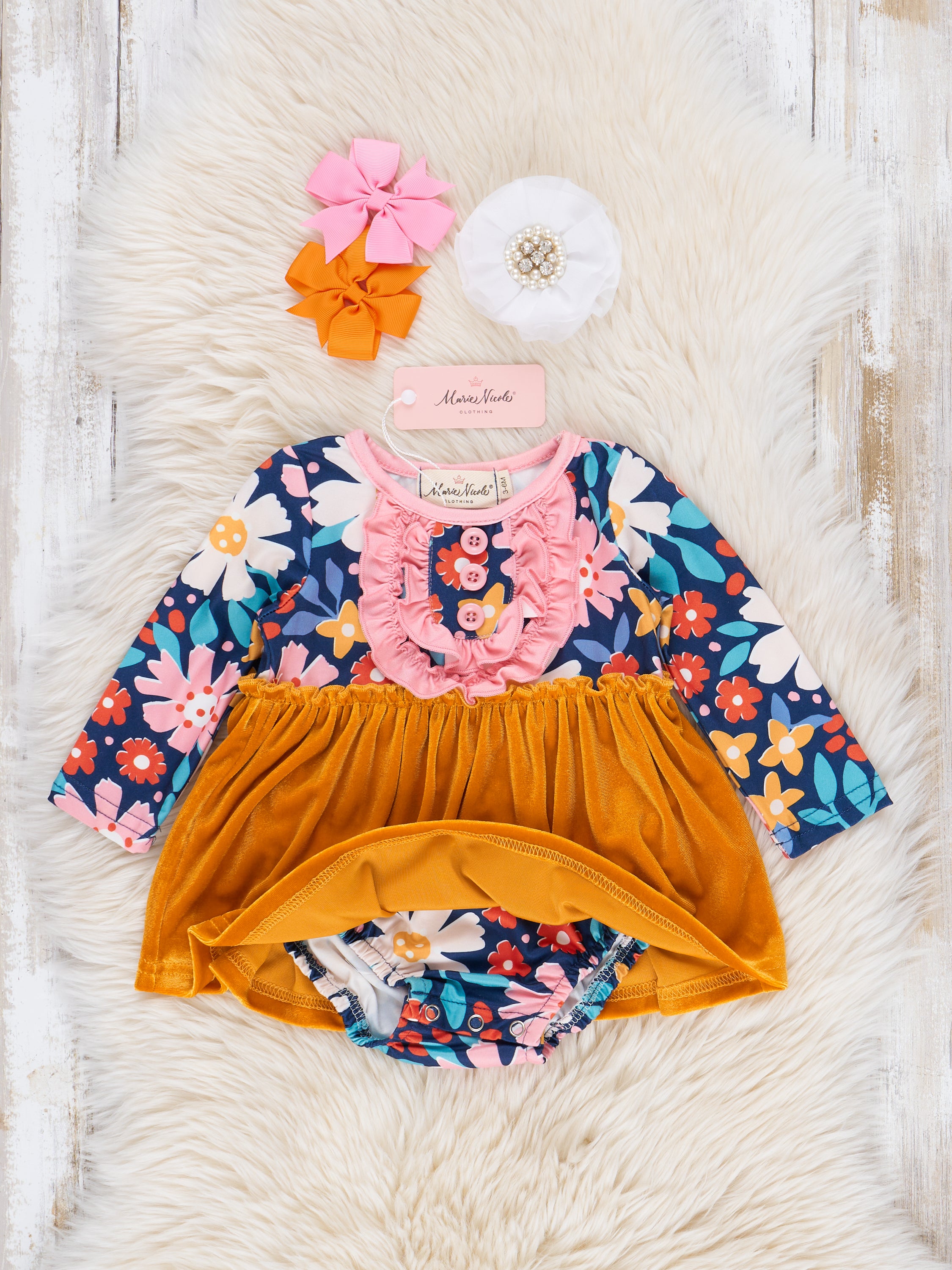 Unleash your little one's playful side with the Yellow Velvet & Pink Floral Ruffle Bubble. This adorable girls bubble features a delightful yellow velvet peplum detail, paired with a charming floral bodice and pink ruffle detail. This sister set is perfect for blooming into the fall season!
