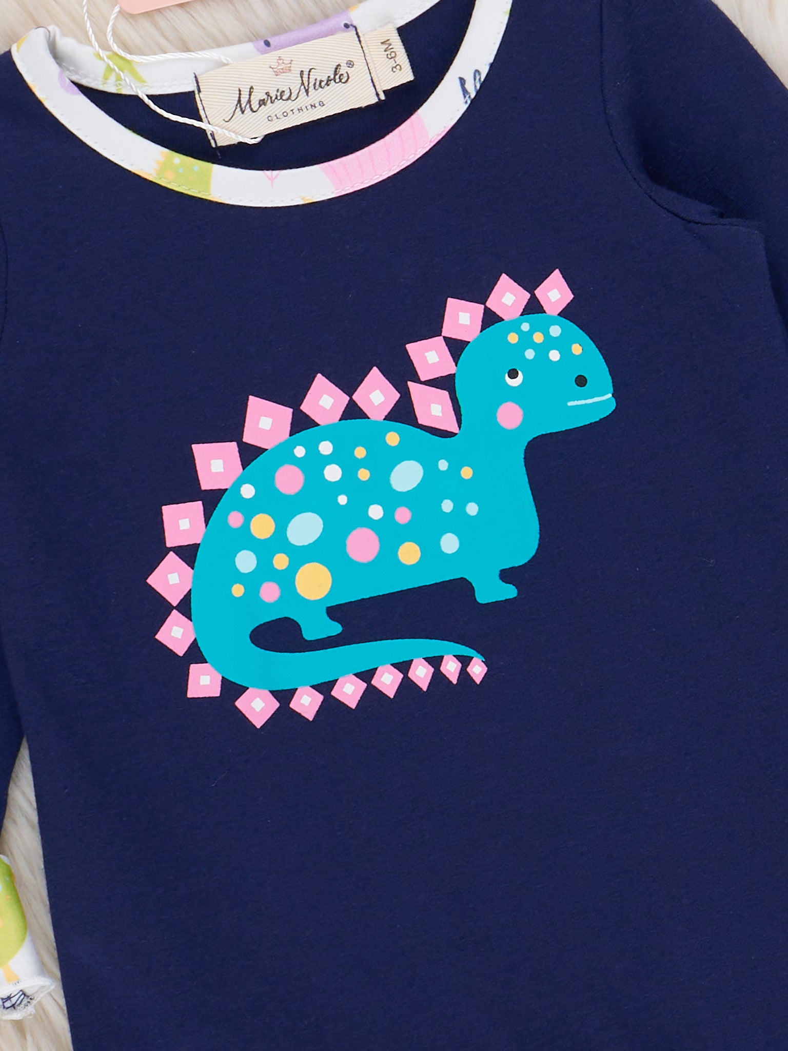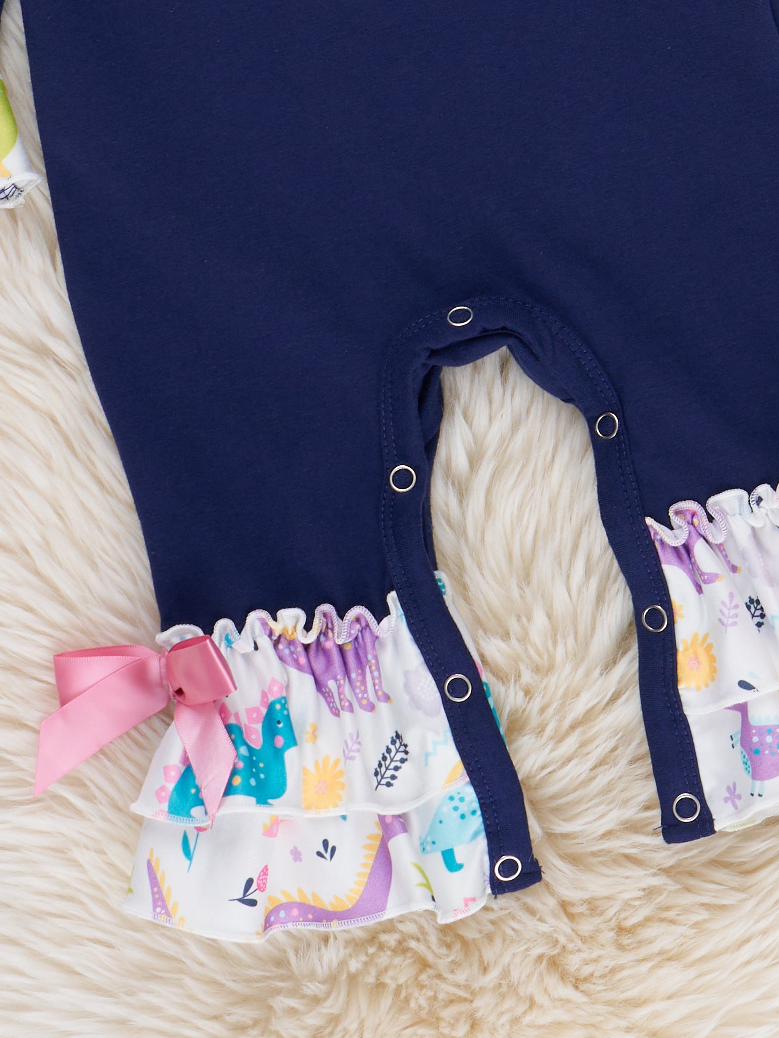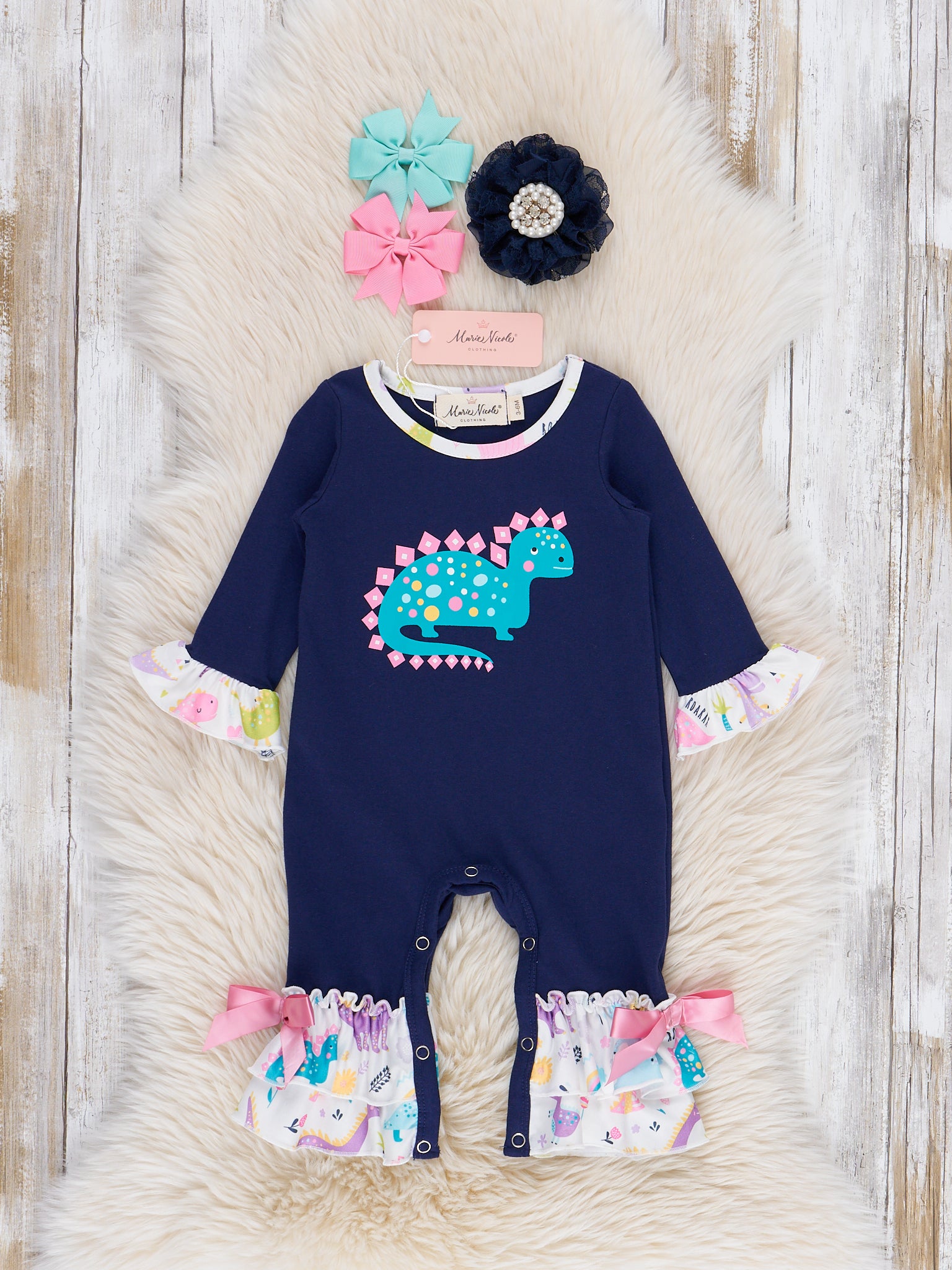 Step into the Jurassic era with this playful sibling set. The navy ruffle romper features a bold blue brontosaurus graphic, while the dinosaur print ruffle details add a fun touch. Perfect for any budding paleontologist or fashionista!