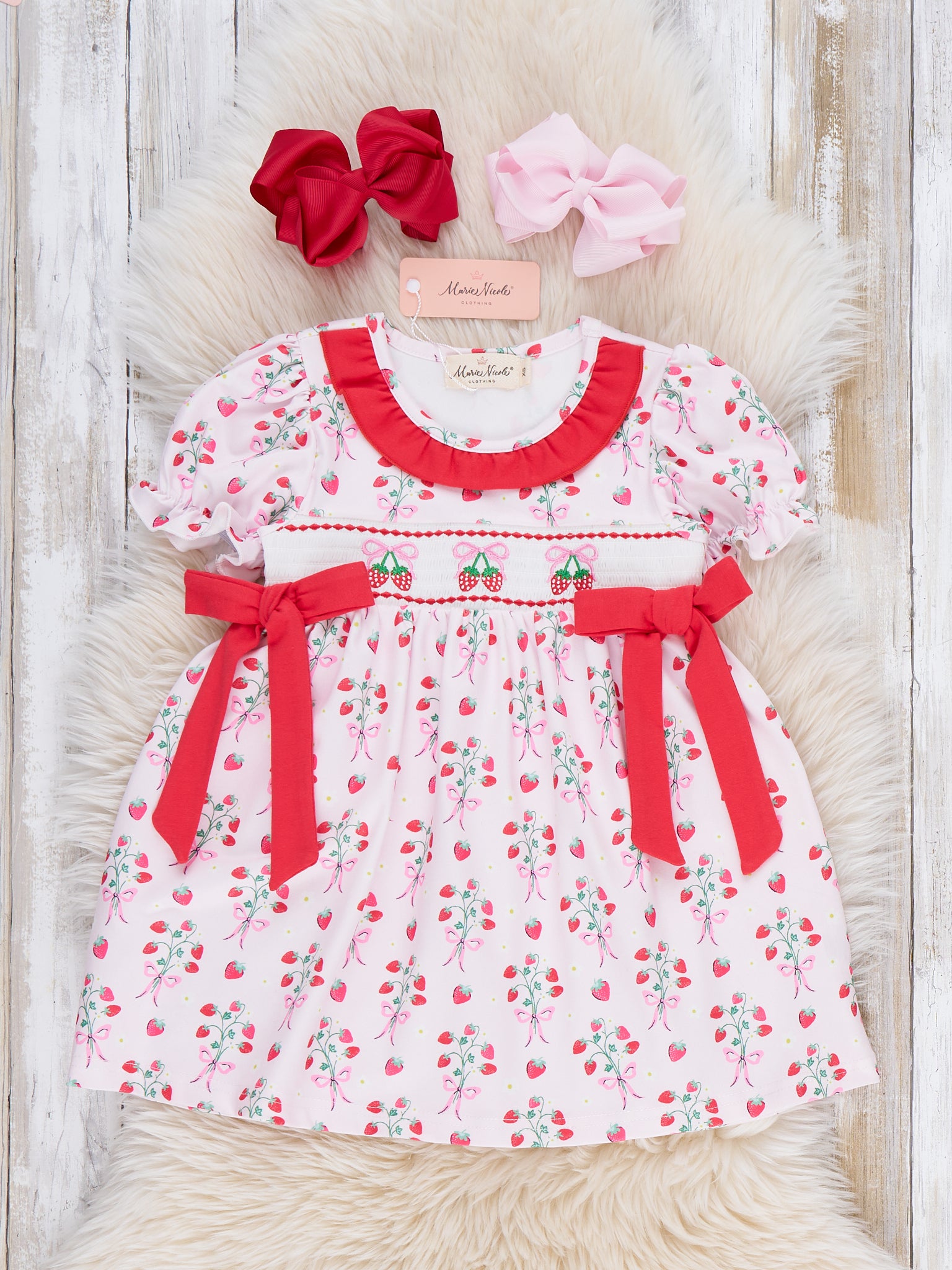 The Berry Bouquet Smocked Ruffle Dress by Marie Nicole Clothing gathers garden-party sweetness with its delicate berry print, puff sleeves, and ruffle-trim neckline. A smocked waist framed by bold bow accents adds charming detail, while the soft, twirl-ready skirt keeps little ones comfy and picture-perfect for celebrations, portraits, or sunny-day outings.