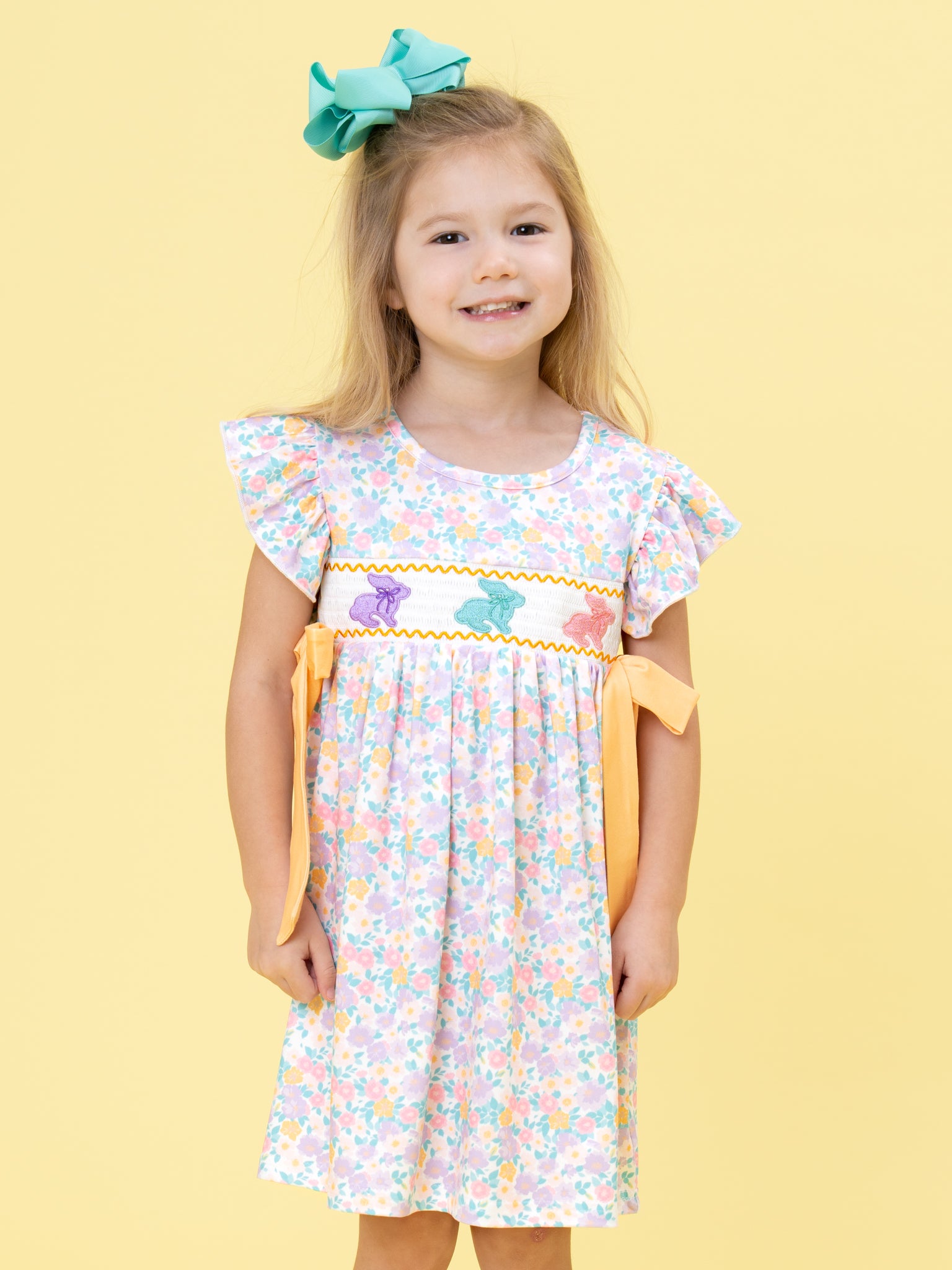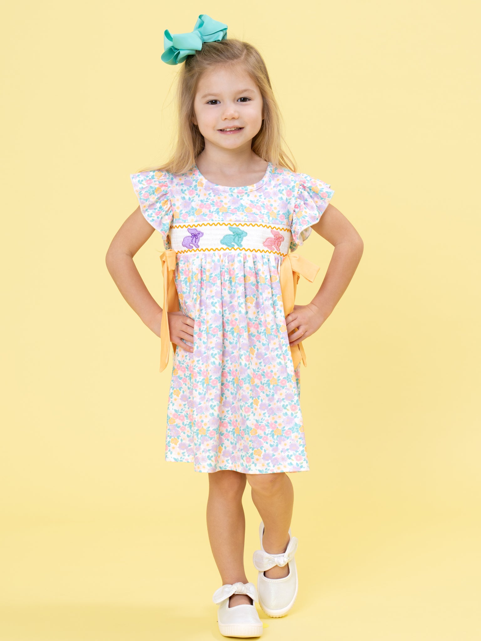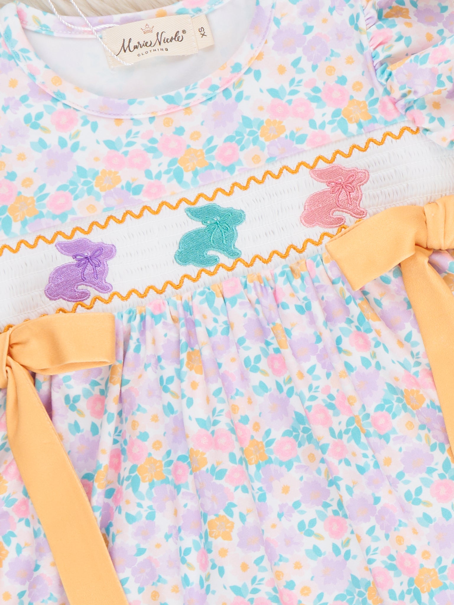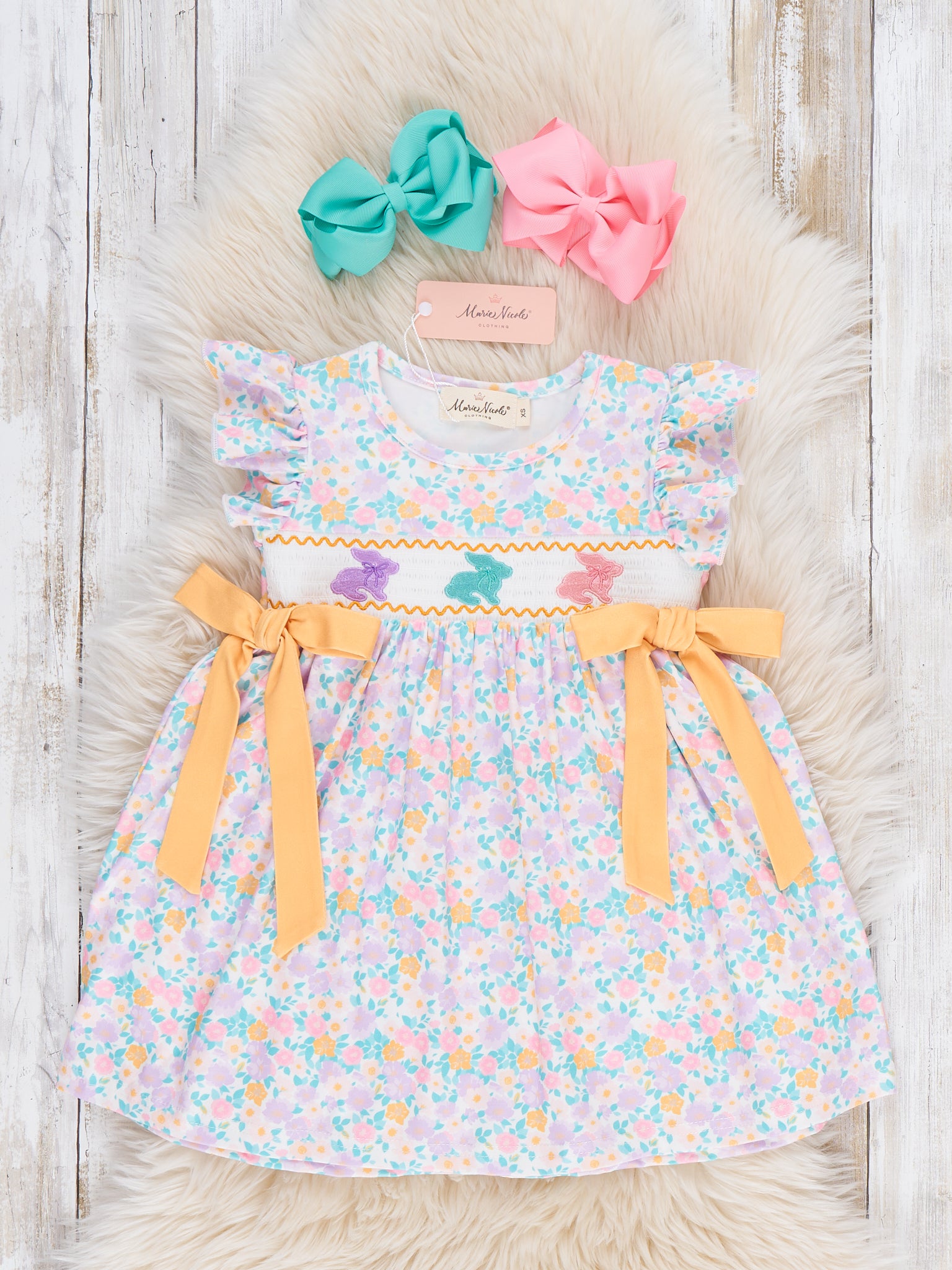 The Bunny Trio Floral Smocked Dress by Marie Nicole Clothing features a beautifully smocked bodice with three charming bunny silhouettes hopping across the front. Flutter sleeves and a wide sash that ties at the waist add extra sweetness and a customizable fit. Finished with an allover floral skirt, this twirl-ready dress is perfect for spring celebrations, egg hunts, and picture-perfect family moments.