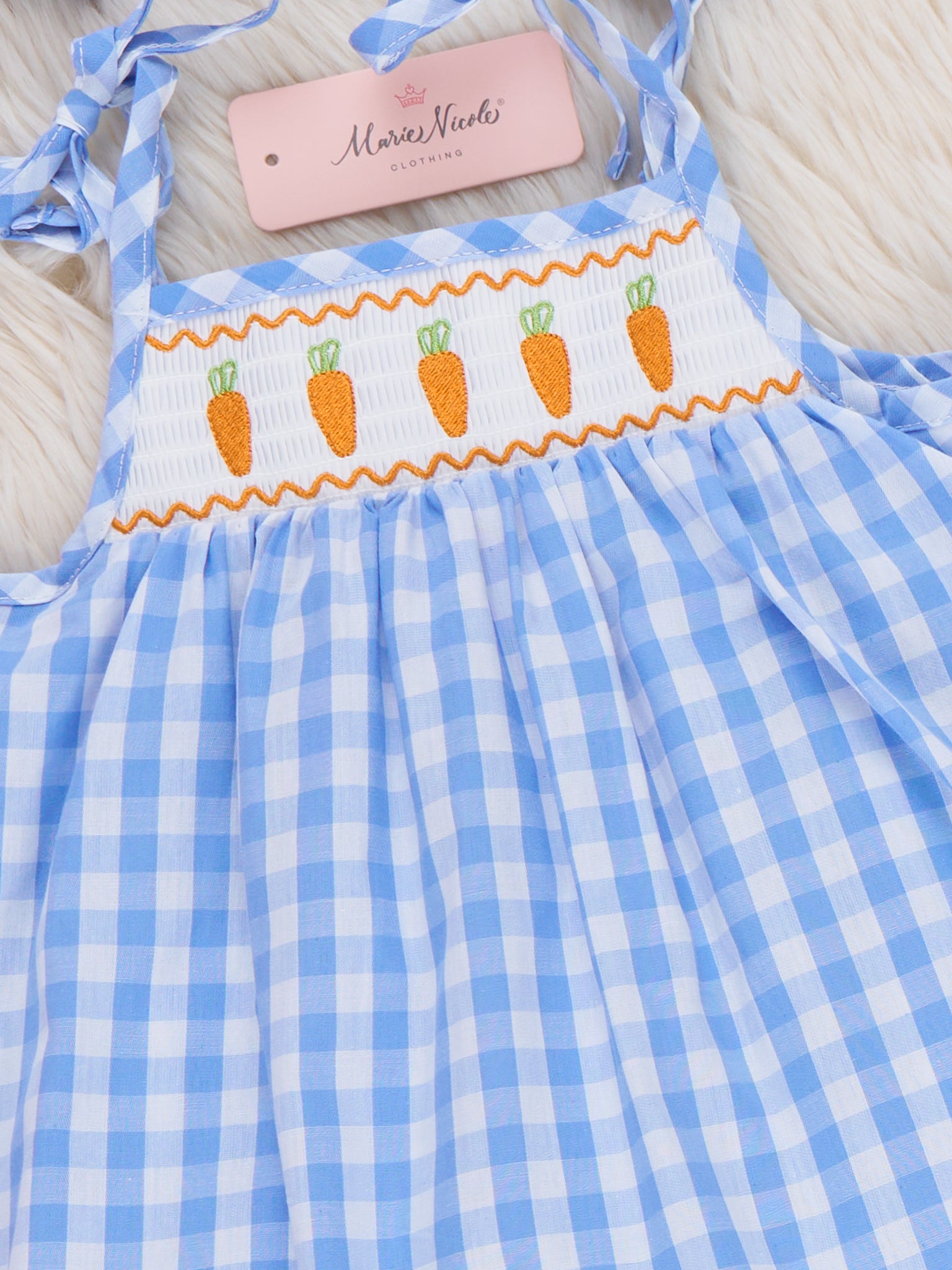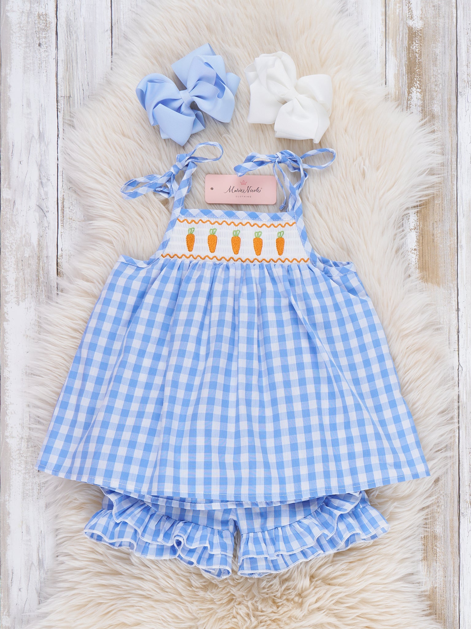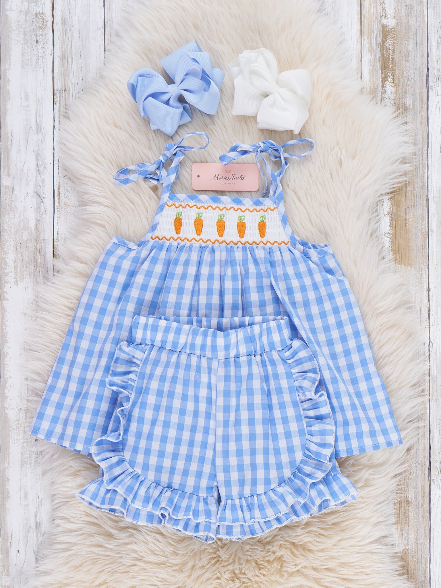 Carrot Parade Plaid Smocked 100% Cotton Outfit by Marie Nicole Clothing pairs a swingy gingham top with tie straps and a smocked carrot border with coordinating ruffle-hem shorts for a playful spring set. The soft, breathable fabric and elastic waist keep little ones comfy for egg hunts, park days, and picture-perfect Easter fun.