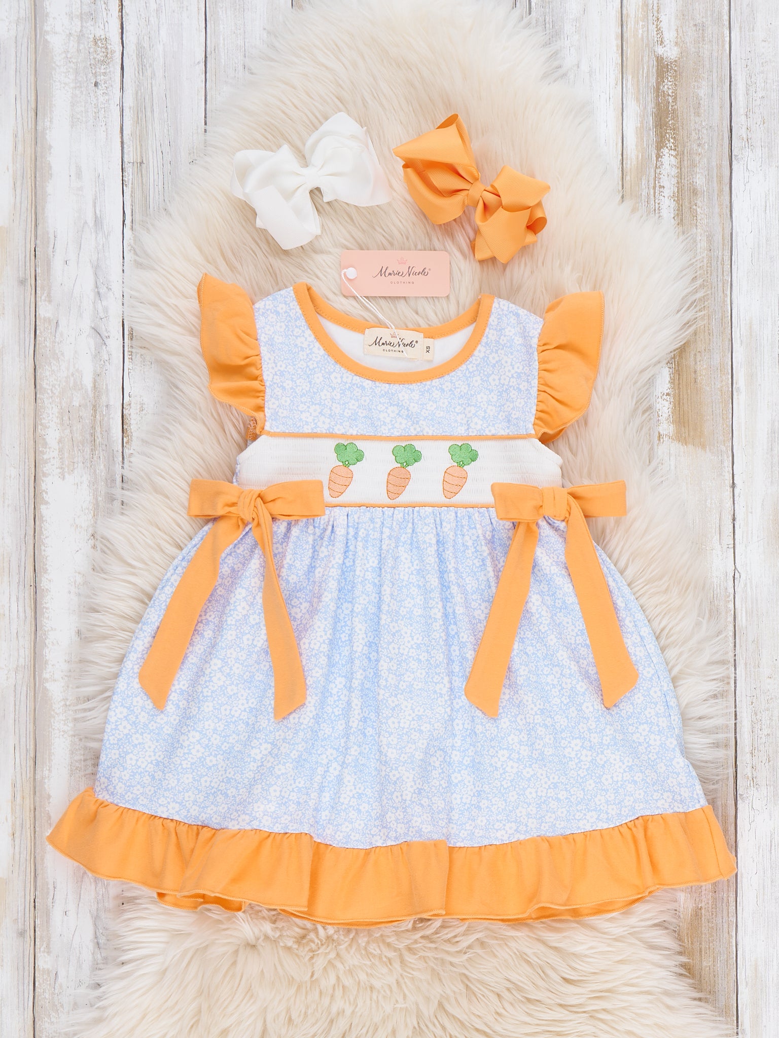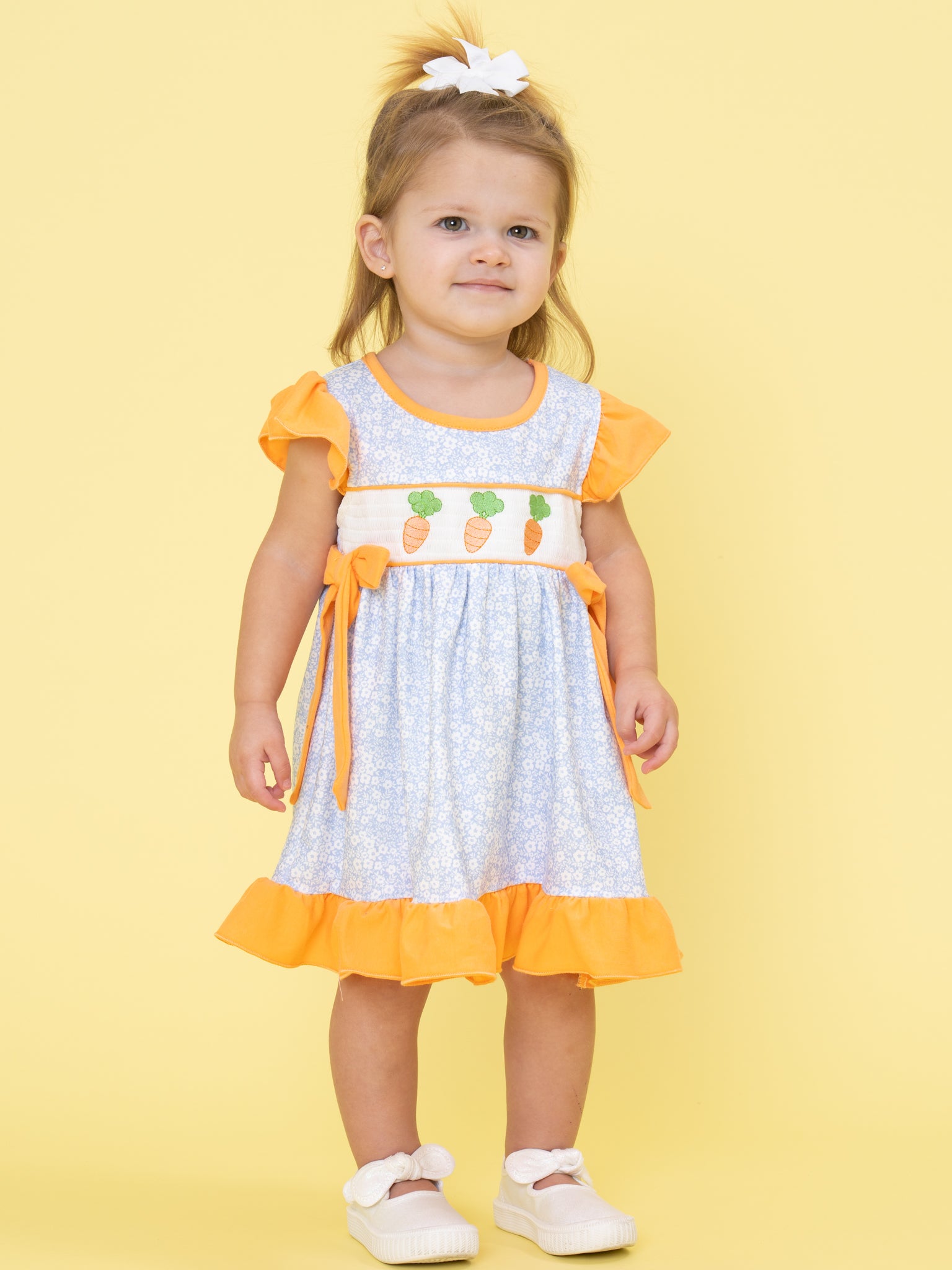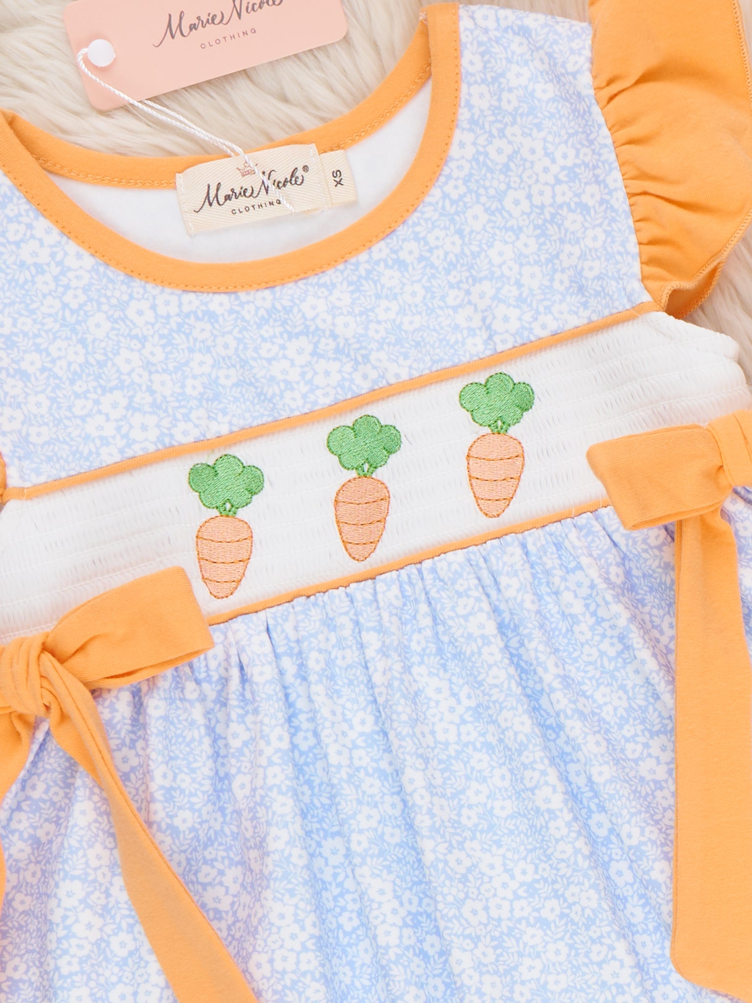 Carrots Trio Smocked Ruffle Dress by Marie Nicole Clothing features a smocked bodice with embroidered carrot accents, flutter ruffle sleeves, and playful side ties for a twirl-ready silhouette. The gathered skirt and comfortable fit make it ideal for spring festivities, family gatherings, or sweet everyday moments. Soft, easy-care fabric ensures cheerful style and movement for all-day wear.