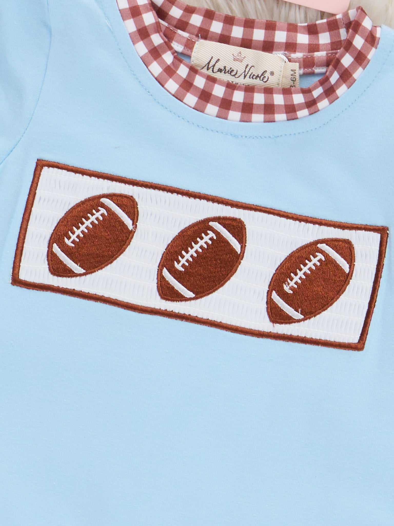 The Field Goals & Gingham Smocked Embroidered Romper is for the football lovers! This one-piece by Marie Nicole Clothing features embroidered footballs and charming gingham details. With promised comfort, your child will enjoy any kind of playing in this outfit!