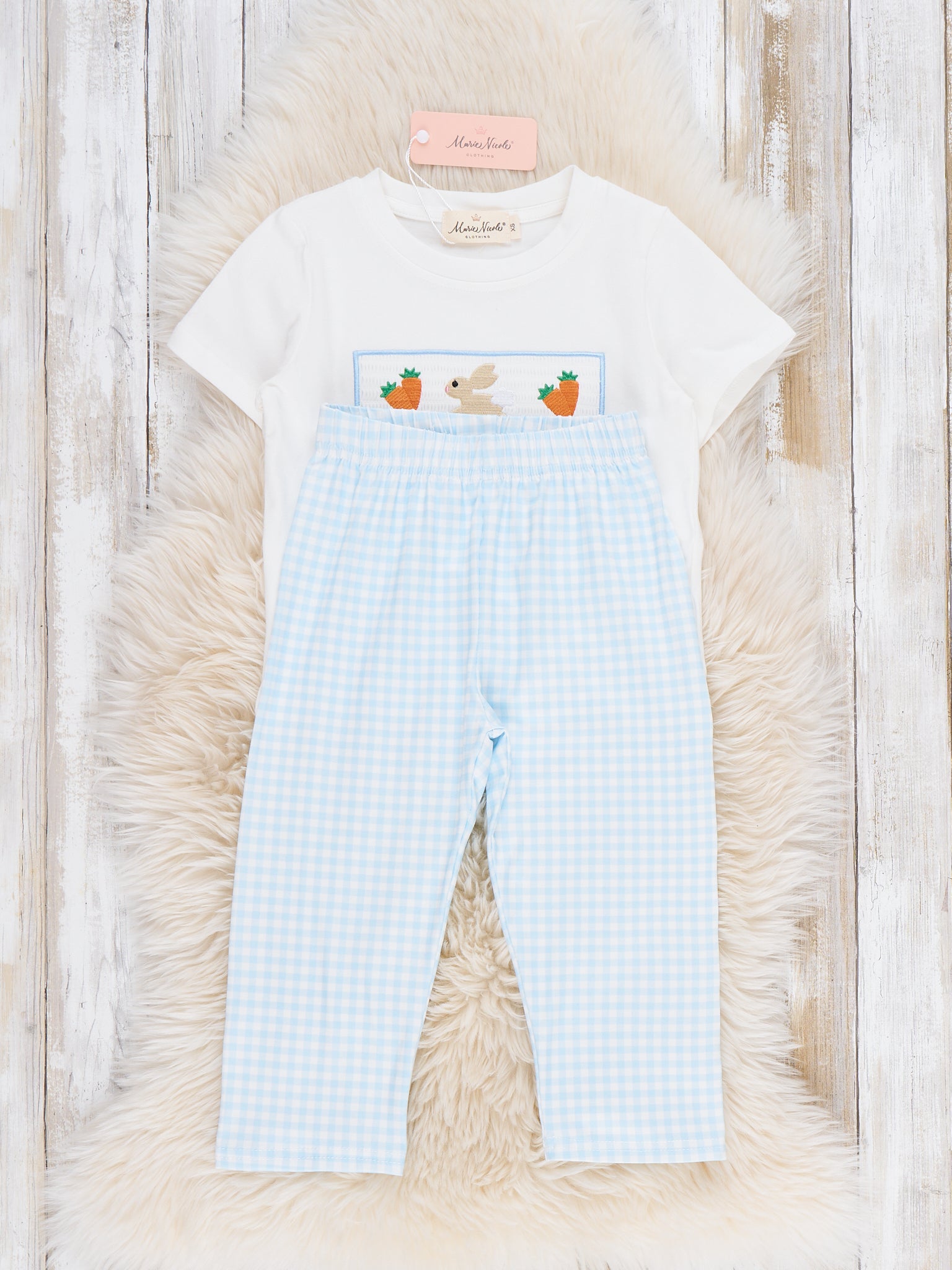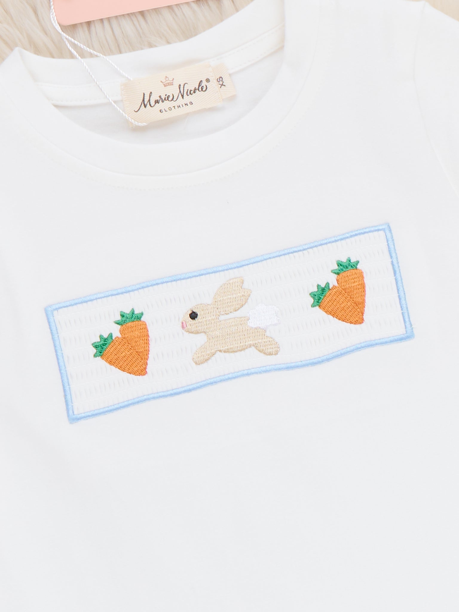 Blessed Bunny Smocked Outfit by Marie Nicole Clothing features a smocked panel with bunny, egg, and cross motifs for Easter sweetness. The cotton shirt provides comfort and playful movement, while the soft pants with an elastic waistband allow easy movement for playtime. Perfect for springtime celebrations, this piece is both classic and festive for special days.