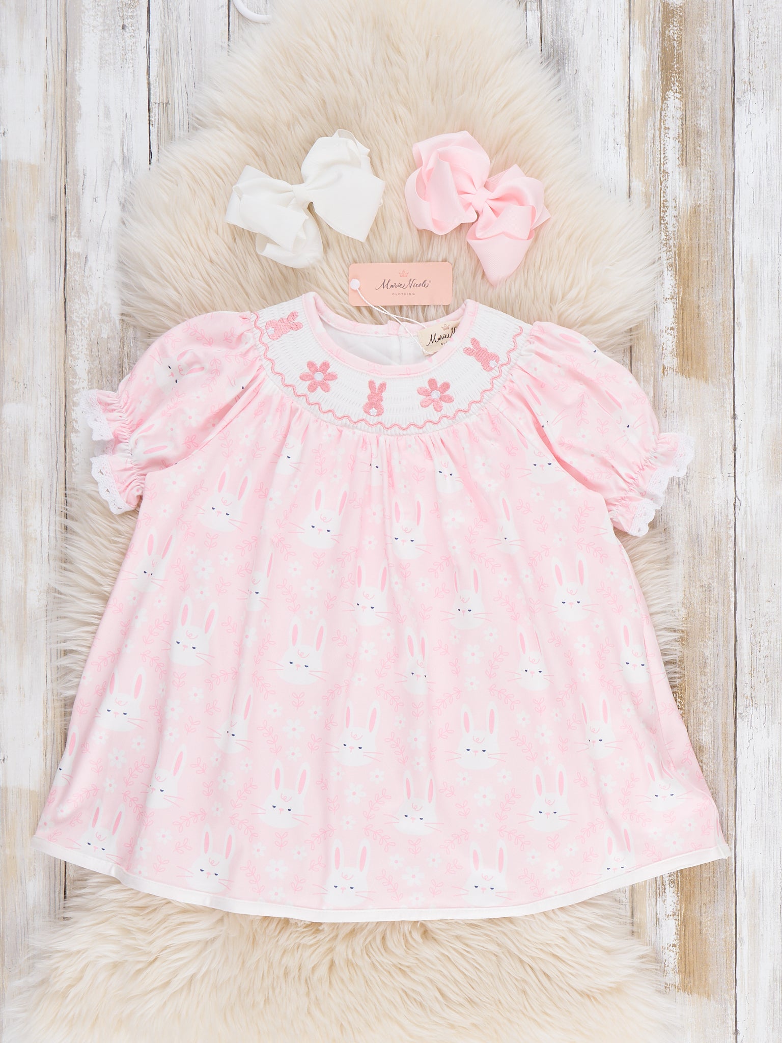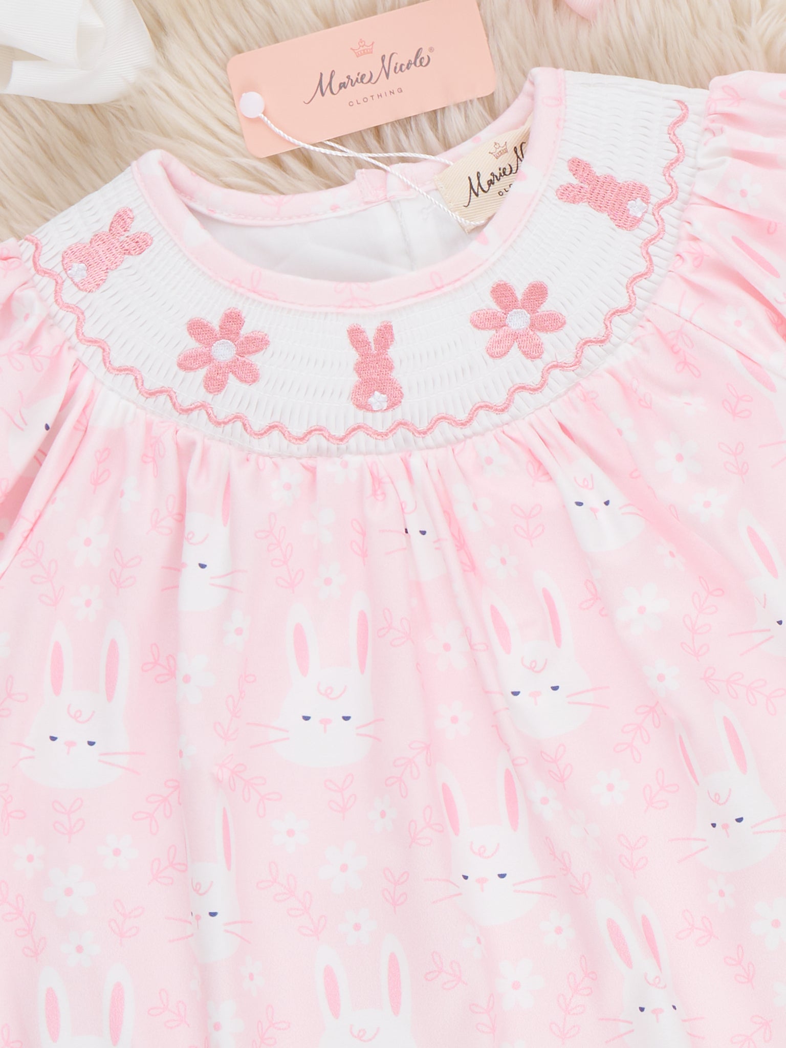 The Hoppy Bunnies Smocked Ruffle Dress by Marie Nicole Clothing hops into spring with its smocked bodice, puffed sleeves, and playful bunny motifs for festive charm. Gathered skirt and ruffle hem add twirly bounce for joyful movement, while soft stretchy fabric ensures all-day comfort during adventures. Perfect for Easter photos, family brunches, or gatherings full of boutique sweetness.