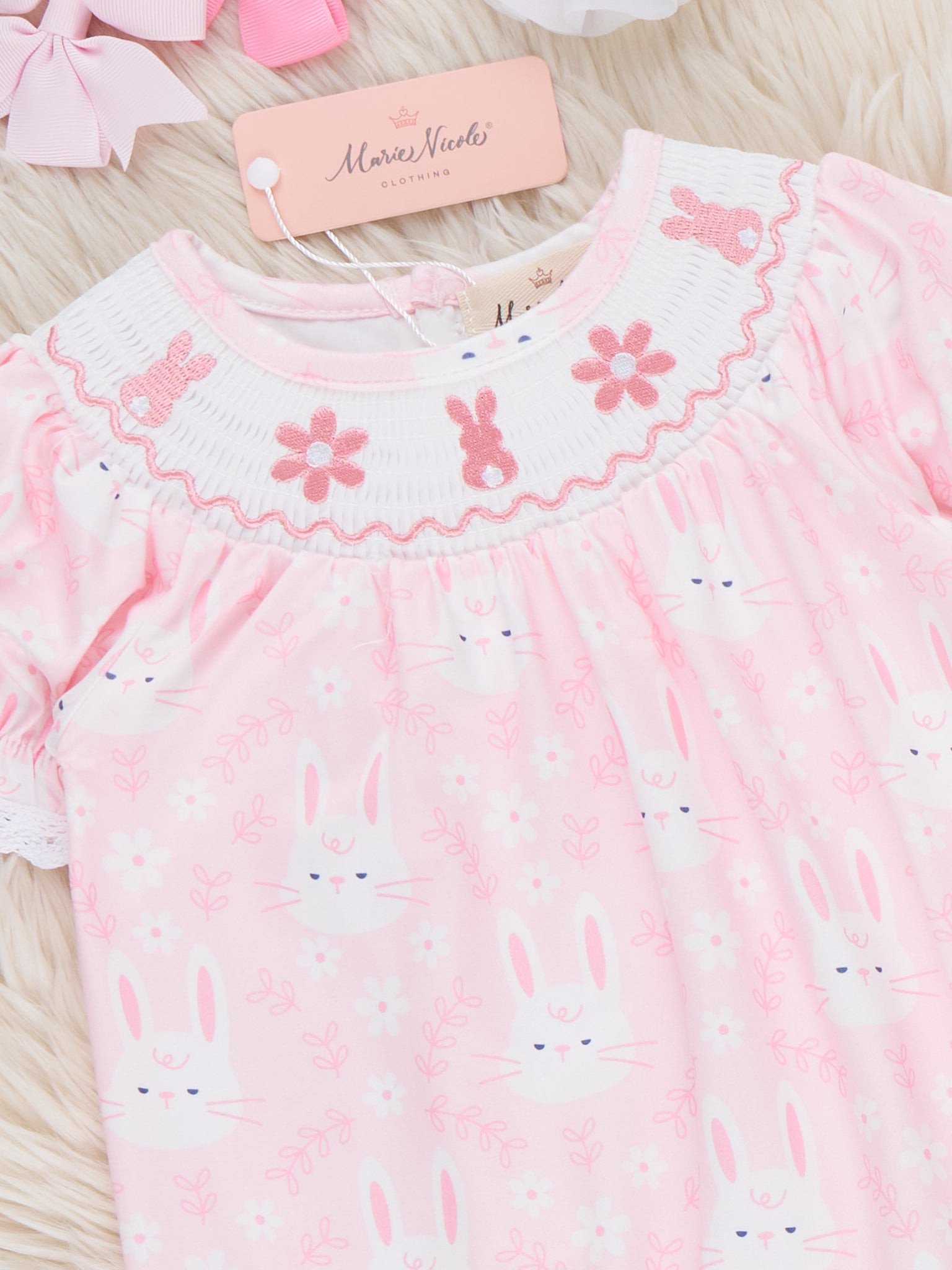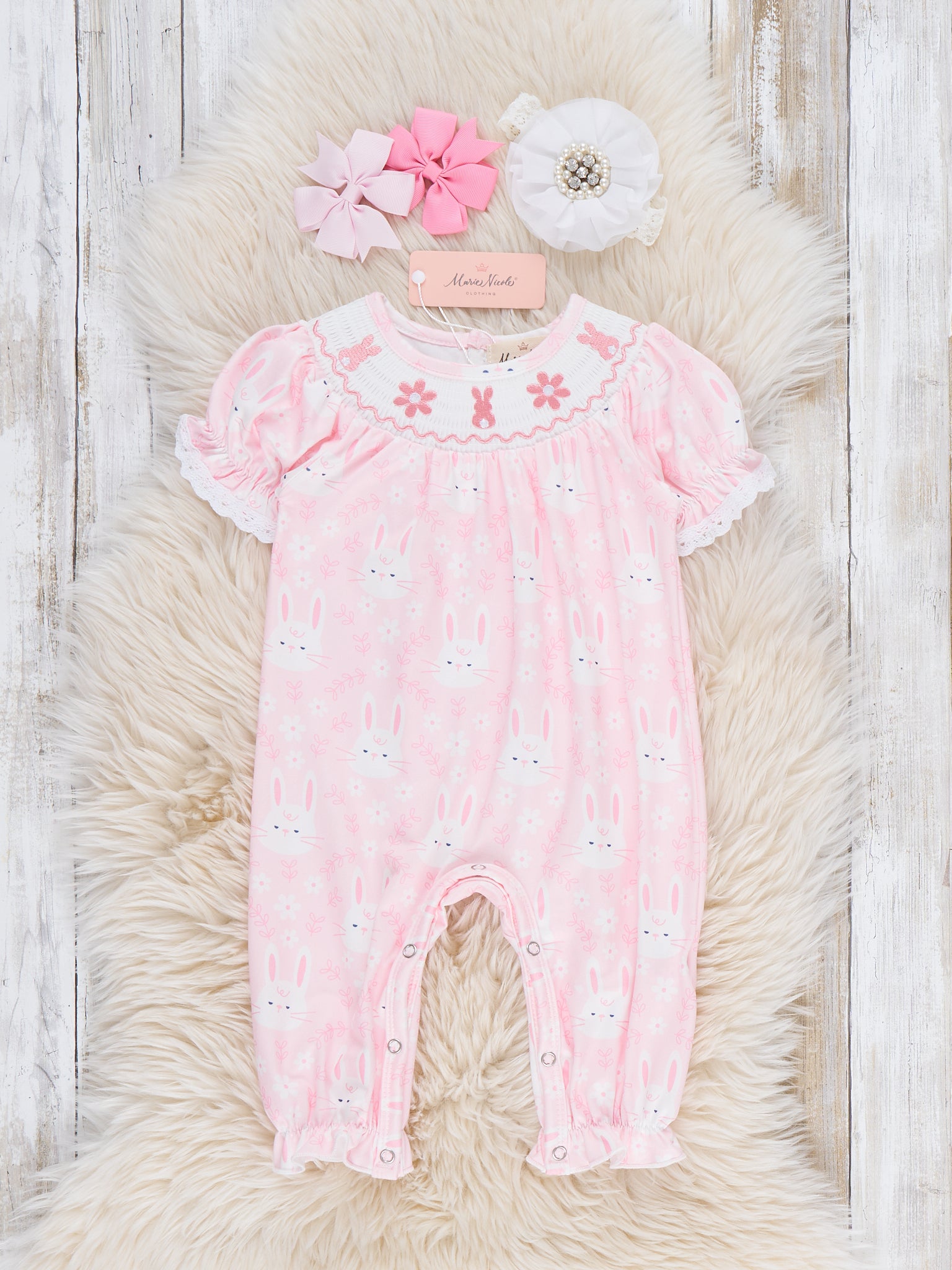 The Hoppy Bunnies Smocked Ruffle Romper by Marie Nicole Clothing brings spring bounce with its smocked bodice, puffed sleeves, and playful bunny motifs for festive charm. Romper silhouette and ruffle cuffs add wiggly fun for active play, while soft stretchy fabric ensures snug all-day comfort. Perfect for Easter egg hunts, family photos, or joyful gatherings full of boutique sweetness.