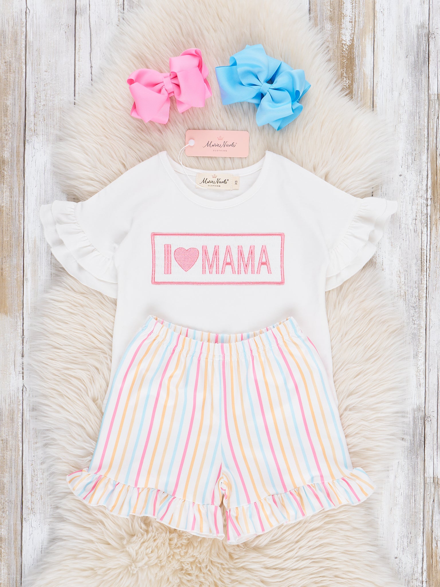 This Striped "I Love Mama" Smocked Ruffle Outfit by Marie Nicole Clothing is perfect for Mother's Day! This outfit features a white top with smocking, ruffles, an embroidered "I Love Mama" detail, & striped shorts with an elastic waistband. So full of love!