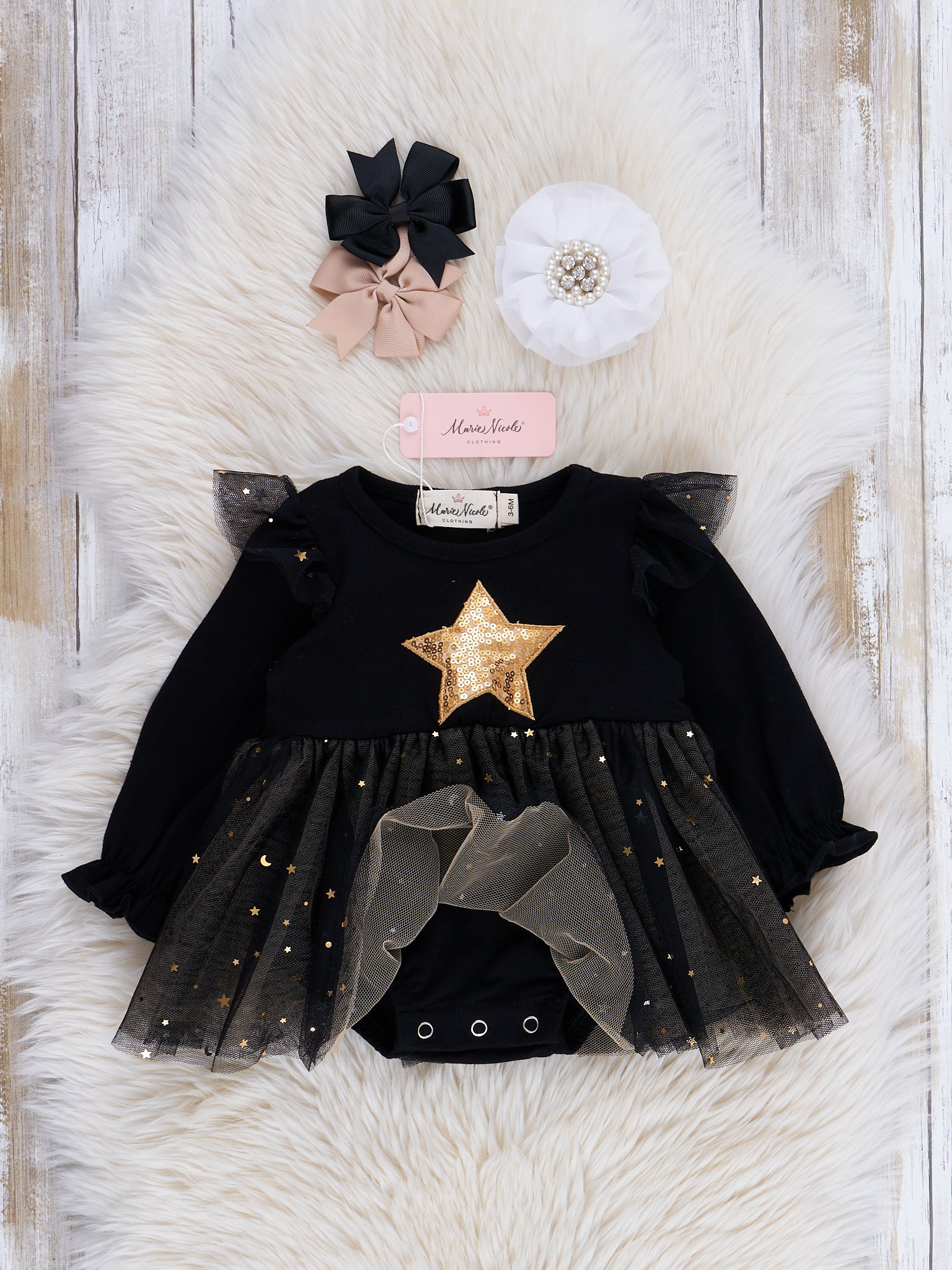 Your little ones will be the star of the show in this sassy sister set! The black fully lined tulle bubble features gold star detail on the bodice that sparkles and shines so she can sparkle like the star she is! Perfect for special occasions and family photos. (Let's face it - she'll look slayin' no matter what!) ⭐️