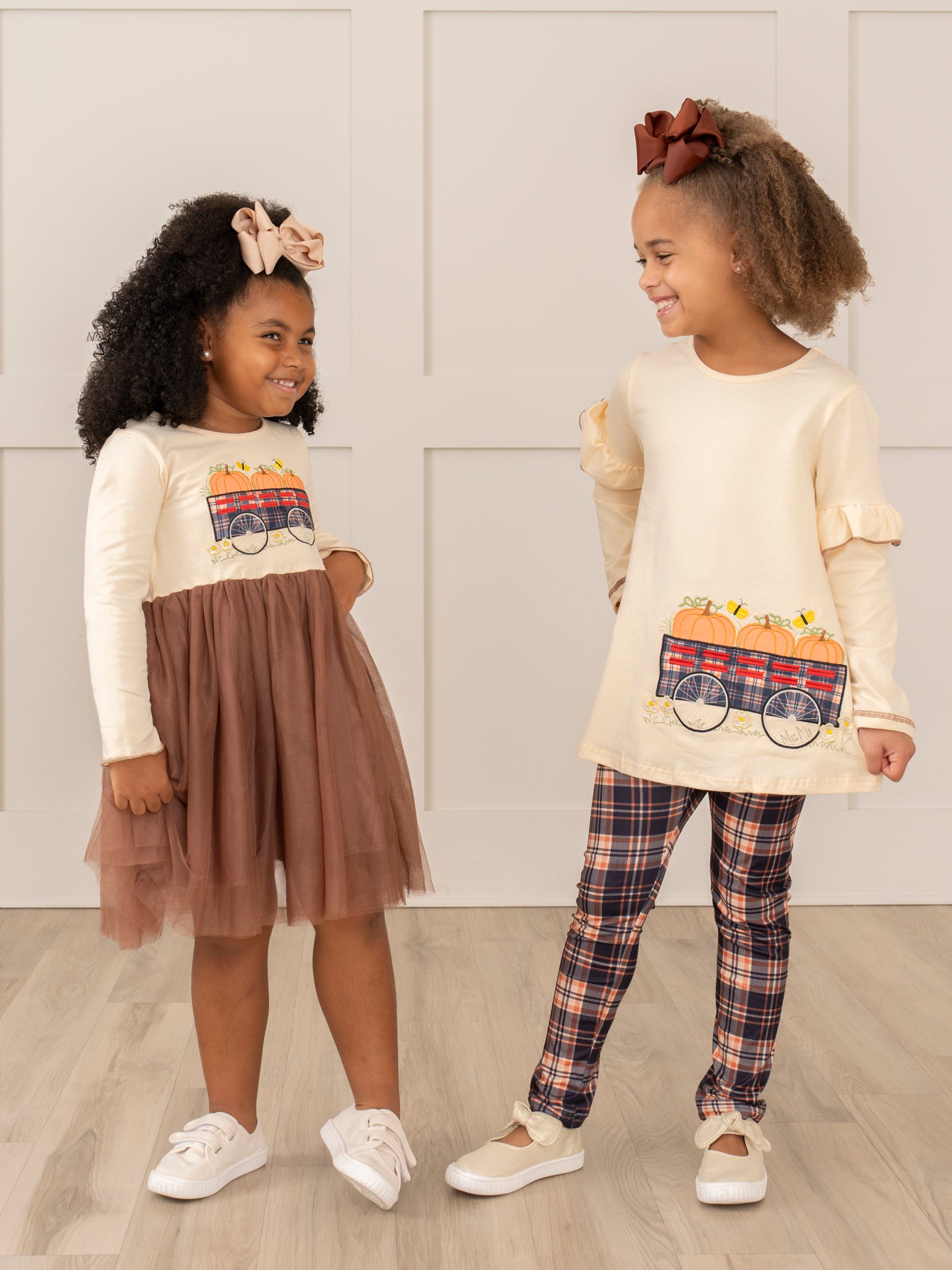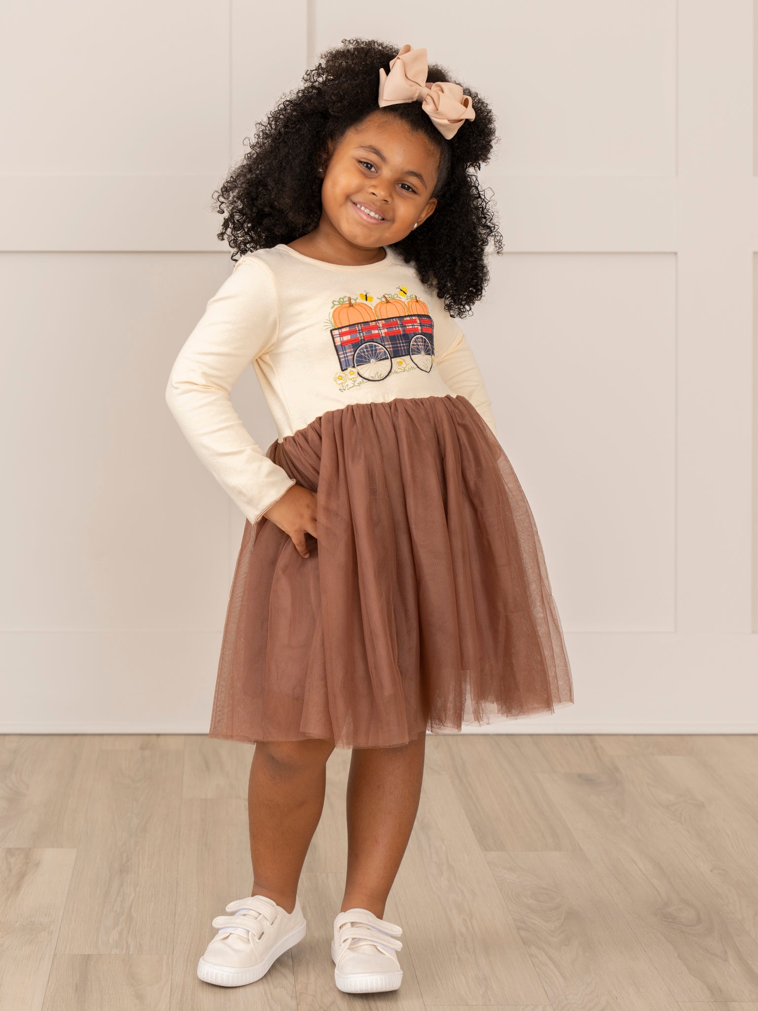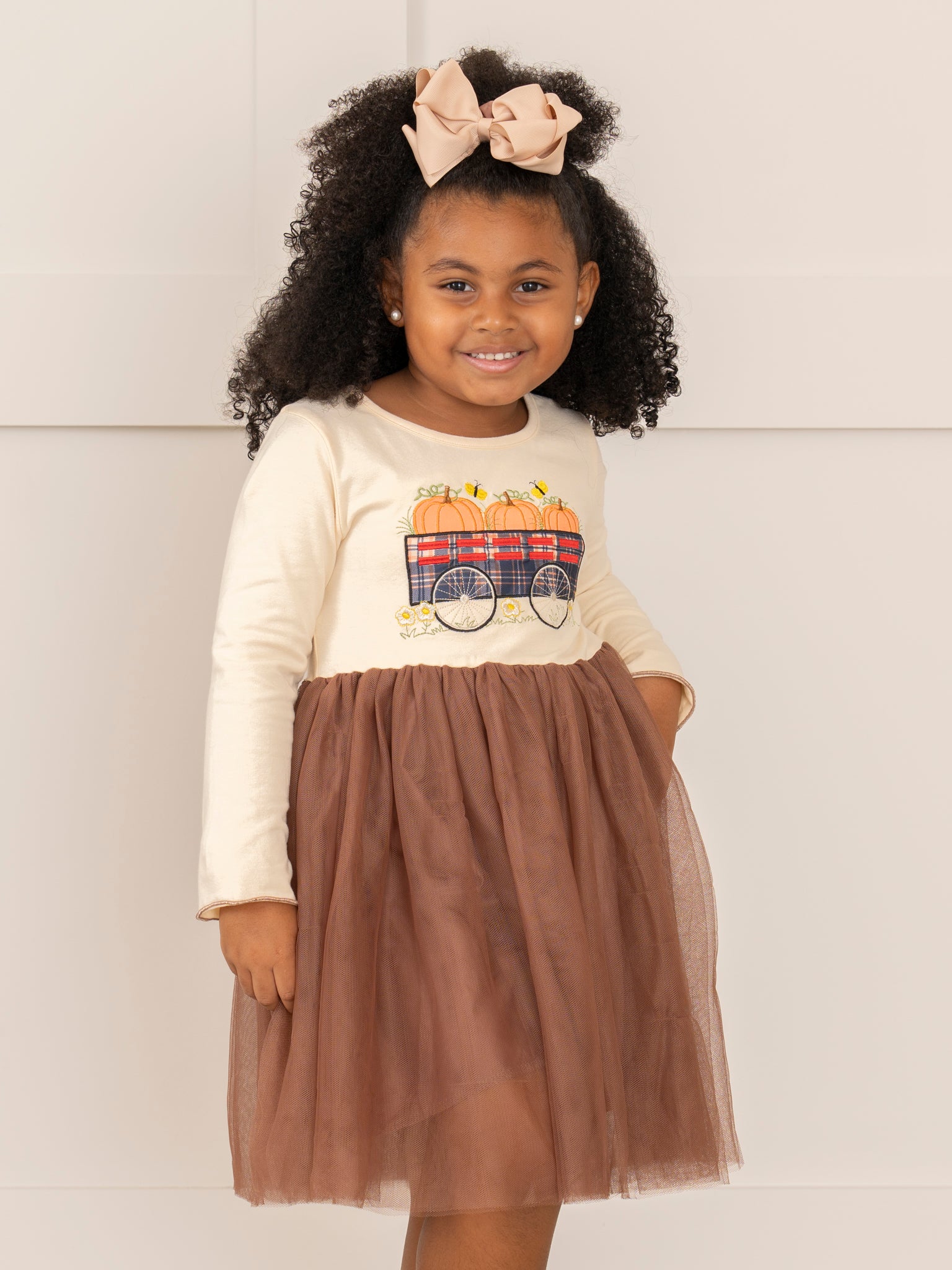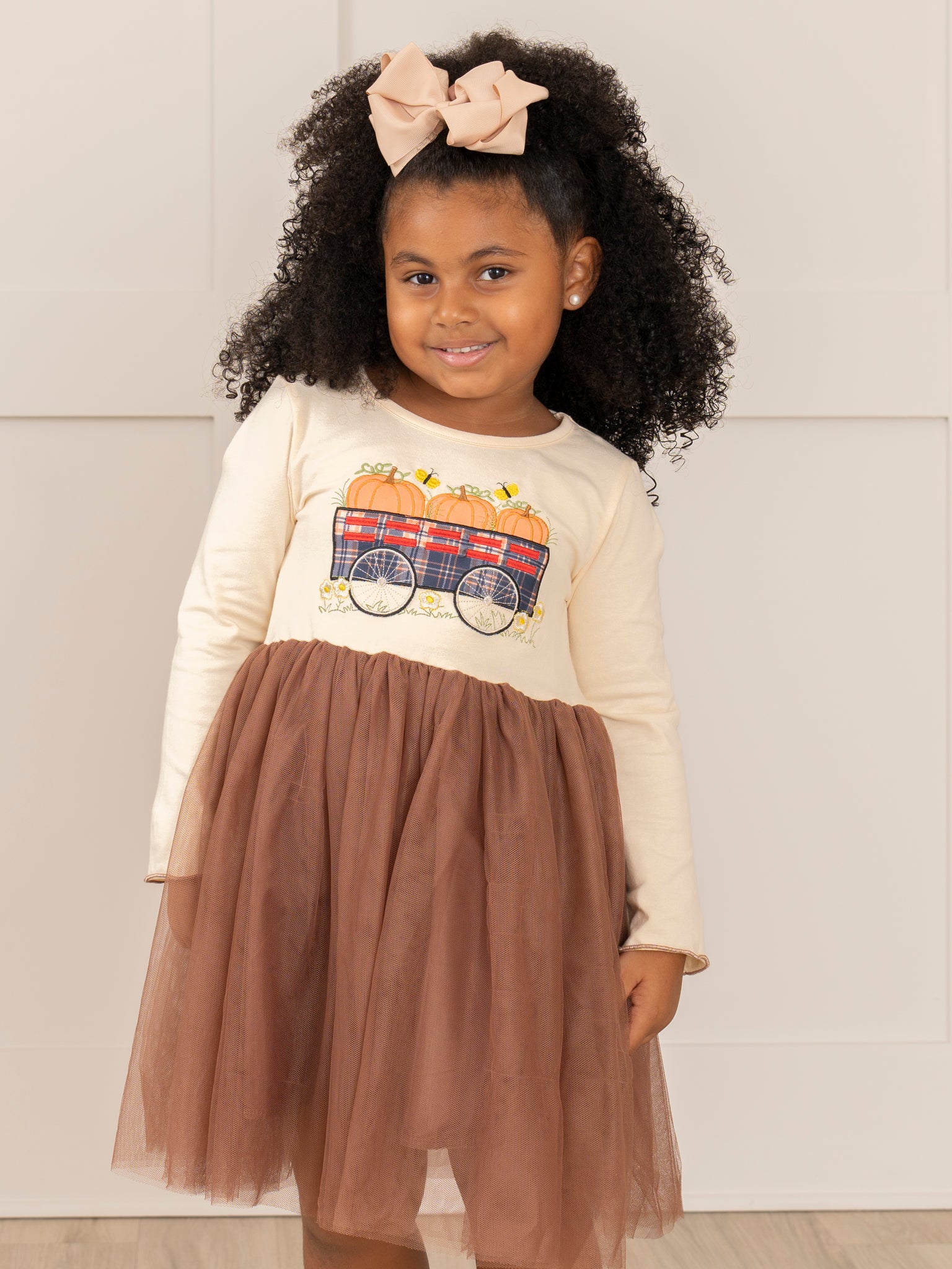 Get your little pumpkin ready for fall with this adorable sister set! Featuring a brown tulle skirt plus an embroidered wagon with pumpkins, this dress is perfect for any twirling autumn adventure. Plus, it's the perfect opportunity for some sisterly matching!