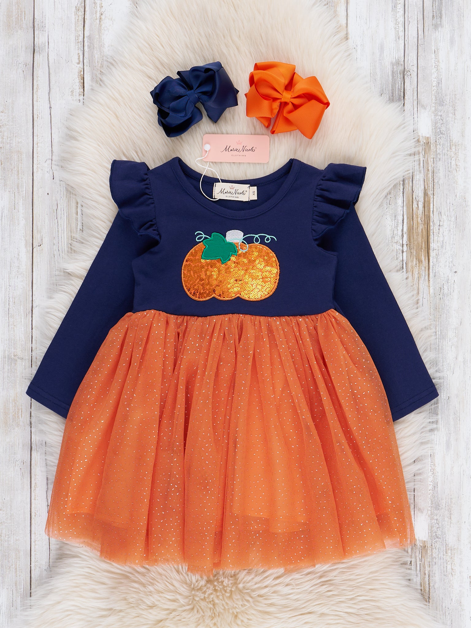 The Embroidered Sparkle Pumpkin Ruffle Tulle Dress is a stunning piece for Halloween parties and celebrations. This Marie Nicole Clothing piece shines with its glittery, embroidered pumpkin, ruffled shoulders, and sparkly tulle skirt. Crafted with soft fabric, it impresses while staying comfortable for taking pumpkin patch visits, Halloween pictures, and exciting events.