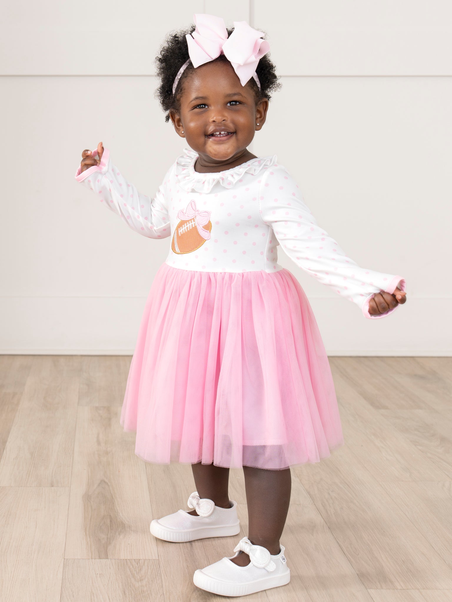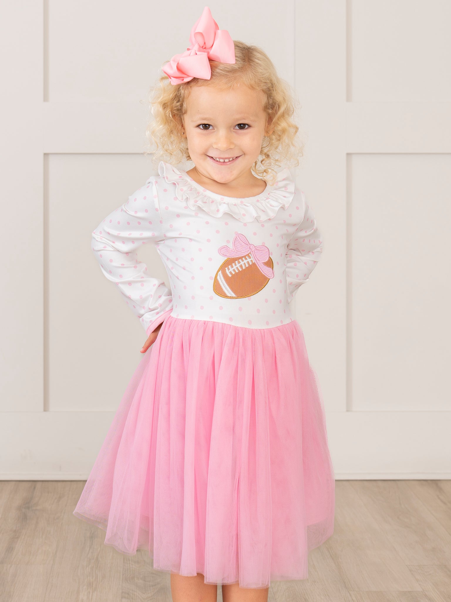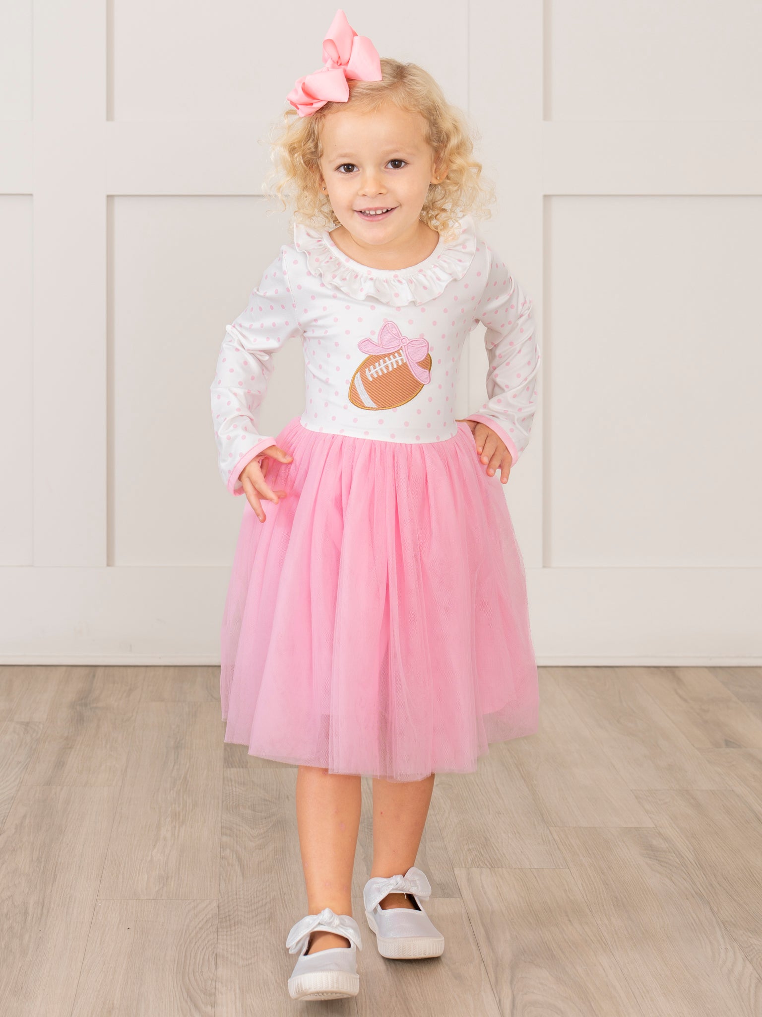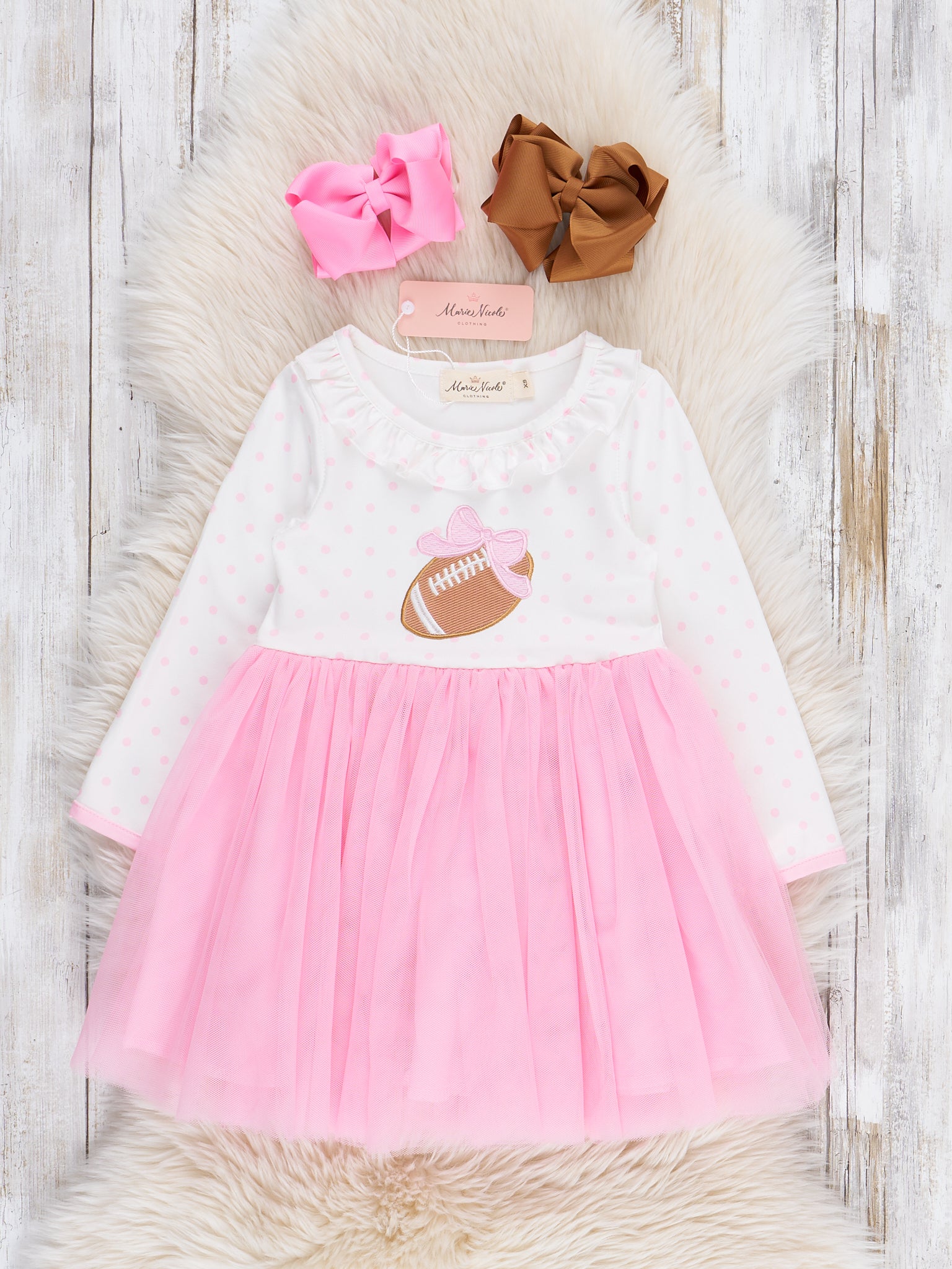 The Kickoff Cutie Embroidered Football Tulle Dress is the perfect pick for all your gameday celebrations! With a twirl-perfect tulle skirt and a cute, embroidered football, this Marie Nicole Clothing dress is an adorable piece for any football lover or cheerleader. With long sleeves and soft, comfortable fabric, your girl will be cheerful all day!