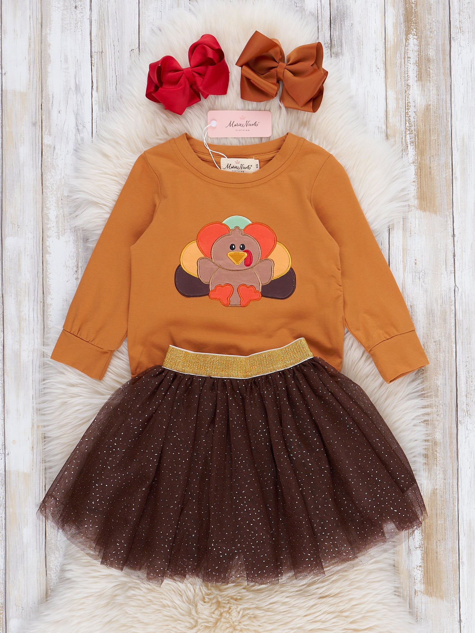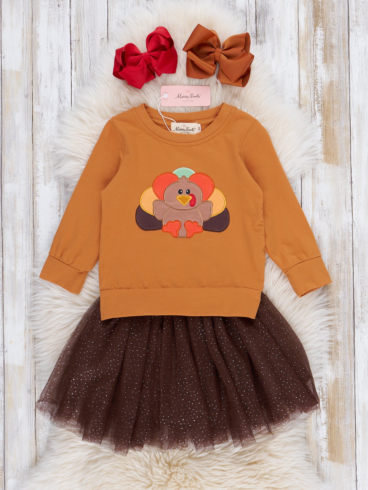 Orange & Brown Sparkle Embroidered Turkey Outfit w/ Tulle Skirt