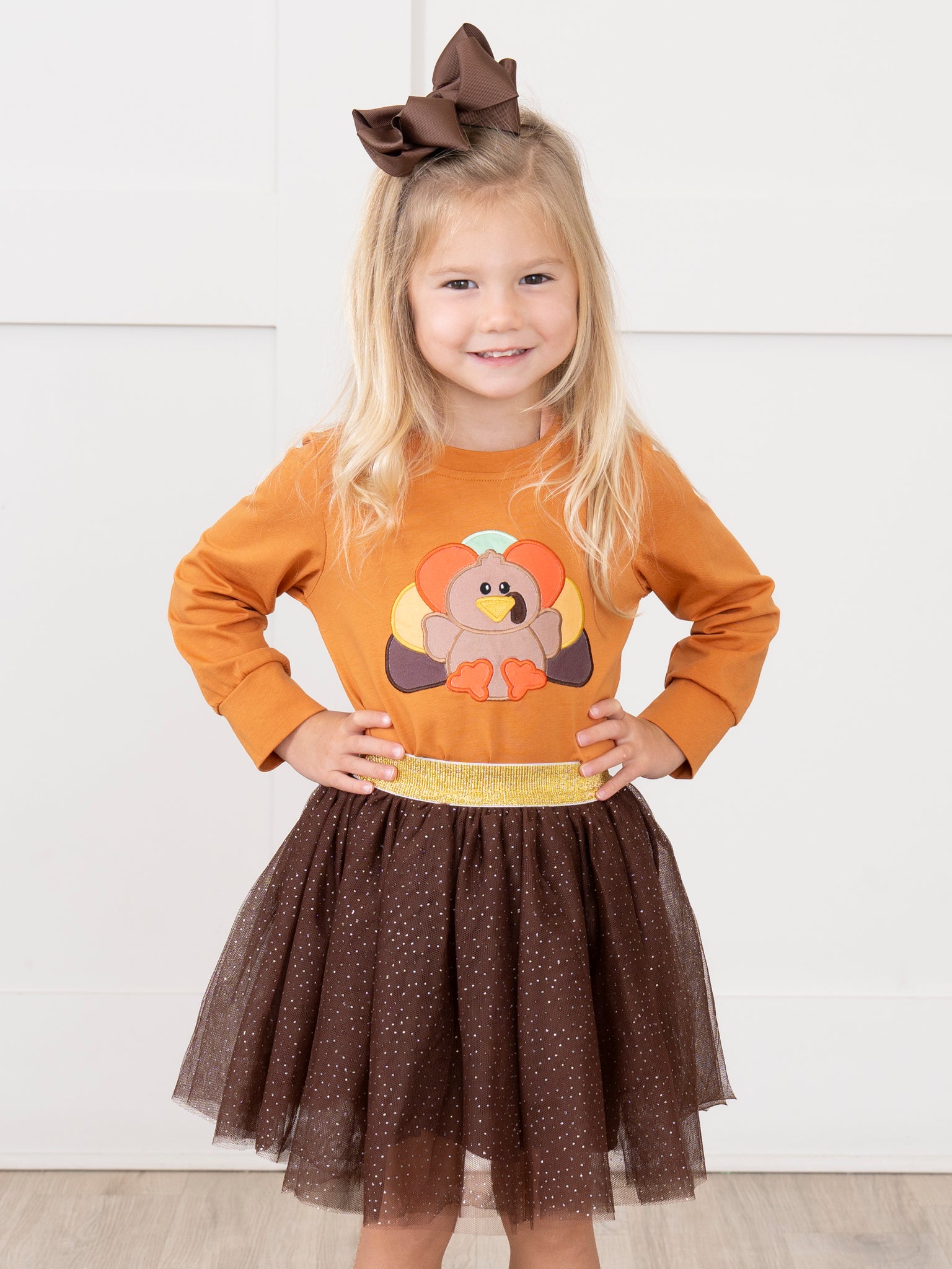 This playful outfit is perfect for your little turkey! Featuring an embroidered turkey and deep brown tulle skirt, it's a stylish choice for any occasion. Plus, it's part of our sibling set collection for a fun matching look. Gobble it up before it's gone!