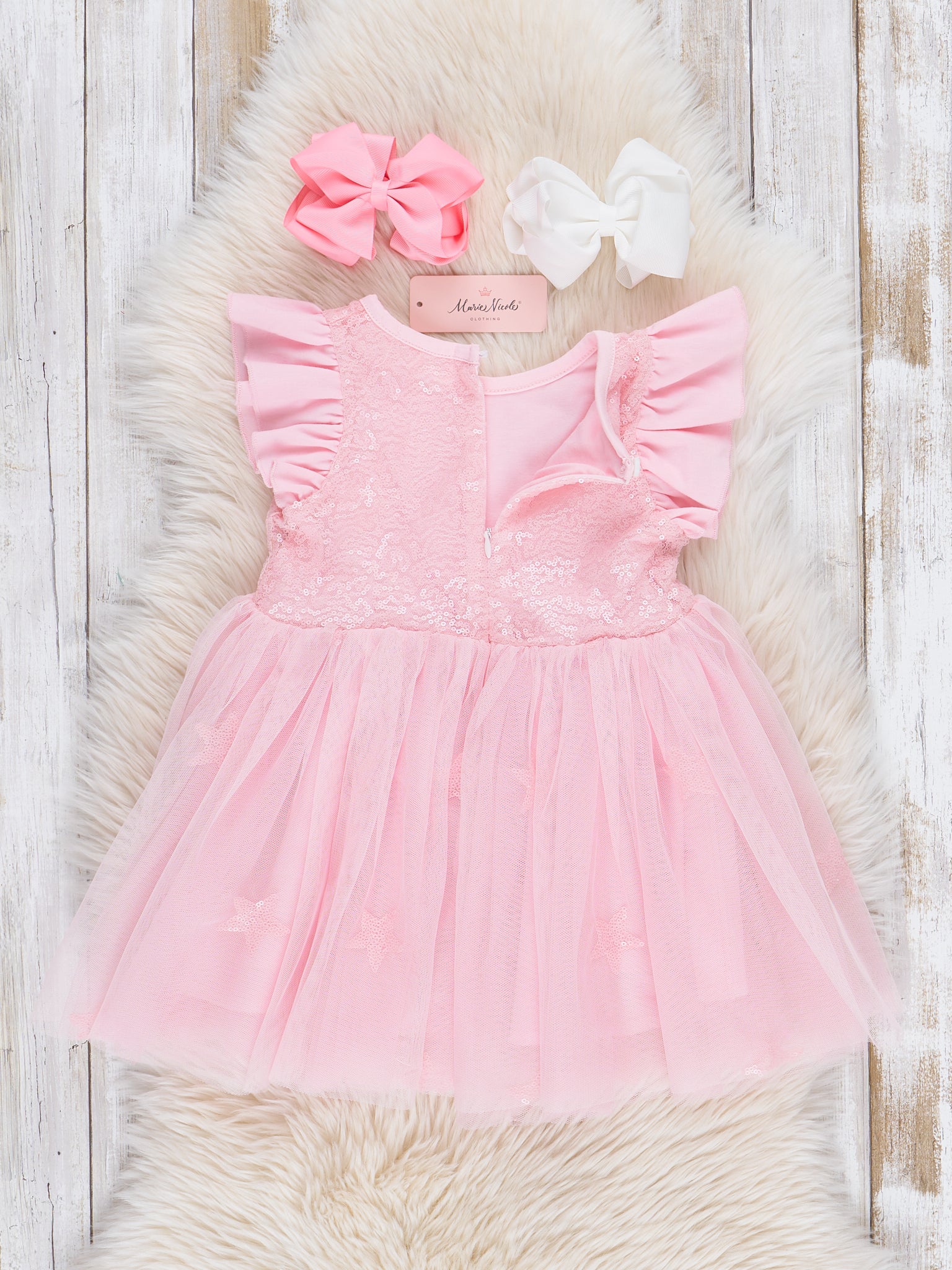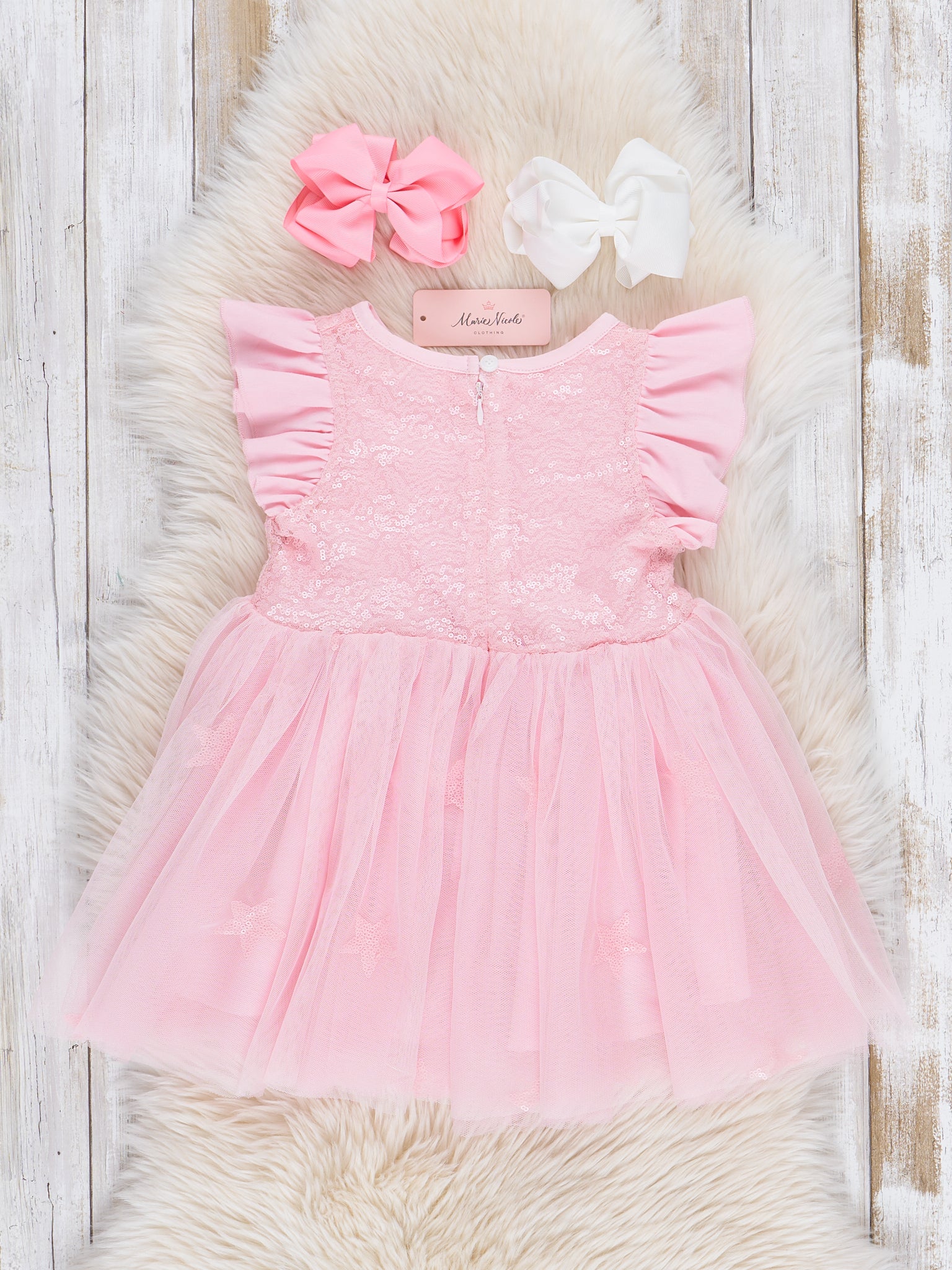Bring the magic to any occasion with our Pink Starry Flutter Tulle Dress! This sparkling creation features a pink sequin bodice and a whimsical pink tulle skirt adorned with shimmering sequin stars. Perfect for any little girl who loves to shine like a star.