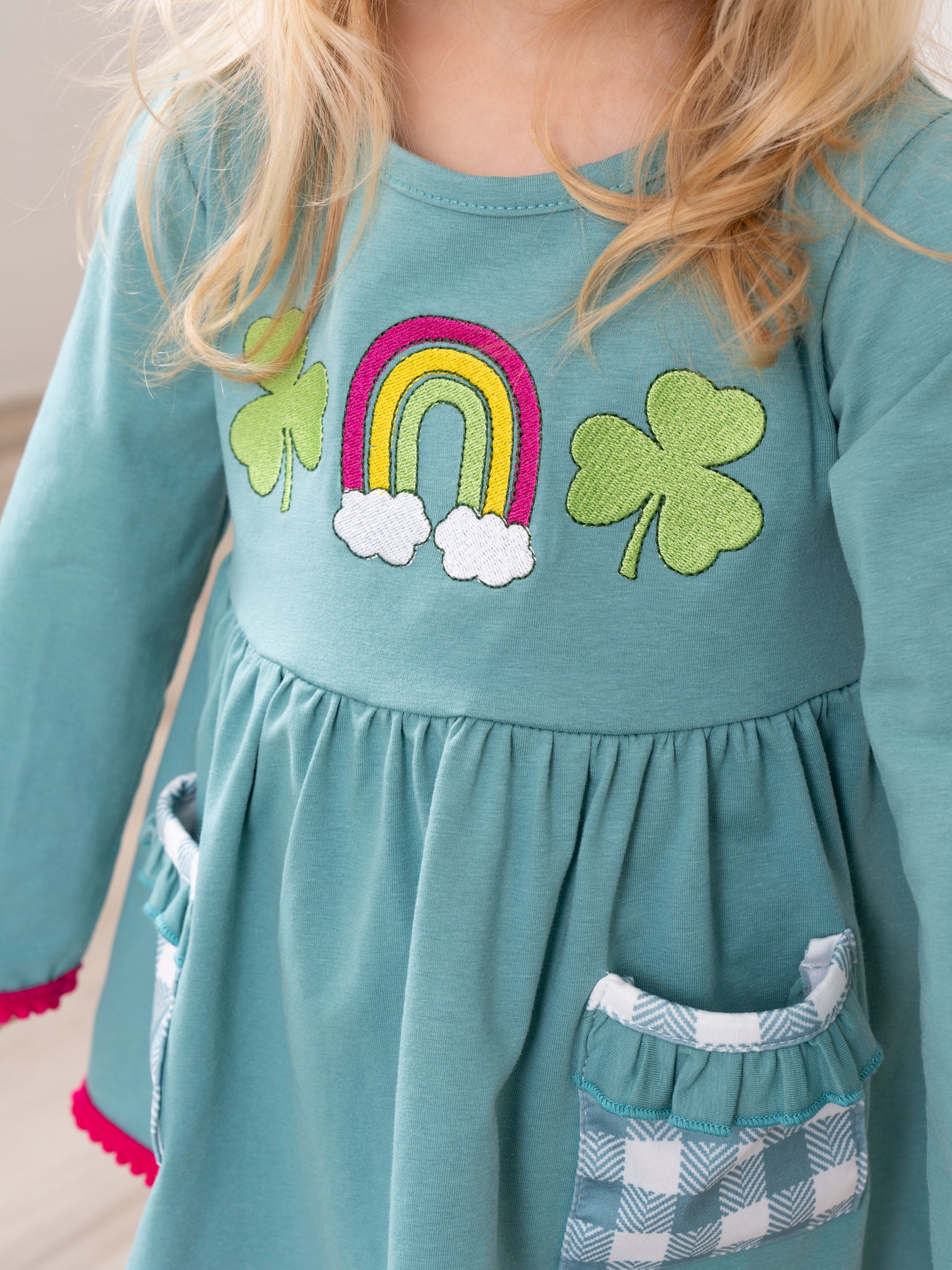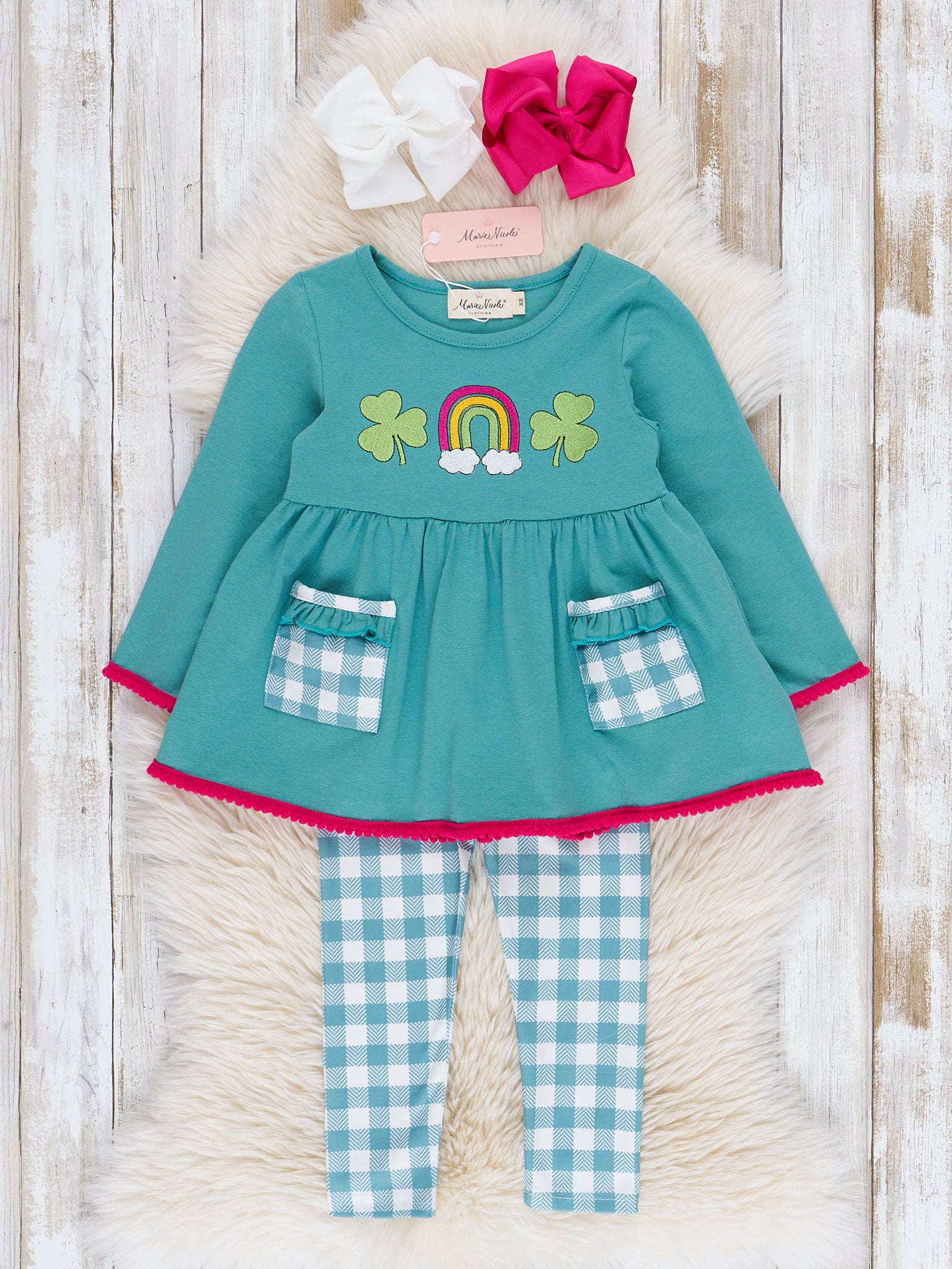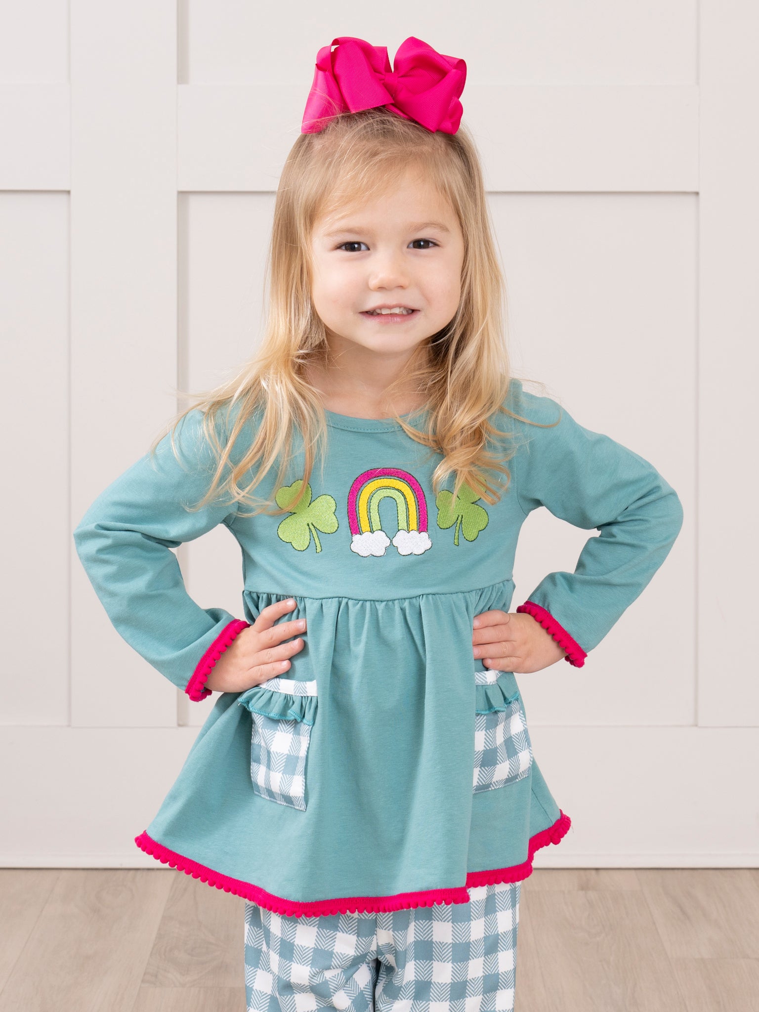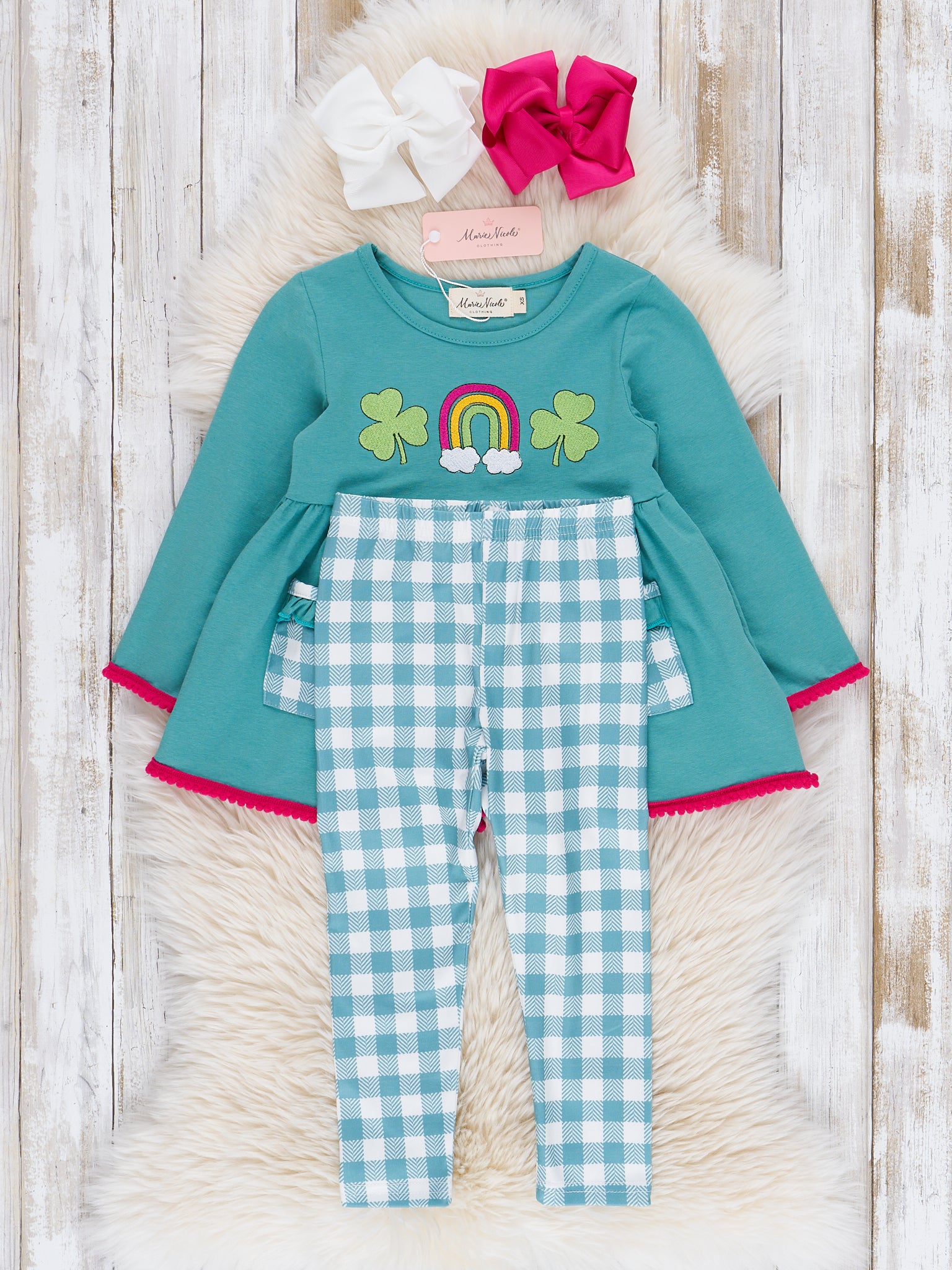 This Rainbow Clover Field Gingham Romper is the gold at the end of the rainbow! This turquoise blue outfit by Marie Nicole Clothing features gingham pants & a pocket tunic with embroidered clovers and a rainbow. It is perfect for spring and St. Patrick's Day.