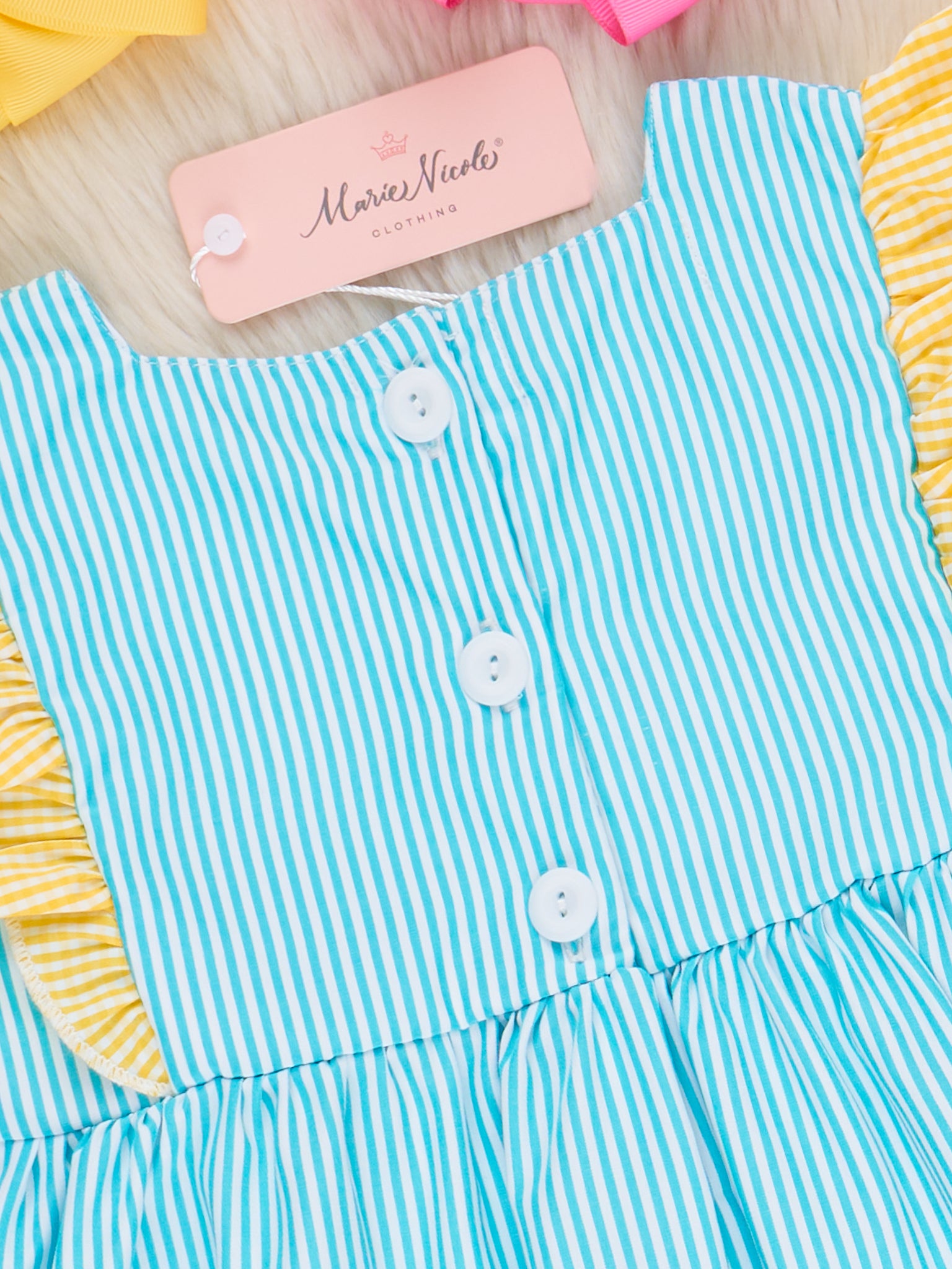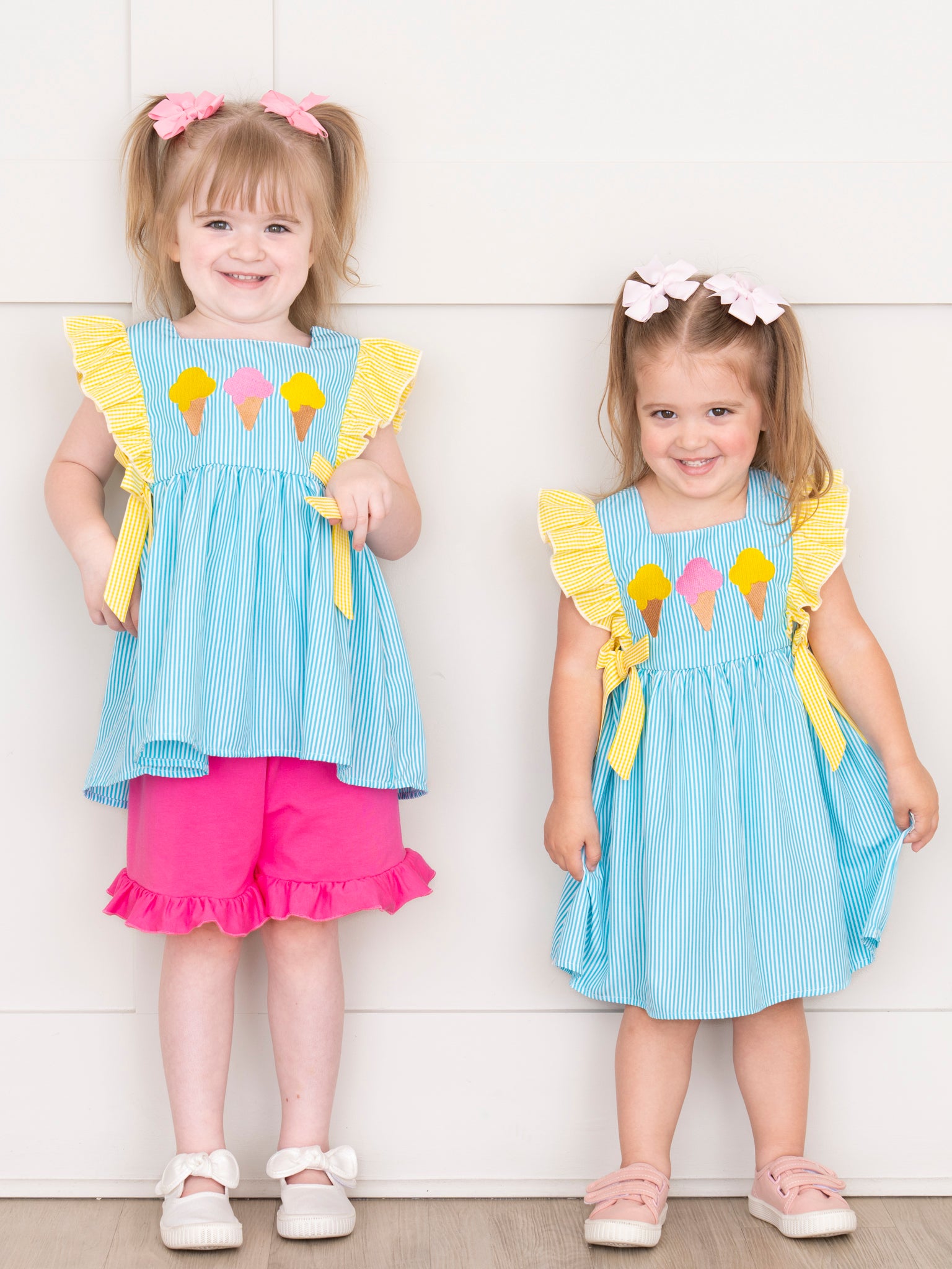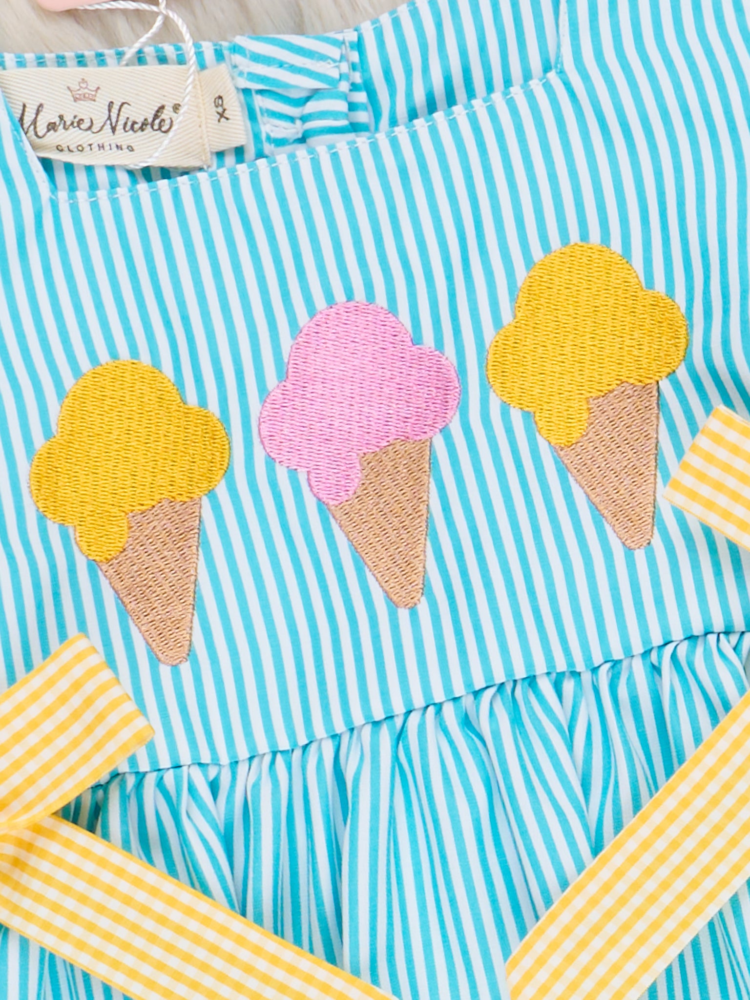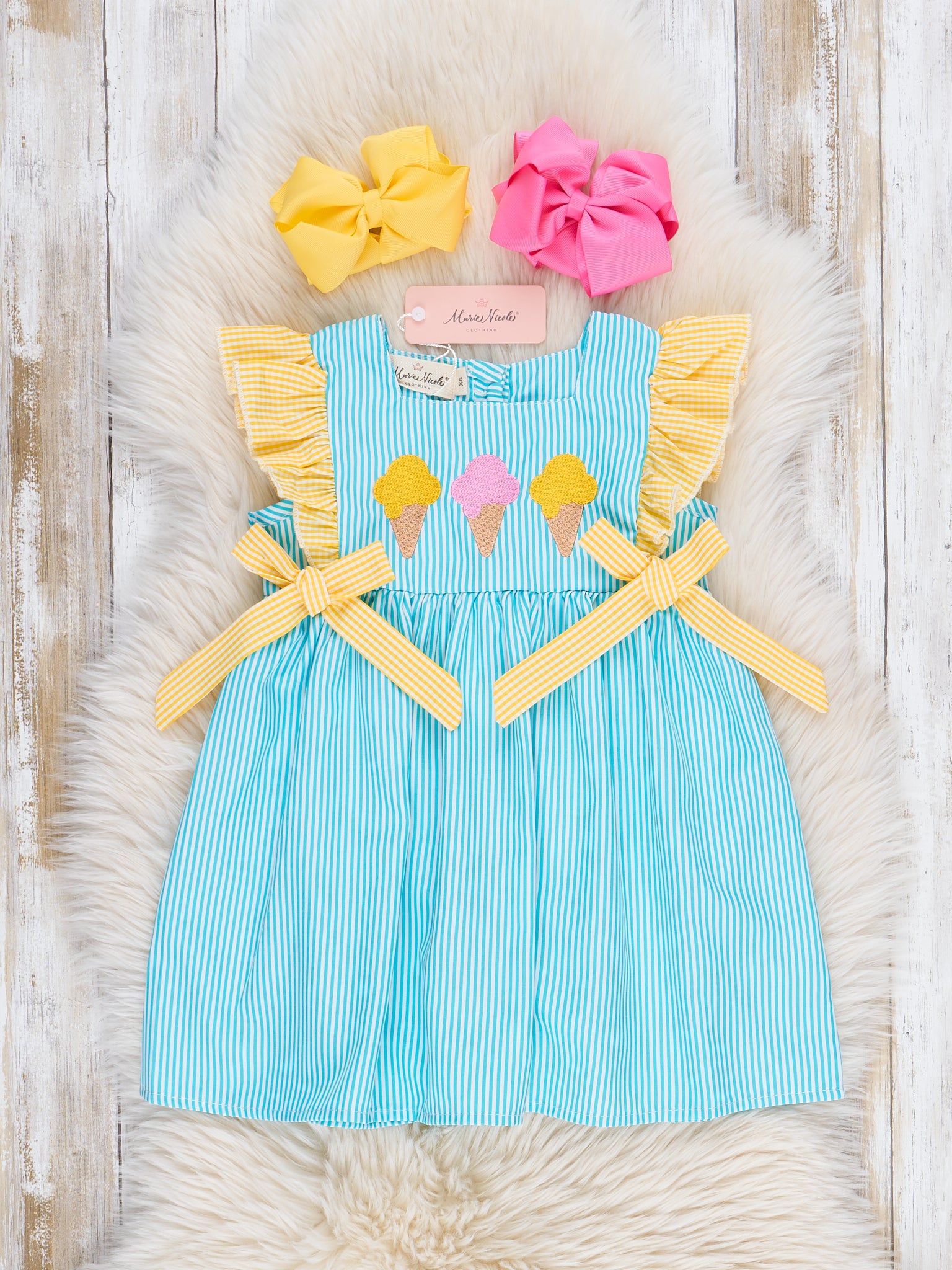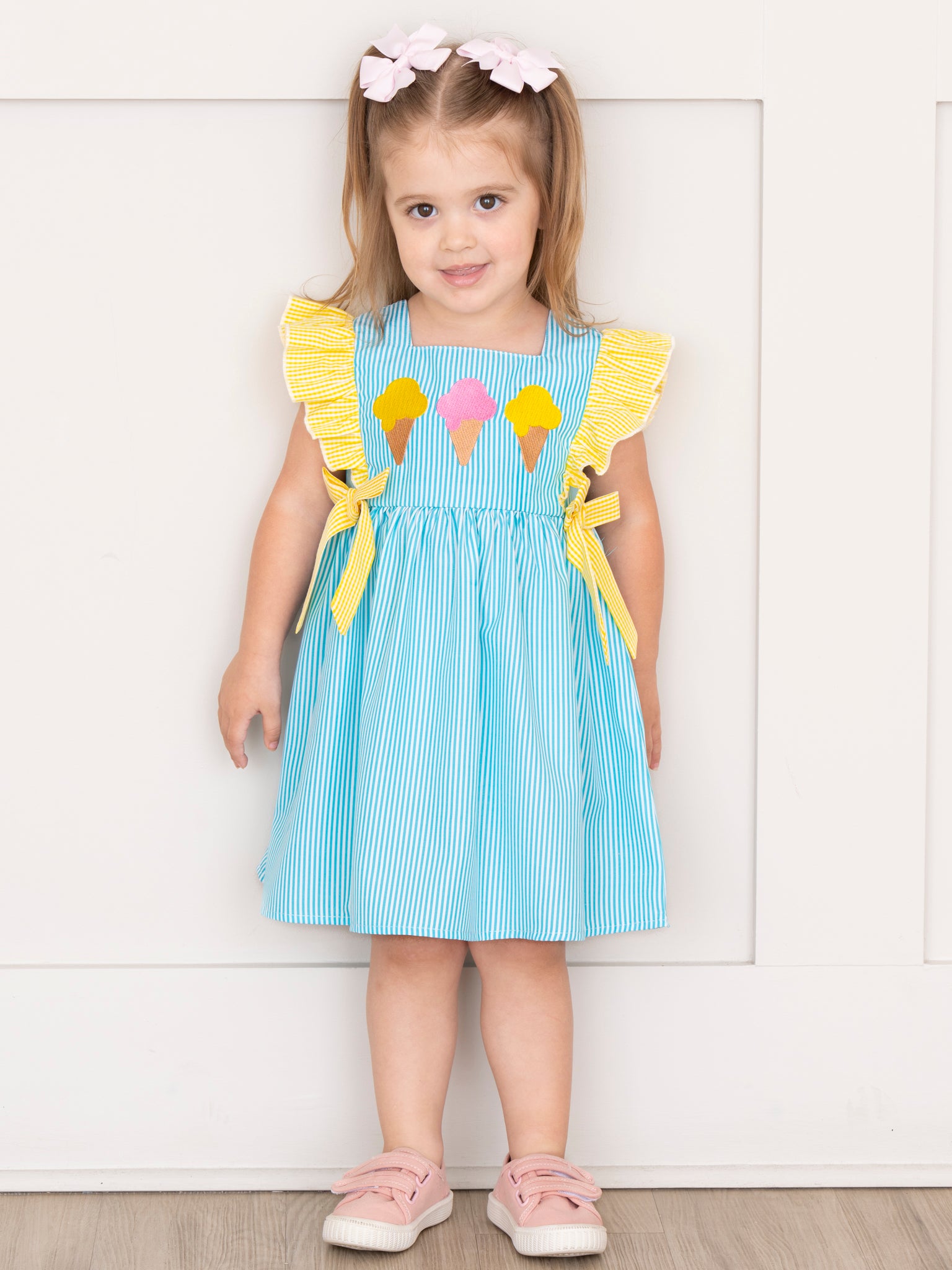 Brighten up summer days with the Neon Ice Cream Cones Ruffle Dress from Marie Nicole Clothing! This playful dress features fun ruffle detailing with embroidered ice cream cones that scream sweet summer fun. Made from soft, breathable cotton, it’s perfect for keeping little ones cool and comfy on sunny adventures.