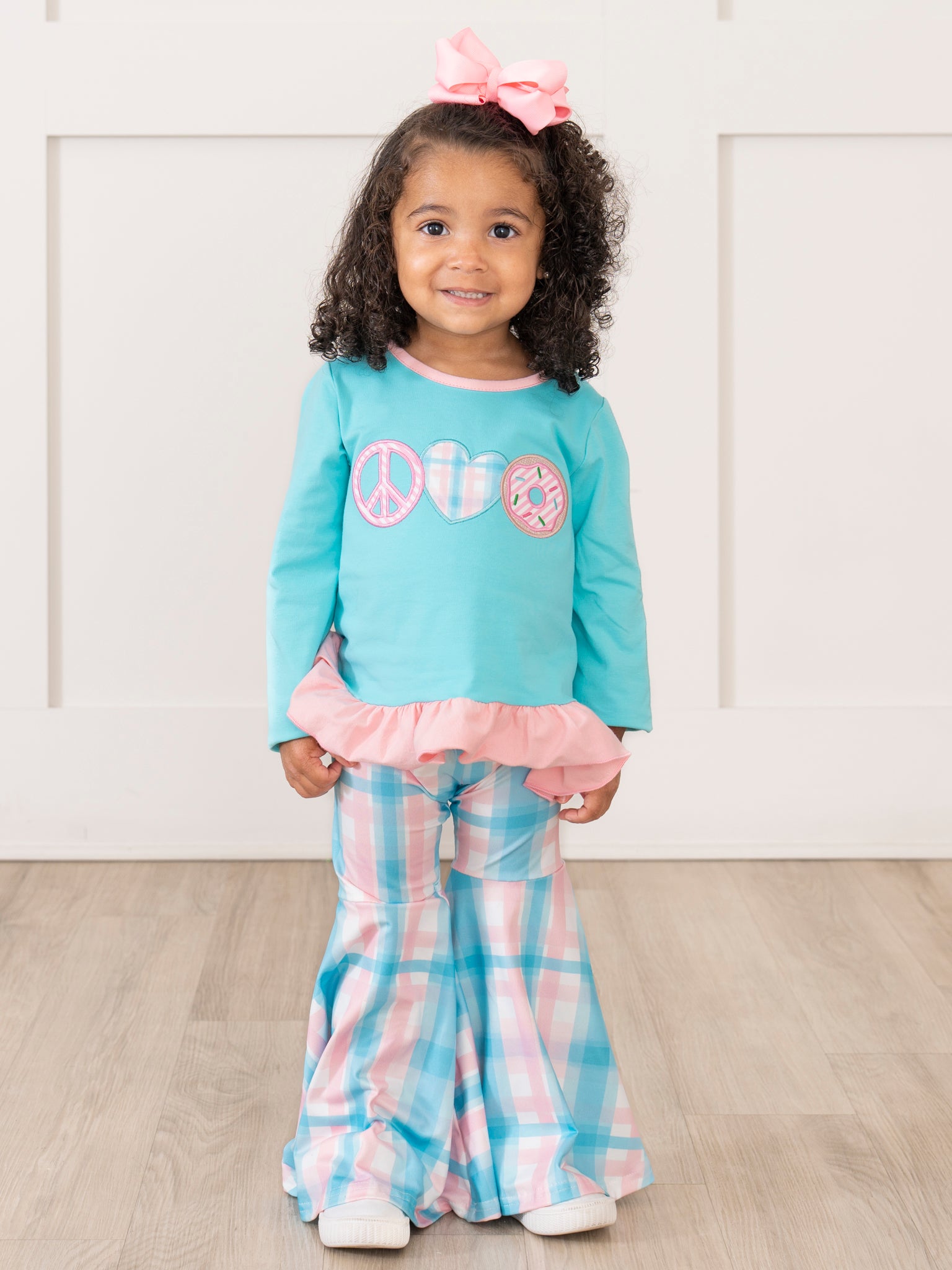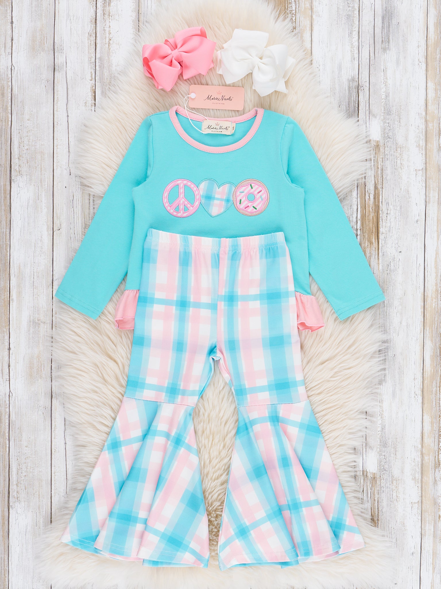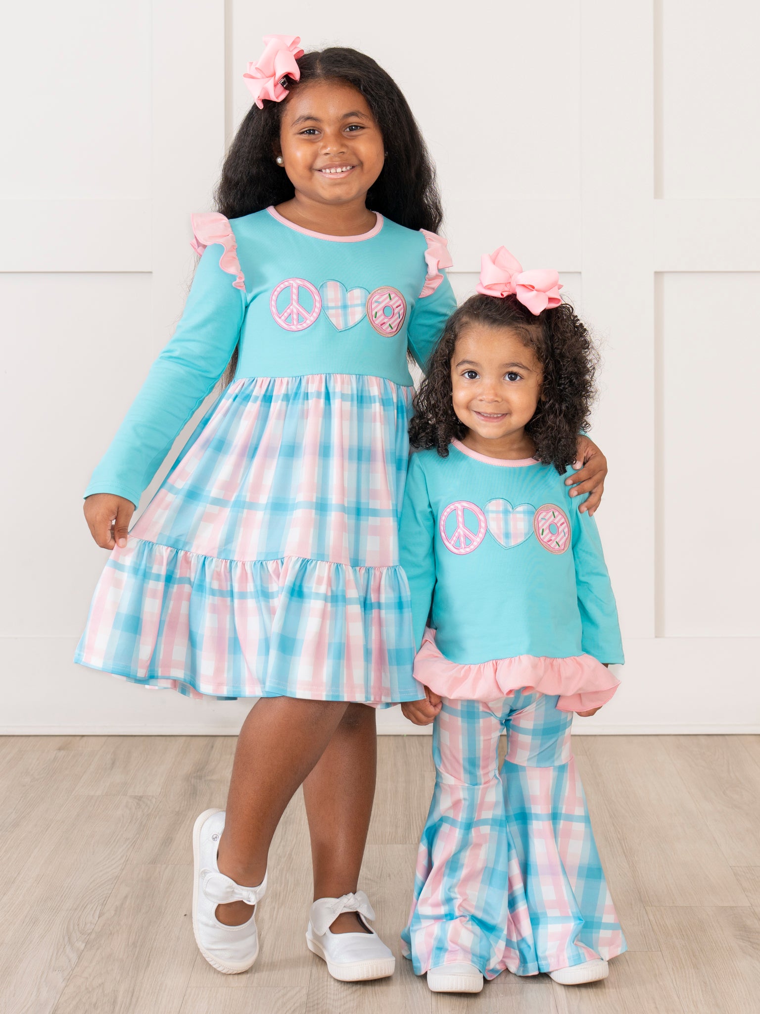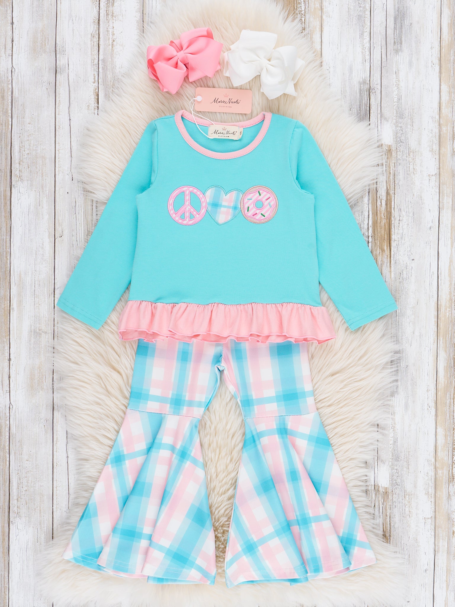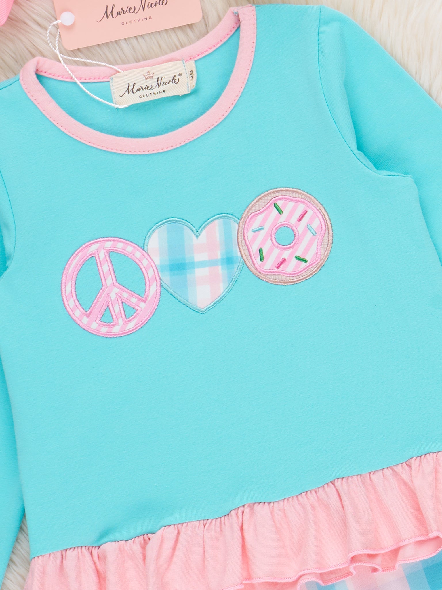 The Peace Love Donuts Ruffle Outfit is a playful and sweet choice that’s perfect for everyday adventures and cheerful moments. Featuring charming designs of peace signs, hearts, and donuts, this outfit from Marie Nicole Clothing blends whimsical fun with cozy comfort. Made from breathable, lightweight fabric and finished with soft ruffle details, it’s ideal for playdates, family outings, and picture-perfect smiles