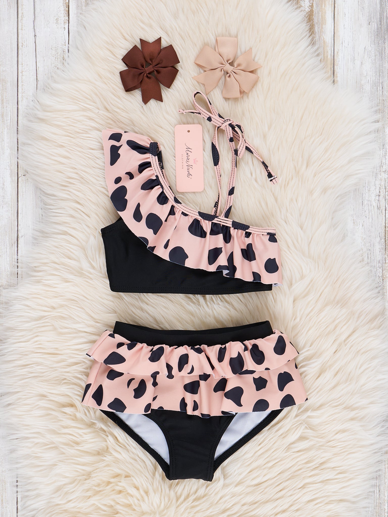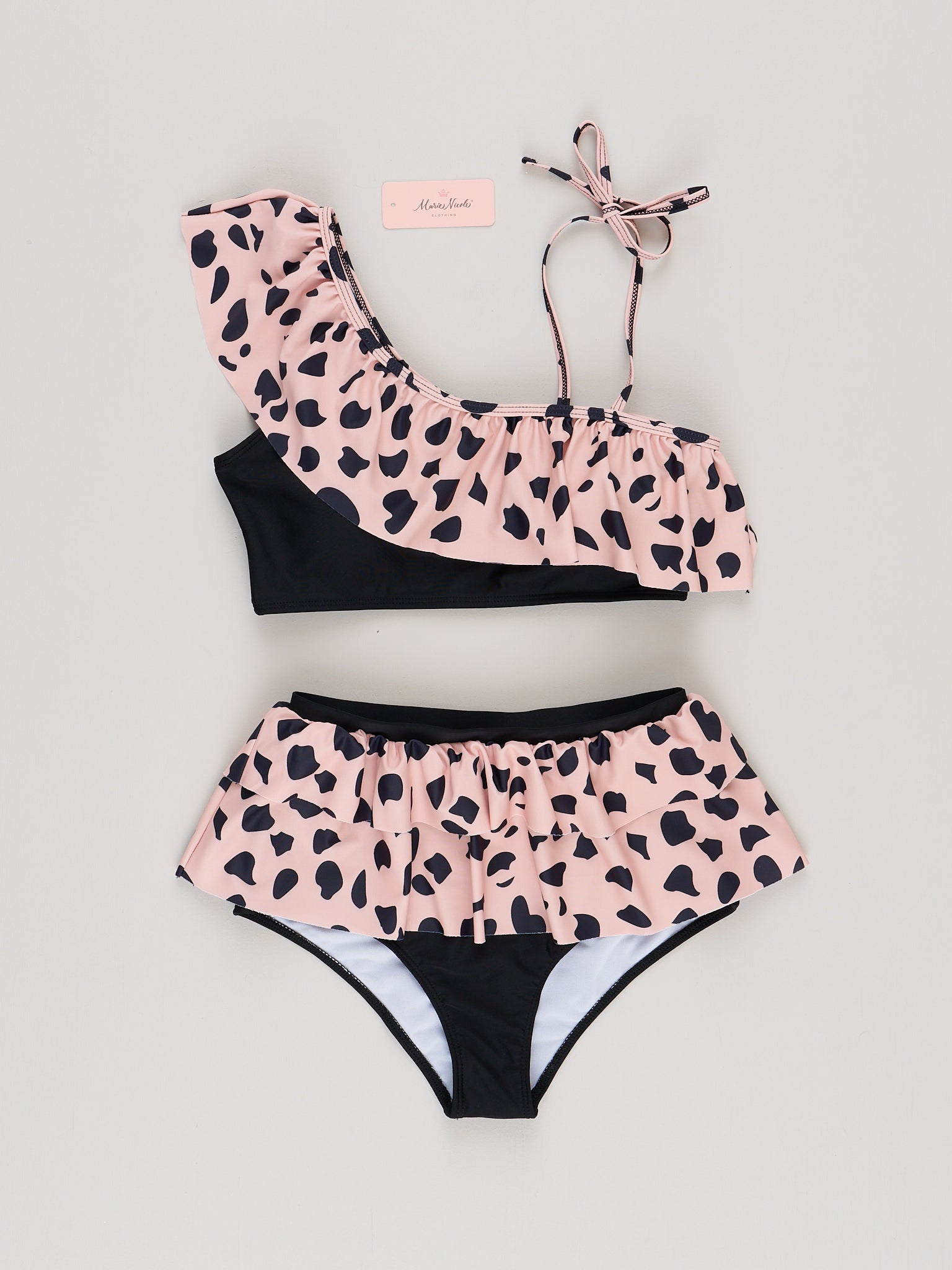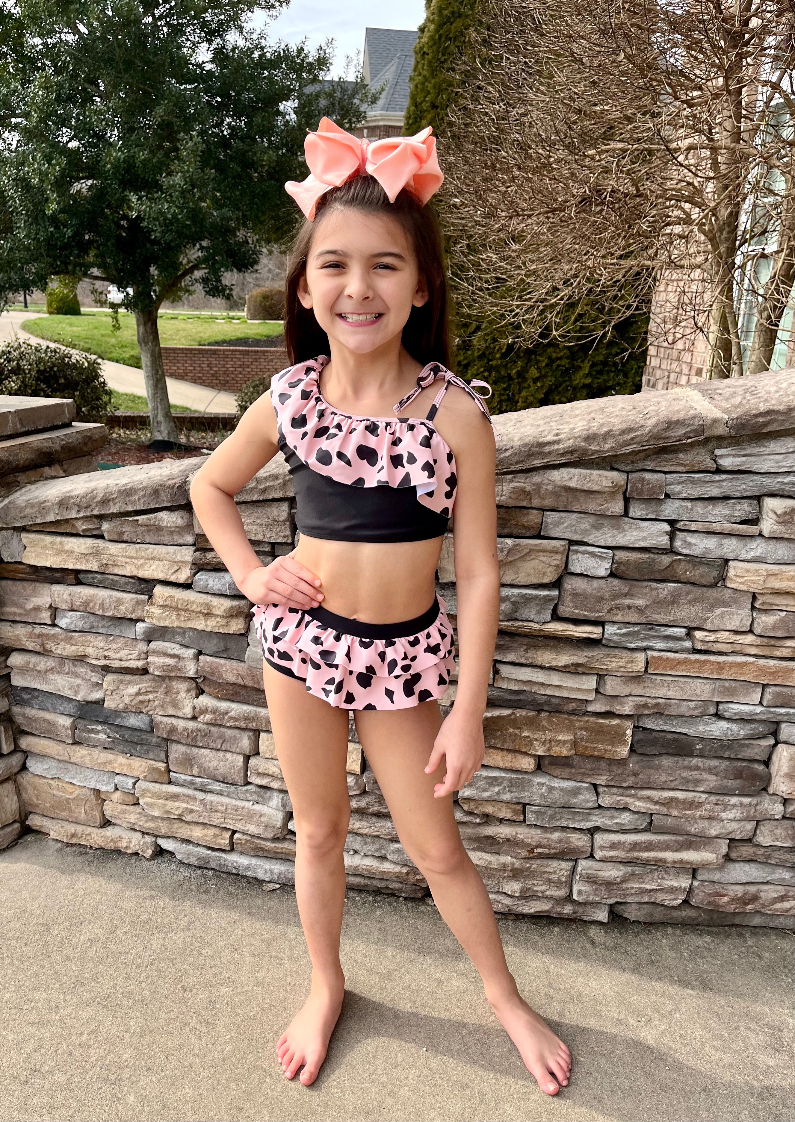 Mom & me styles are the purr-fect choice for a fashionable mother-daughter duo! This two-piece asymmetrical bikini features an eye-catching cheetah ruffle print and tie straps, so you and your mini-me can show off your wild side. Unleash your fierce fashion senses and turn heads with Mom & Me!