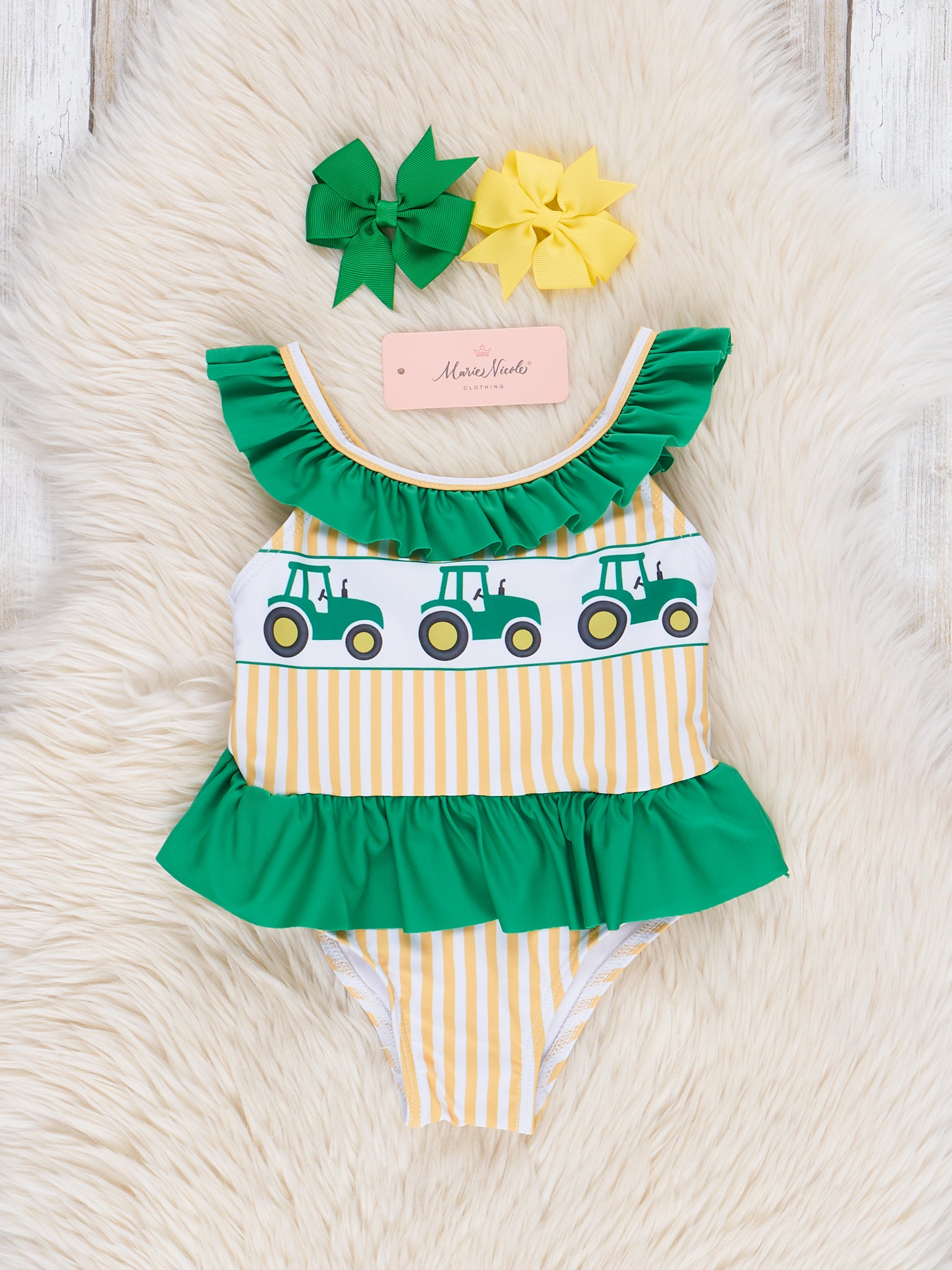 Green & Yellow Striped Tractors One-Piece Swimsuit