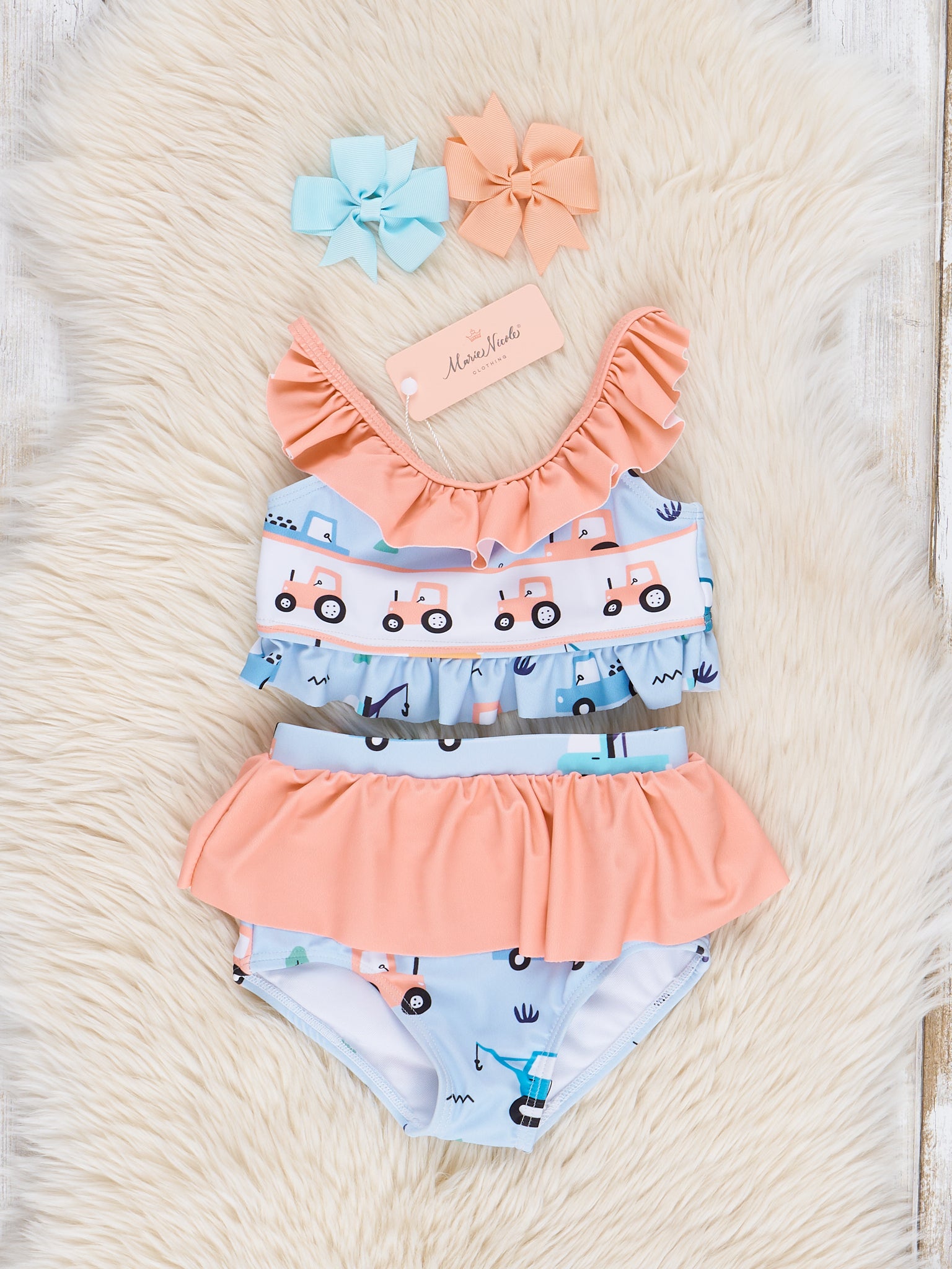 Green & Yellow Striped Tractors Two-Piece Swimsuit