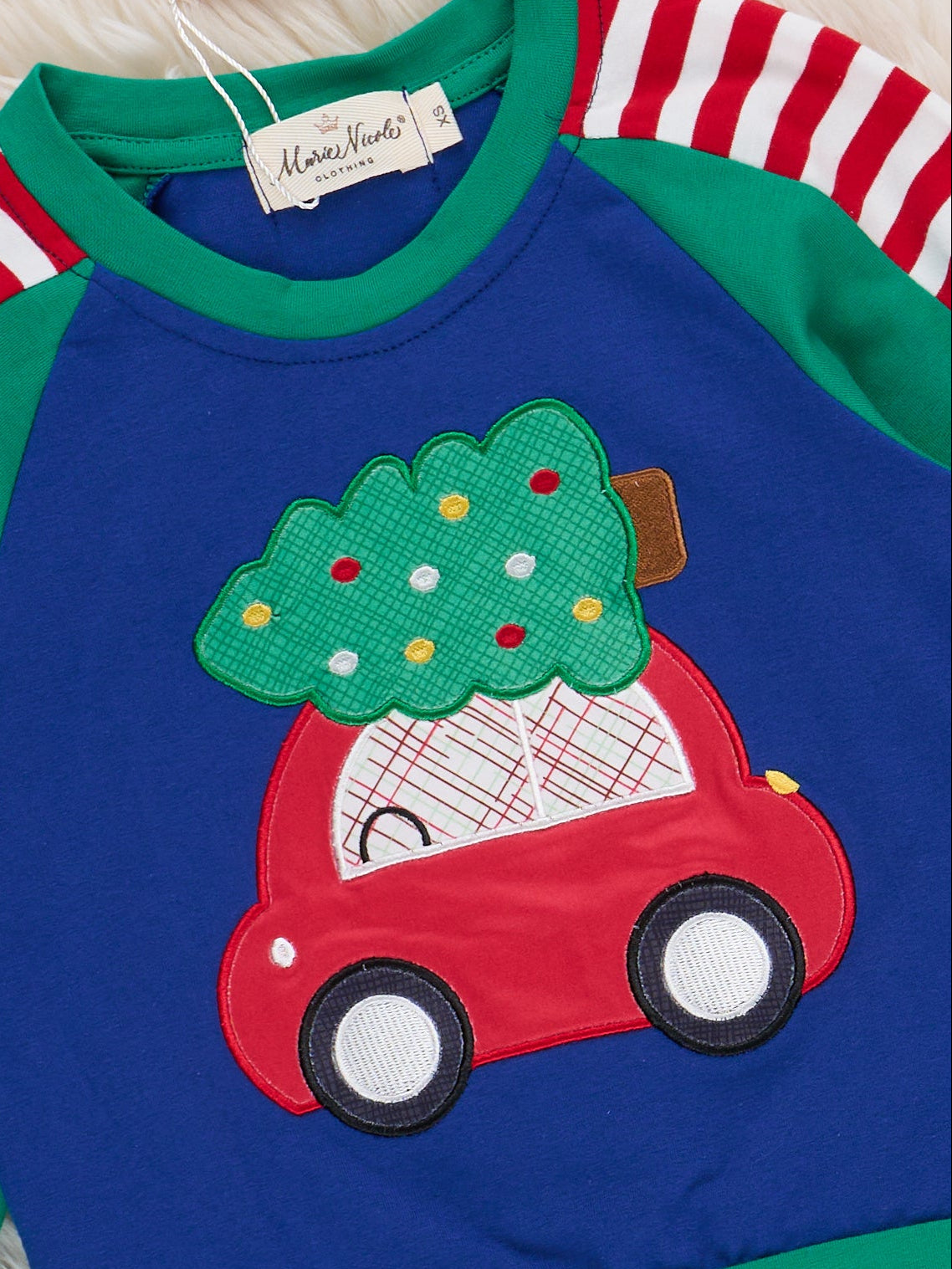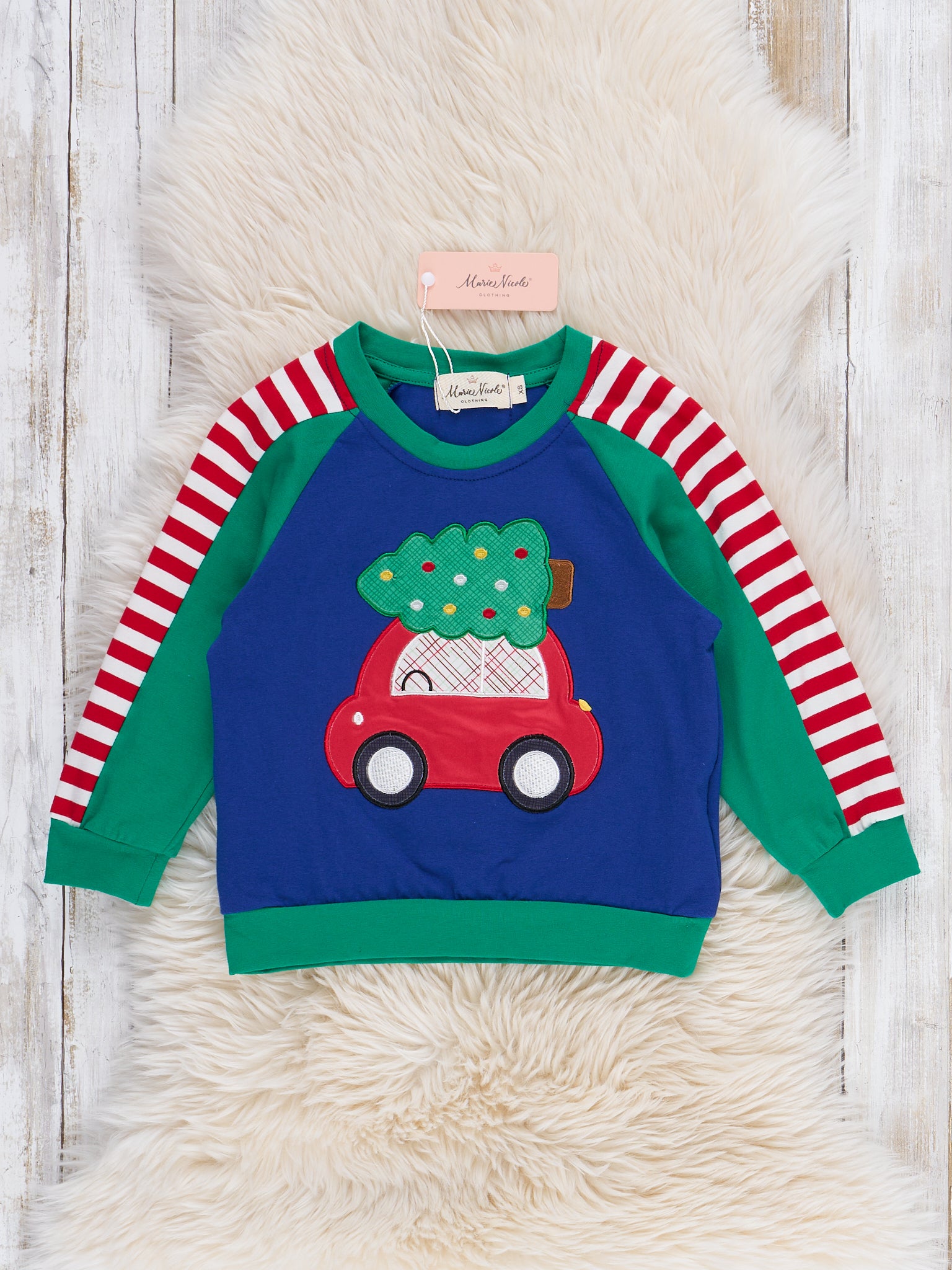 The Christmas Tree Delivery Embroidered Shirt by Marie Nicole features an appliqued car carrying a festive tree on the front, with playful contrasting sleeves for added charm. Crafted for warmth and comfort, this long sleeve shirt brings a cheerful touch to holiday outings and everyday seasonal fun.