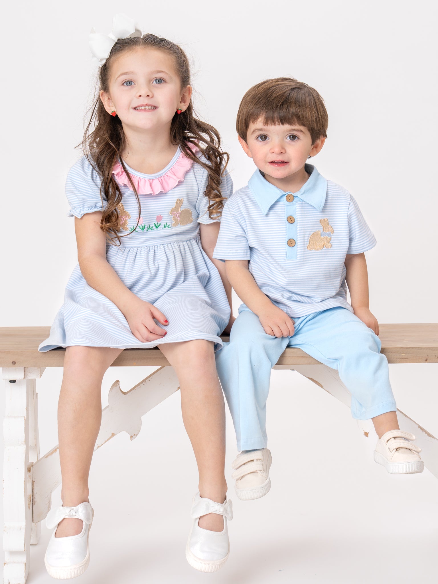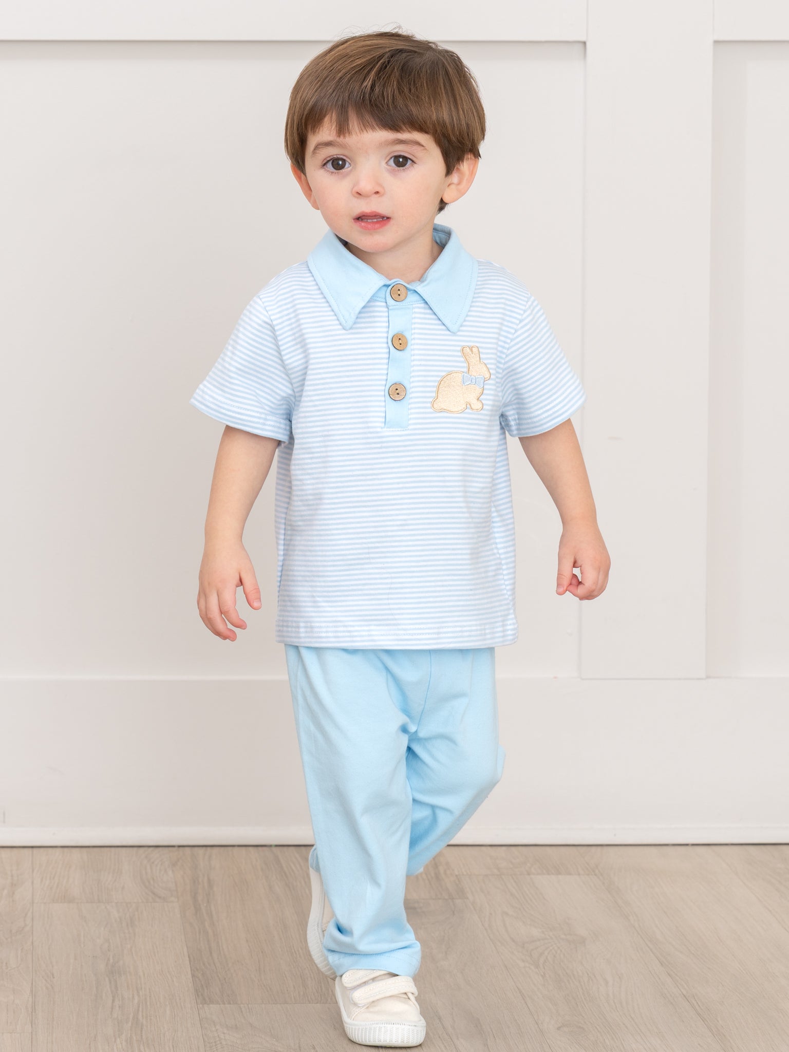 Picnic Hop Embroidered Cotton Outfit by Marie Nicole Clothing. This set features a short sleeve, buttoned polo-style top with pale stripes and a contrasting collar, accented by a small bunny embroidery, paired with matching solid pants for a polished, spring-ready look.
