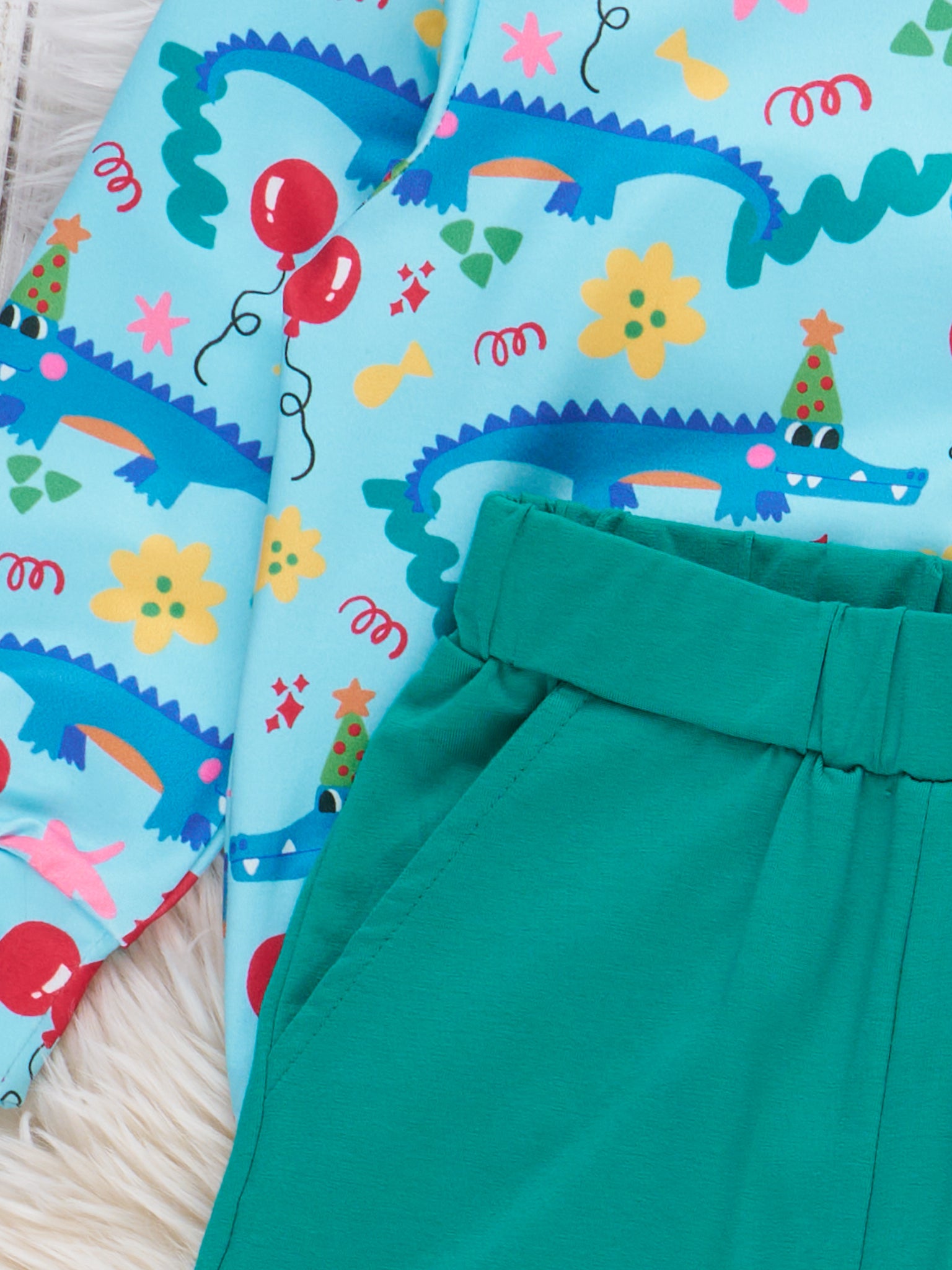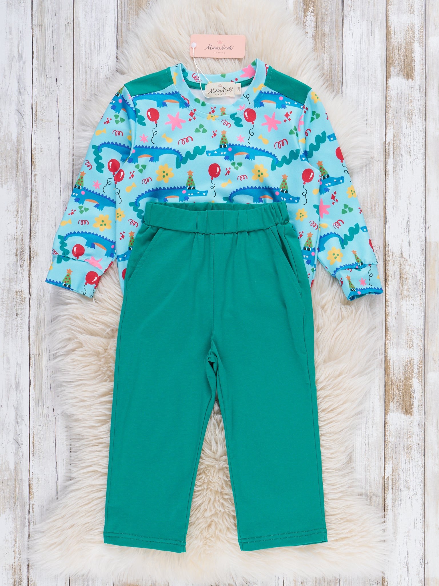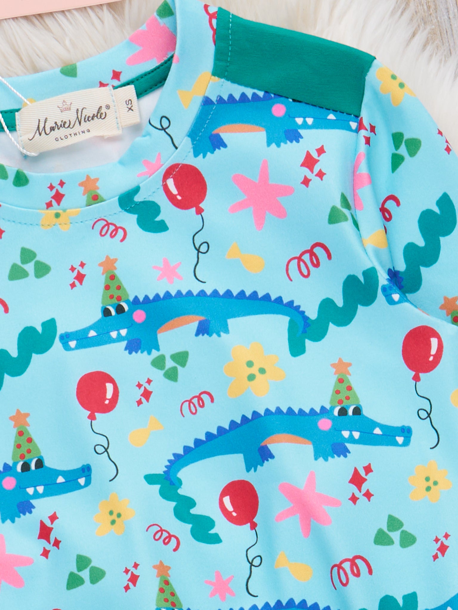 The Splashy Gator Birthday Outfit boasts a lively print top paired with easy-fitting pants, making it an ideal choice for energetic, playful days and casual outings. Thoughtfully designed by Marie Nicole Clothing, this set blends whimsical patterns of parties and alligators with high-quality, comfortable materials so little adventurers can move freely, feel great, and look adorable in every moment.