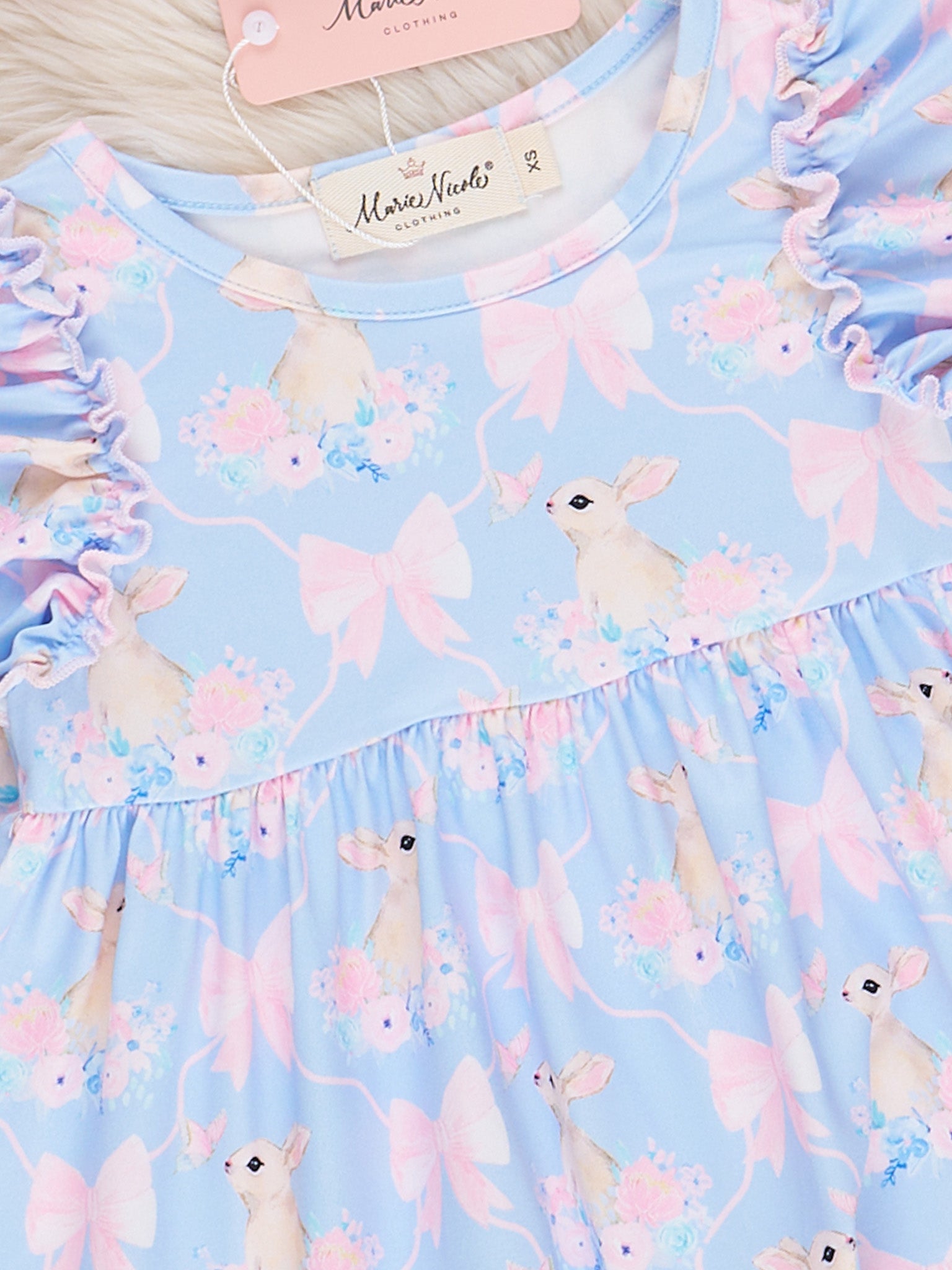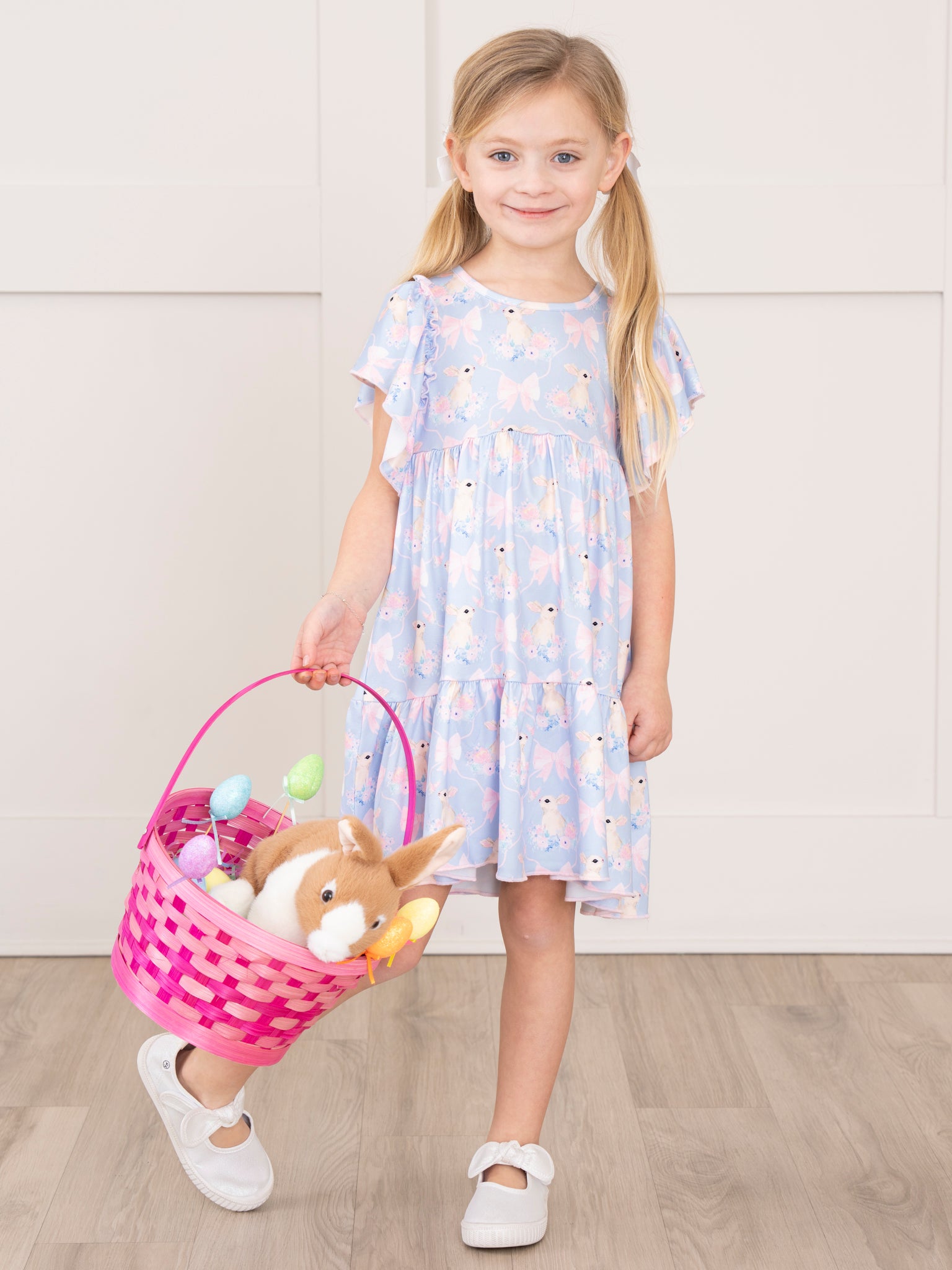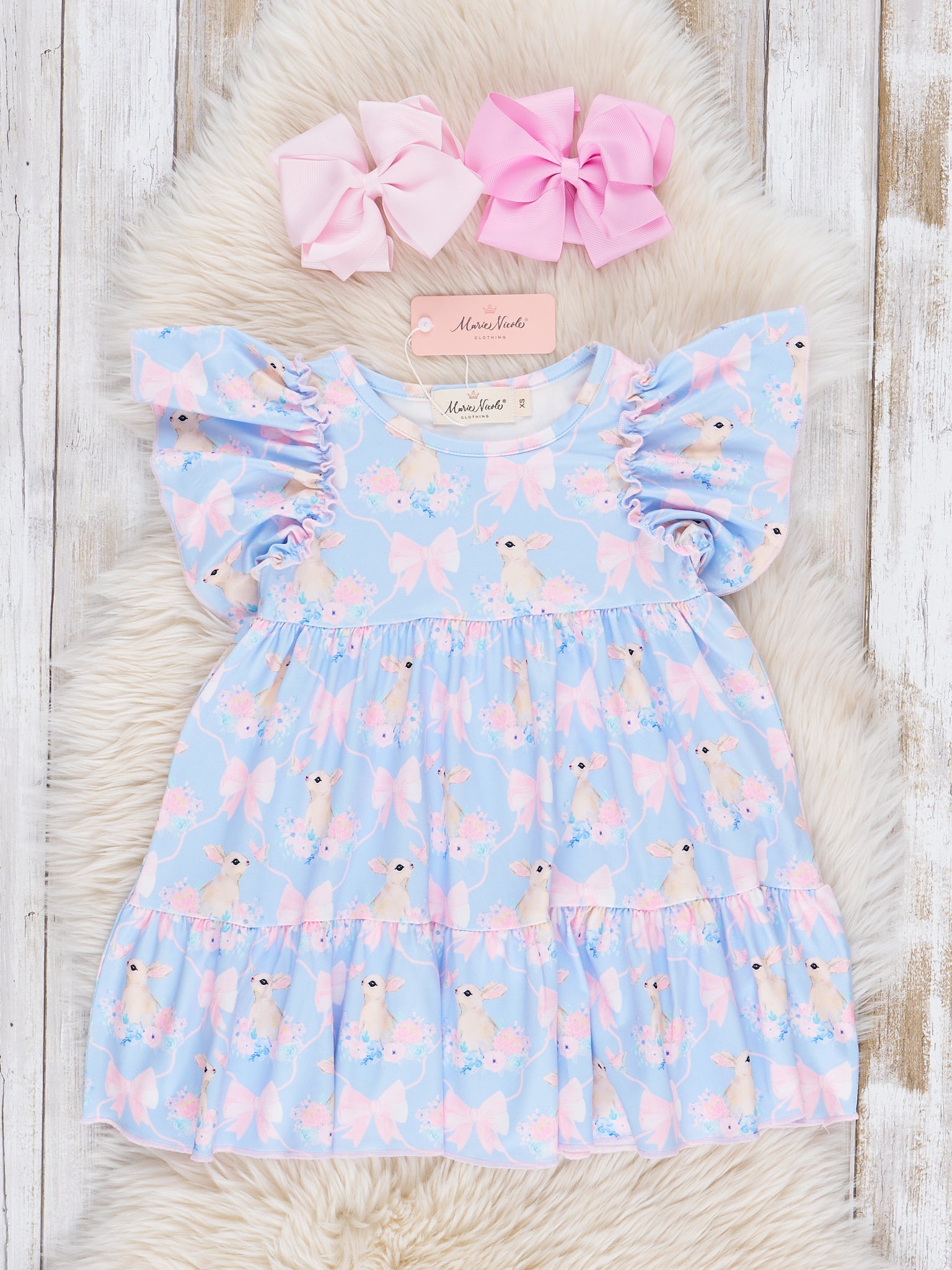 Hop into spring with this adorable Cornflower Blue Bunnies & Bows Dress by Marie Nicole Clothing! This dress is perfect for Easter and features playful pink bows with bunnies print and delicate ruffle shoulders & hem for a sweet and charming look. This quirky and fun dress lets your little one hop, skip, and jump in style.