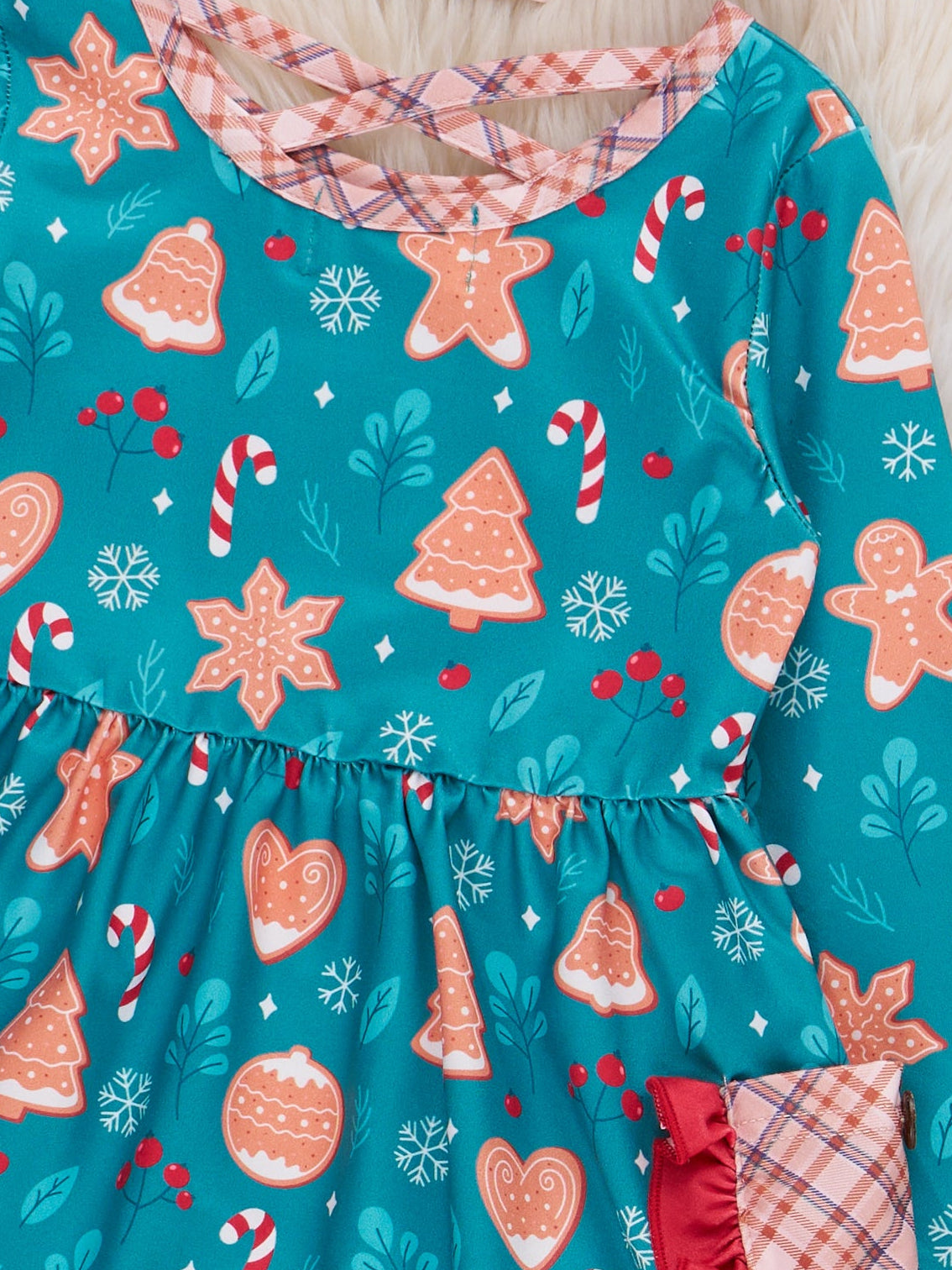 The Gingerbread Festival Dress by Marie Nicole Clothing brings cozy Christmas charm with its whimsical cookie-themed print, playful patchwork pockets, and ruffled hem. Soft, comfortable fabric and sweet design details make this dress an ideal choice for festive gatherings and joyful winter celebrations.